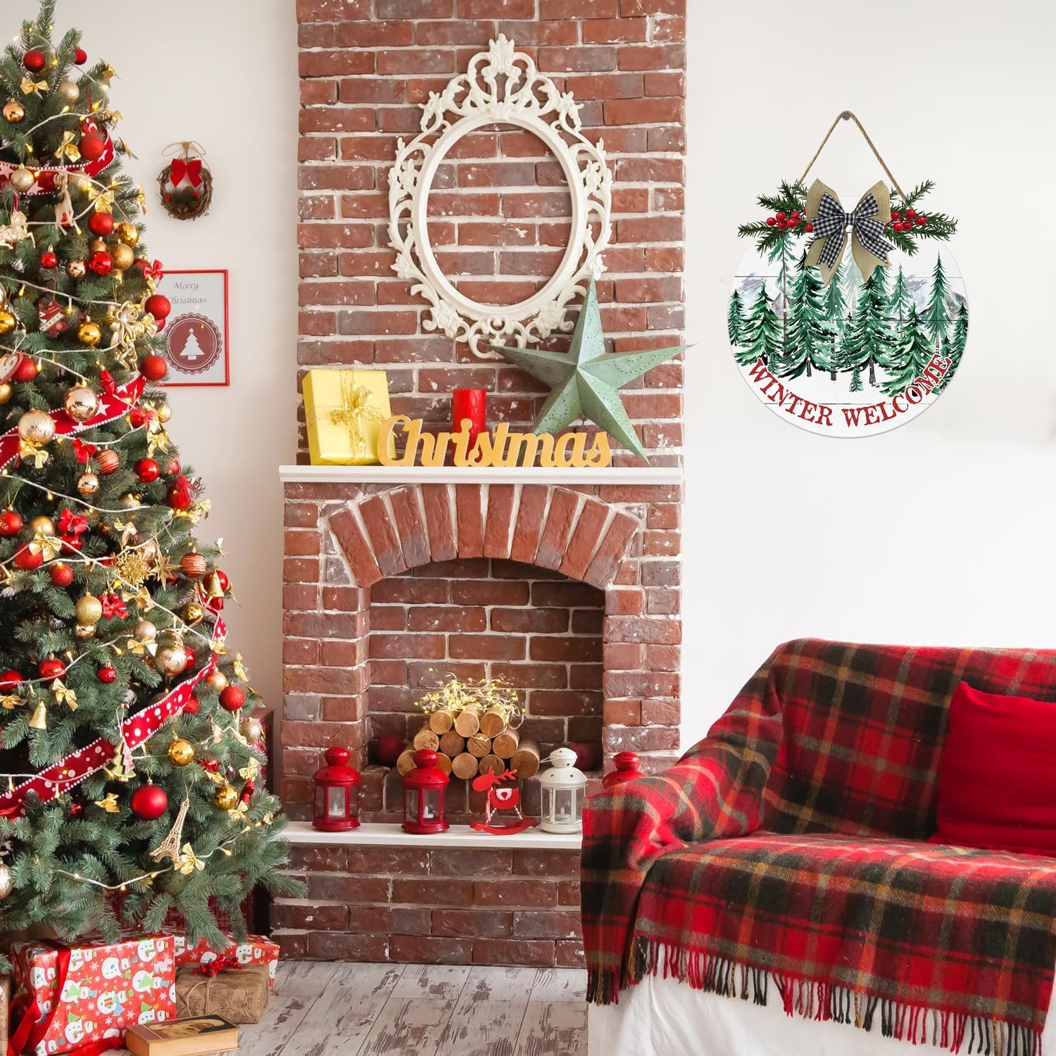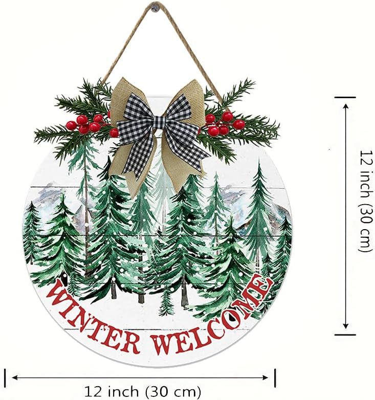 VELLOW Winter Front Door Welcome Sign, Merry Christmas Wooden Welcome Door Sign, Christmas Winter Pine Tree Welcome Wreath 12x12 inches