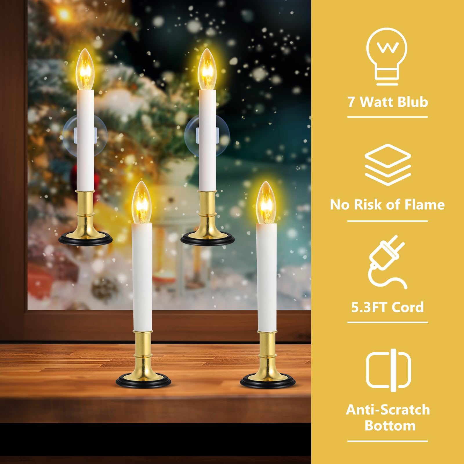 Verdenu 4 Pack Electric Christmas Window Candles, Window Candles with Sensor Dusk to Dawn Electric Corded, Brass Plated Electric Candles, Plug in Window Candle Light for Home/Christmas Decoration
