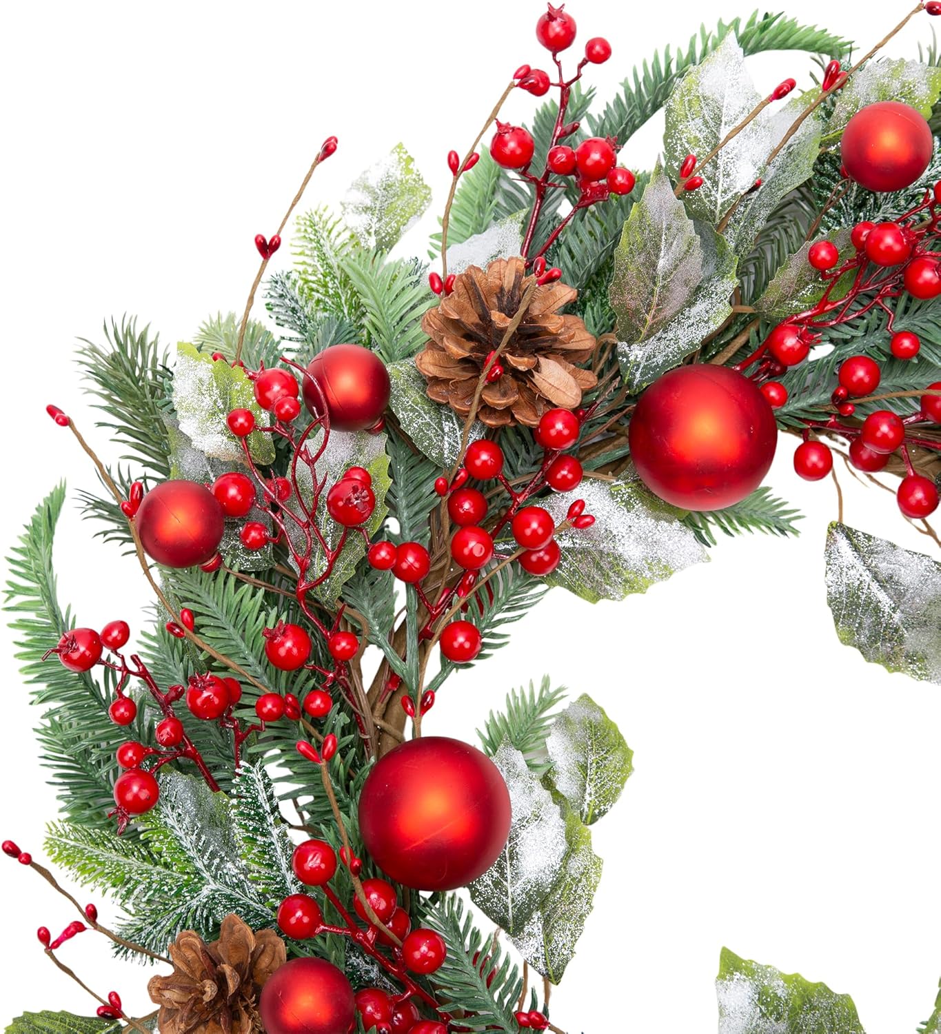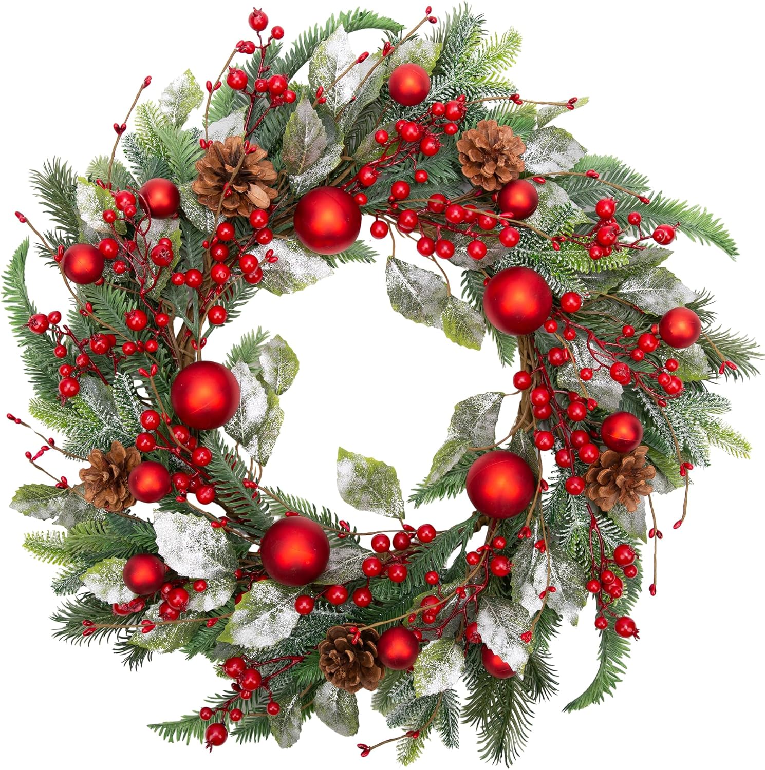 VGIA 20 Inch Christmas Wreath for Front Door Artificial Winter Wreath for Christmas Decor Xmas Wreath with Christmas Balls Pine Needles Pine Cone for Wall Window Holiday Decorations