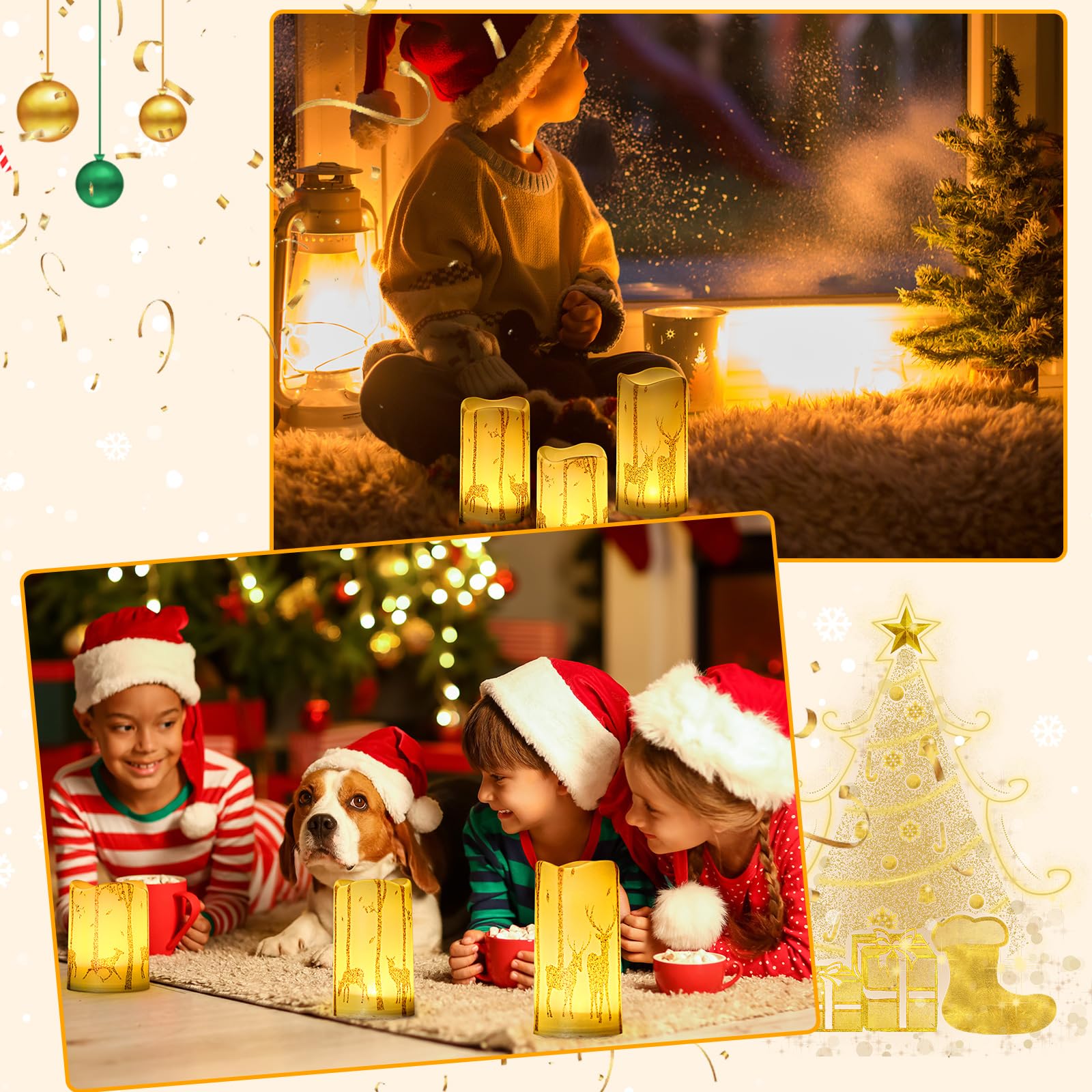 VIHOSE 3 Pcs Christmas Flameless Candles Decor Realistic Flickering Candle Battery Operated Real Wax LED Pillar Candles with Gold Deer Decal Warm Light for Christmas Home Decor