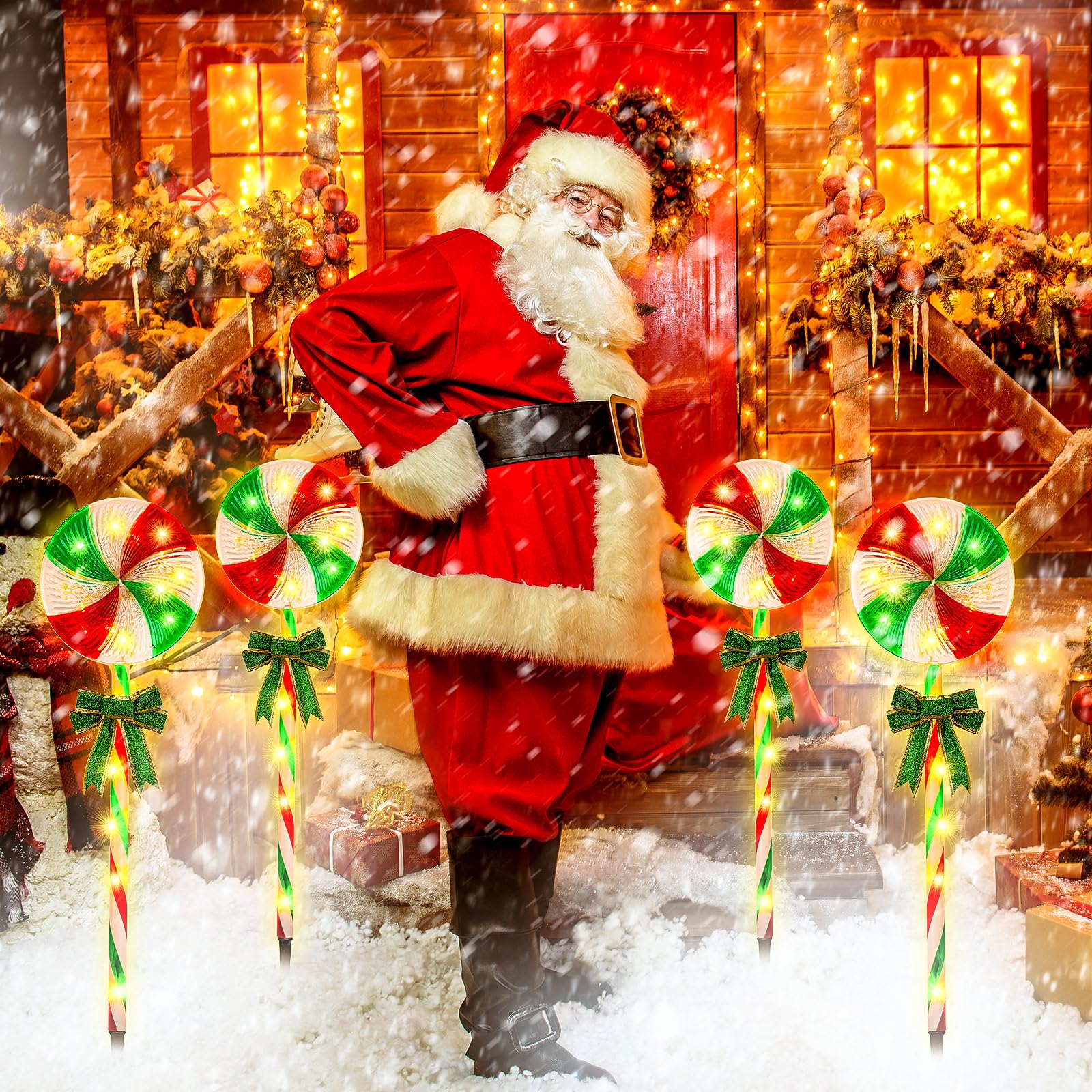 Fascinating Christmas Pathway Decorations: the package comes with 8 pieces of peppermint pathway lights with green bows, equipped with 8 ground plugs Each each lollipop light is equipped with 80 high brightness LED beads, with rich Christmas elements, giving you vivid visual enjoyment Sturdy Material and Dimension Details: these 4 in 1 pathway Christmas lights are built from durable plastic that won't easily break, measuring about 27.5 inches tall and 7.1 inches wide with a distance of 23.6 inches between each pathway light, offering sufficient space for individual placement to enhance your Christmas