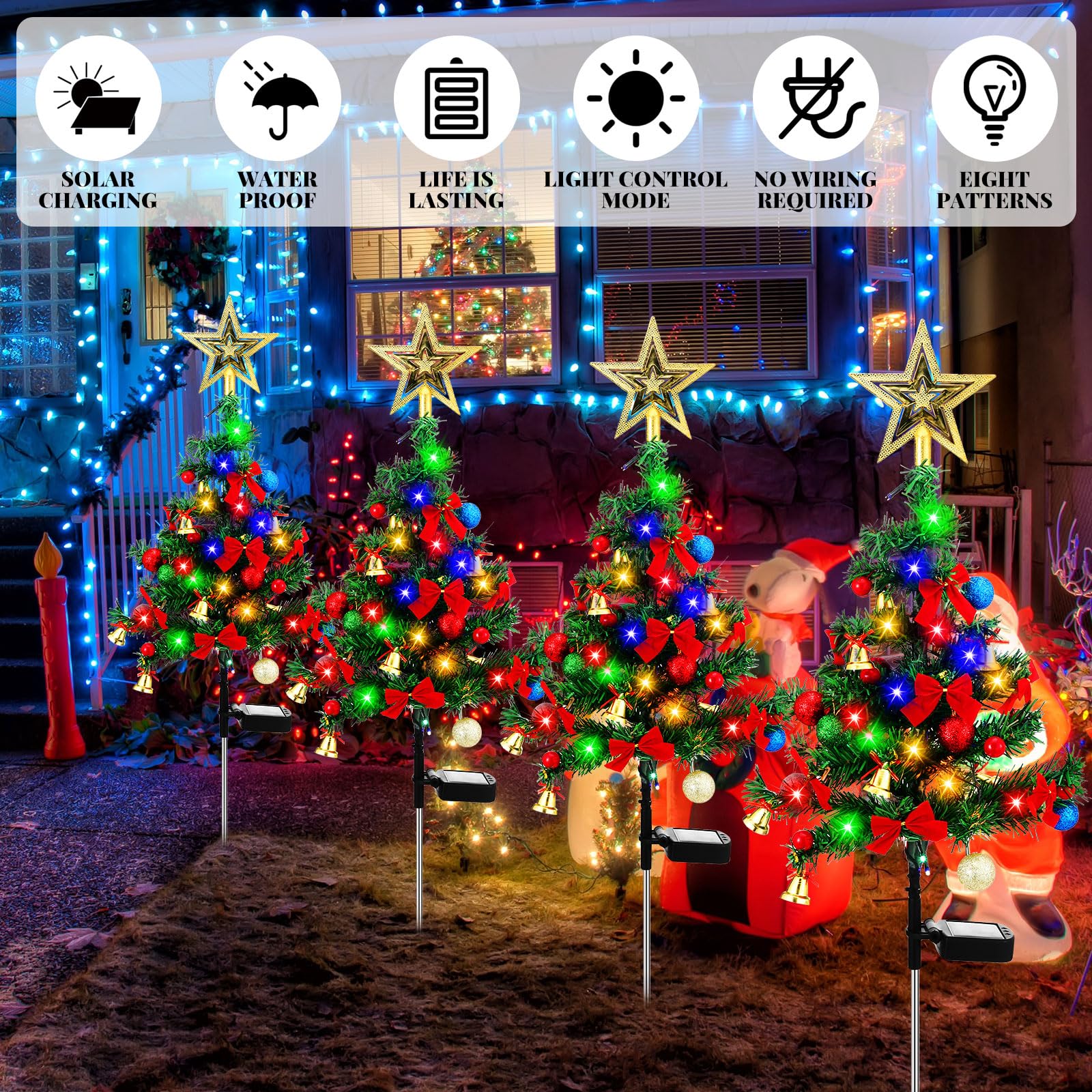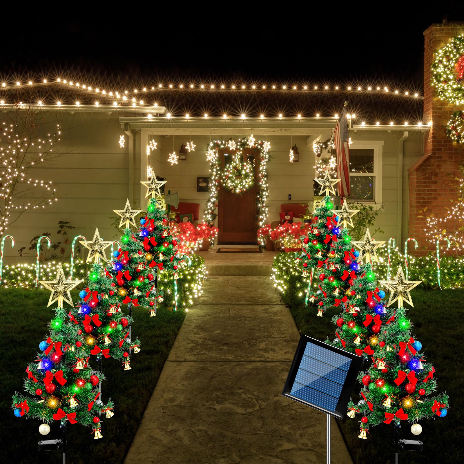 8 Set Christmas Solar Tree Lights: there are 8 solar lawn trees, 20 colorful lights, Christmas tree style, accessories with 12 small bells, 4 packs of gold pastel balls in 6 colors and 6 pieces, 4 packs of 12 pieces of small red bows, 8 pieces of stars on the tree top, 8 packs of Christmas red fruits These multi quantity accessories meet your Christmas tree outdoor decoration needs and are the nice outdoor Christmas decorations Accessory Size Information: the Xmas pathway tree decor with ground plugs has a total length of 31.5 inches In the accessories, the star on the tree top is 6 inches long, the Christmas red fruit is 3 inches long, the bow size is 2.4 inches, and each golden pastel ball is 1.6 inches in size