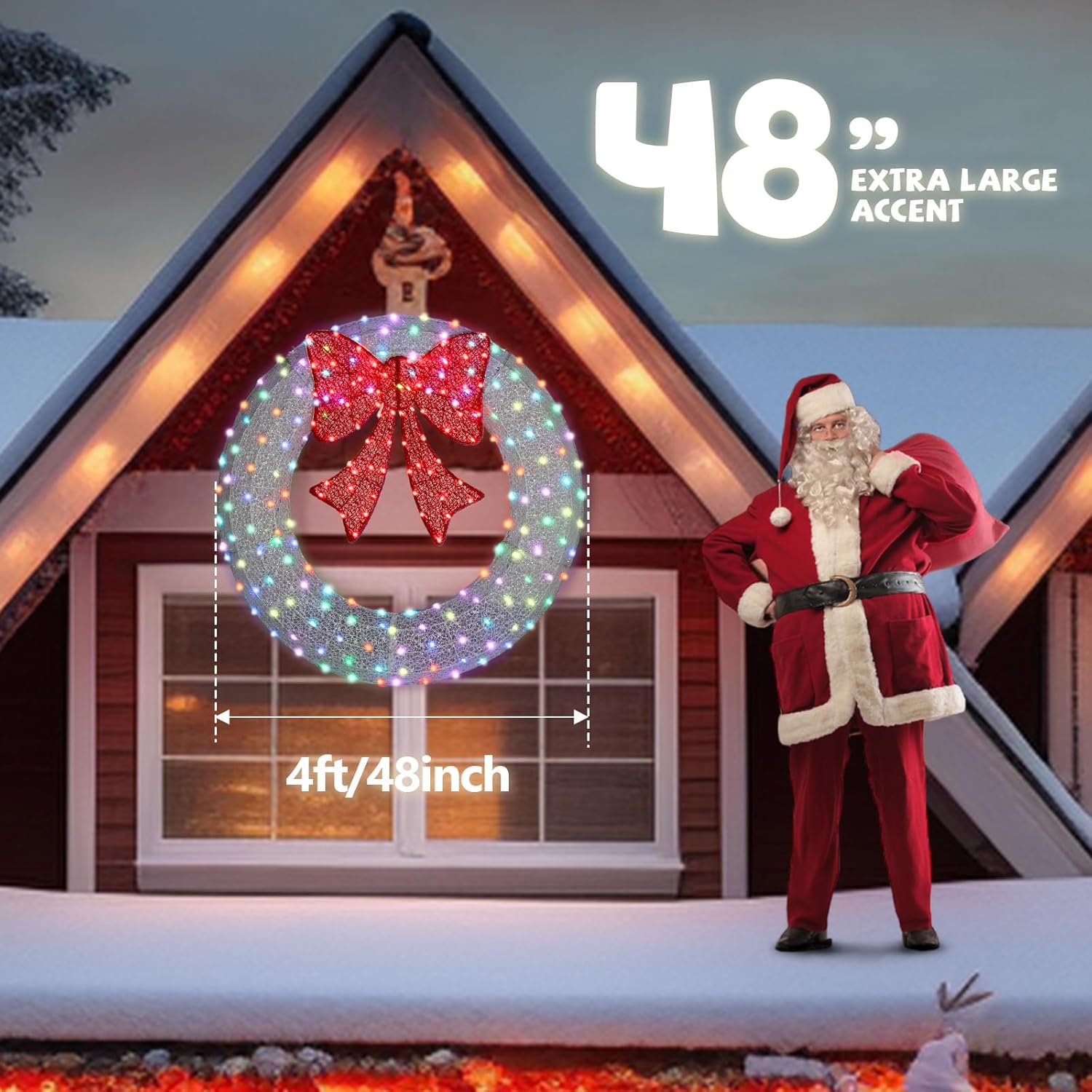 VINGLI 48 Inch Pre-lit Large Christmas Wreath with 224 LED Multi-Color Lights, Christmas Door Wreath for Garage, Outdoor Christmas Wreath with Red Bow, Timer Remote Control, Plug-in, White
