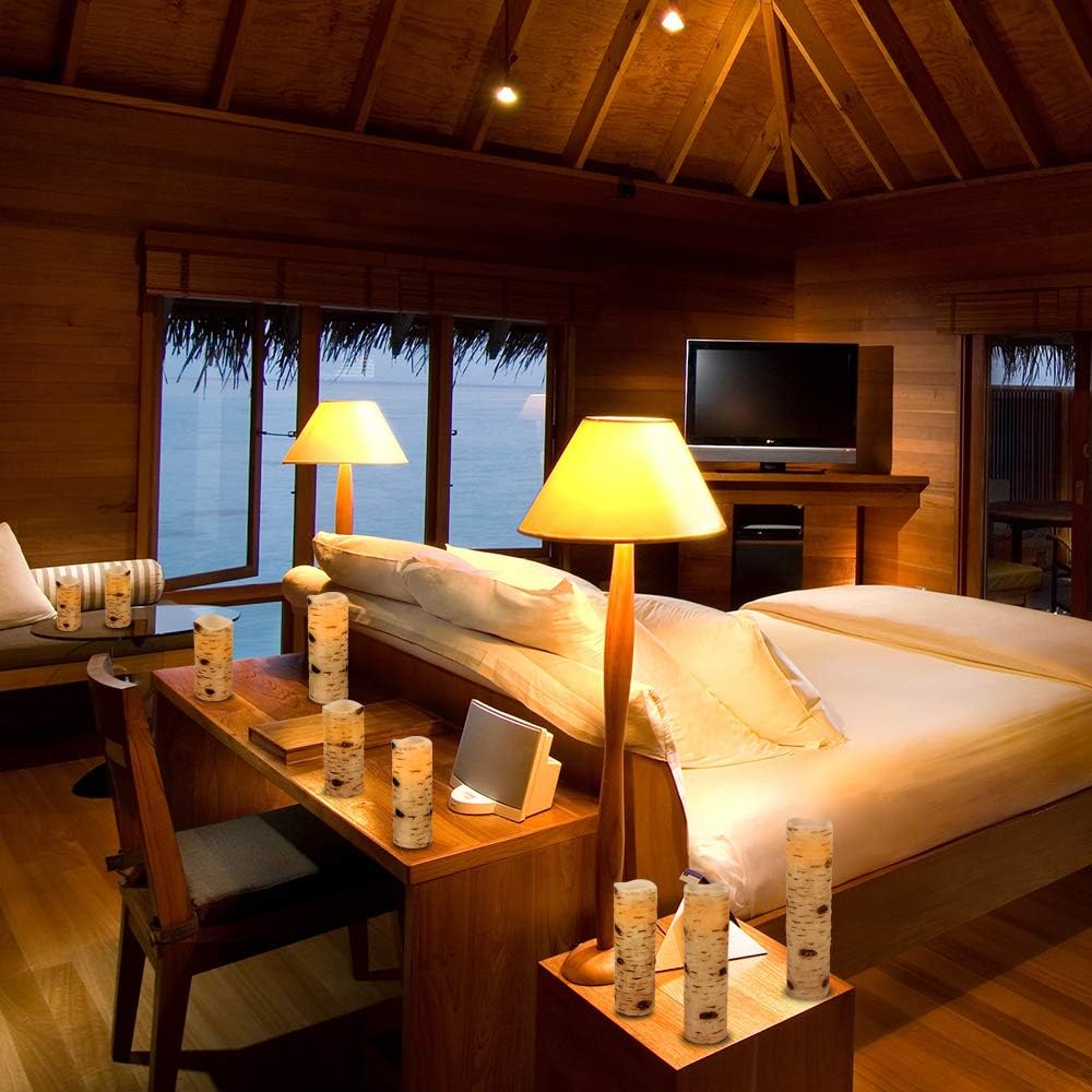 A COMPLETE SET OF FLAMELESS CANDLES: This value pack comes with 9 beautiful flameless pillar candles, 2 remote controls with 10 different keys and a super easy to follow operating manual. Specifically, this set includes two 4" pillars, two 5" pillar, two 6" pillar , a 7" pillar,a 8" pillar, a 9" pillar,(each 2.2" diameter) candle, all coming in an elegant birch bark effect ivory white color that matches any house. (Batteries are not included in this package.) ENERGY SAVING, POWERFUL LEDS: These impressive candles require 2AA batteries per candle, that are expected to last for about 150 hours, while the lifetime of the led lamps is up to 50,000 hours. Unlike real candles, these flameless pillar candles are made to last you buy them once, you have them forever