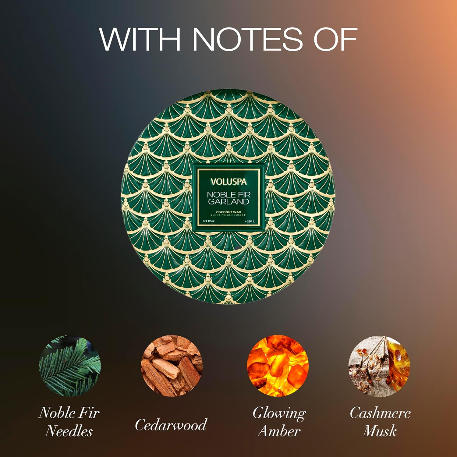 Voluspa Noble Fir Garland, 3 Wick Tin Candle, 12oz, 40 Hour Burn Time, Coconut Wax Candle for The Home, Poured in The USA