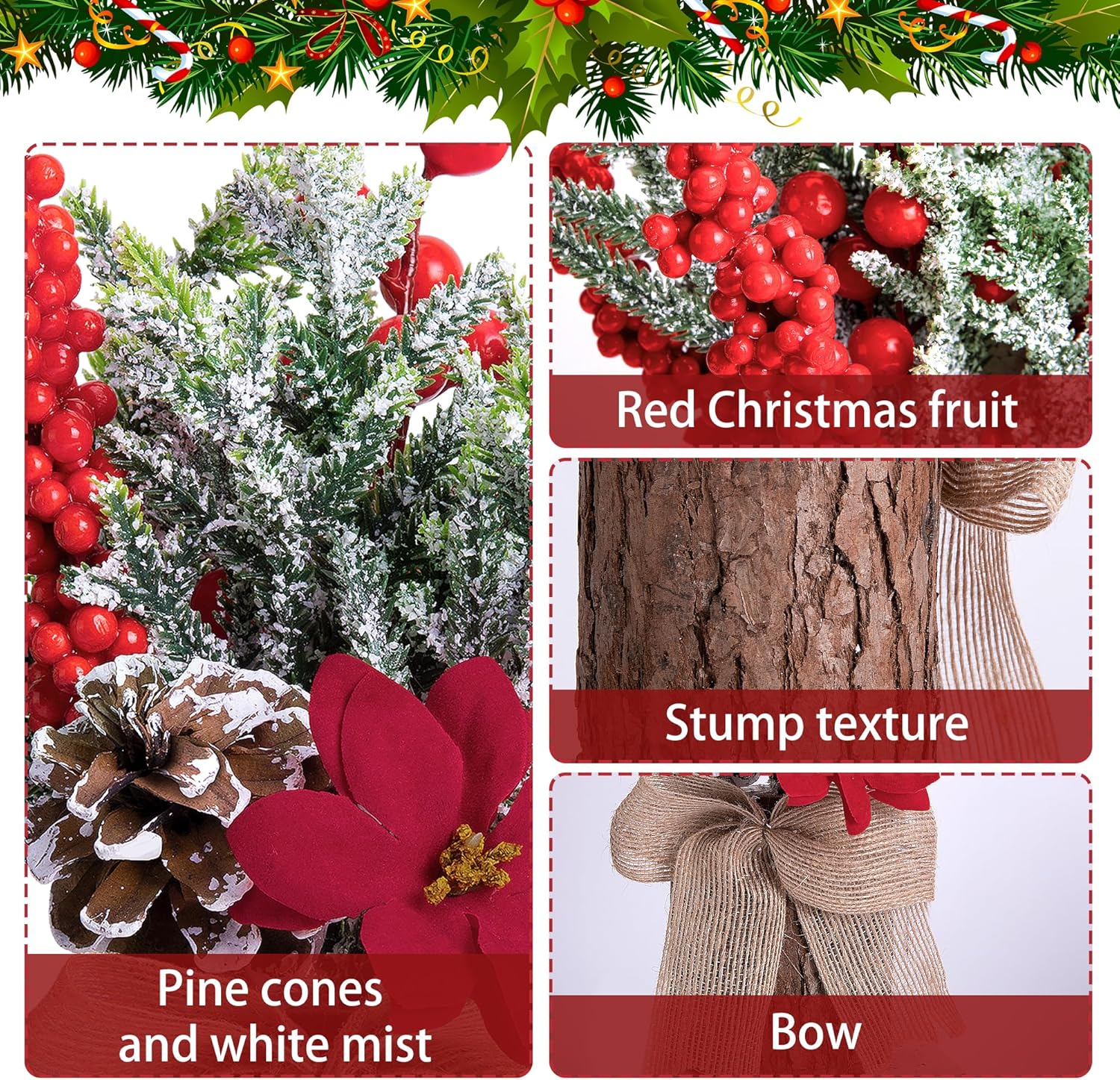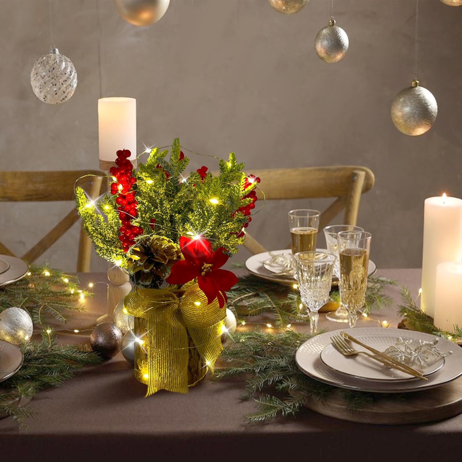 Watayo Artificial Burlap Small Christmas Tree Tabletop Decoration with Lights- 10" x 3" Mini Potted Christmas Tree Table Decoration with Red Berry Pine Cones for Home Room Mantel Party Xmas Decor