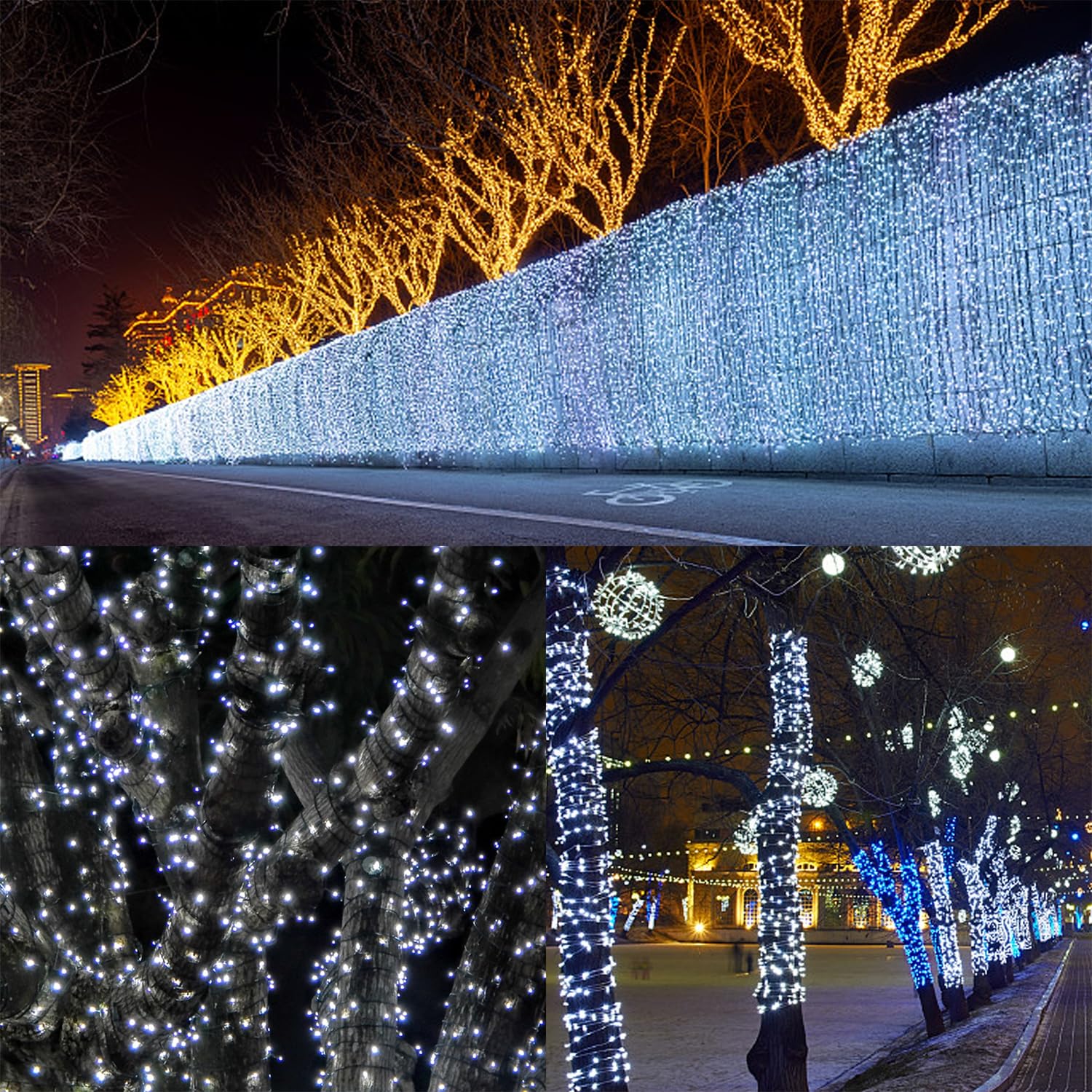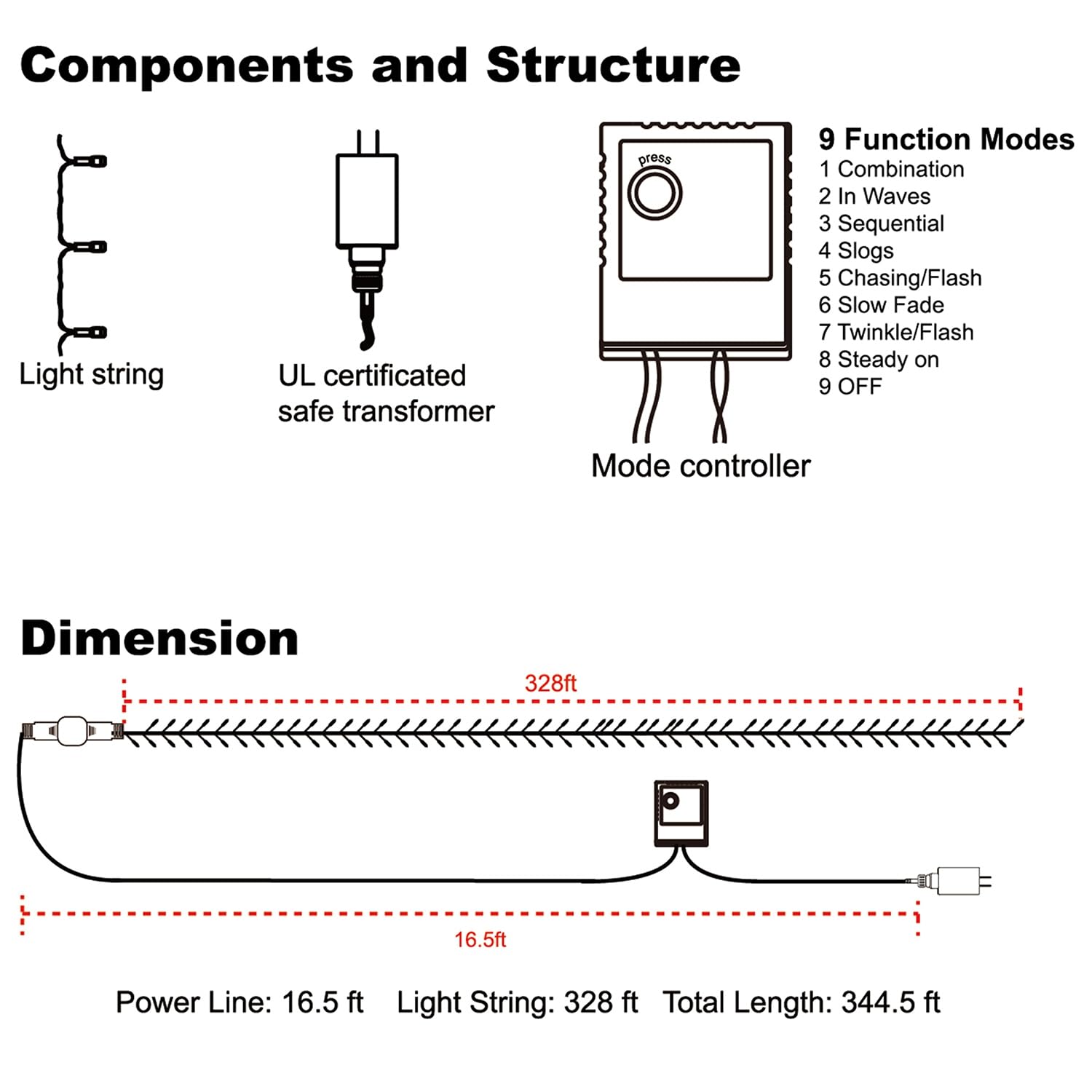 1000 LED Christmas Lights: Decorate with our 328ft Christmas cool white string lights with green wire, creates a warm festive atmosphere, surely lights up your room and house. A warm welcome sign at night to make your home a wonderful sight for your neighbors US standard outlet, voltage 110V. Adapter to the first LED light: 16.5ft. Total length (include leading line): 344.5ft 8 Lighting Modes: This holiday decorative string light has 8 lighting modes for you to choose: combination, in waves, sequential, slogs, chasing/flash, slow fade, twinkle/flash, and steady on. Fit different occasions and environment, adjust the lighting modes by using remote control or pressing the round button on the black mode controller box