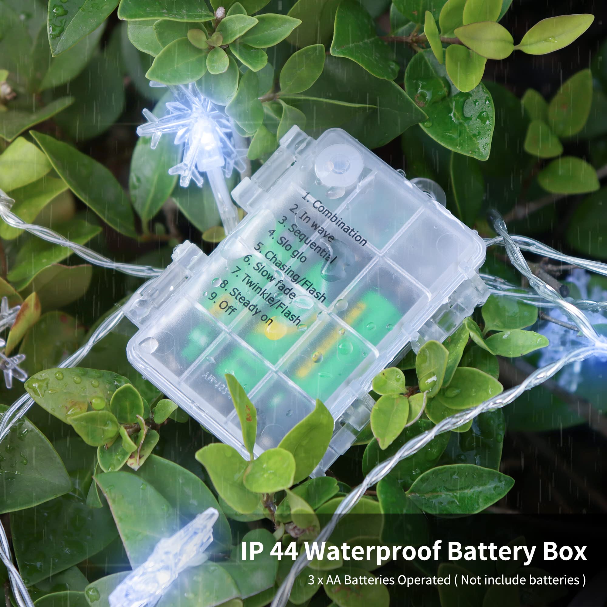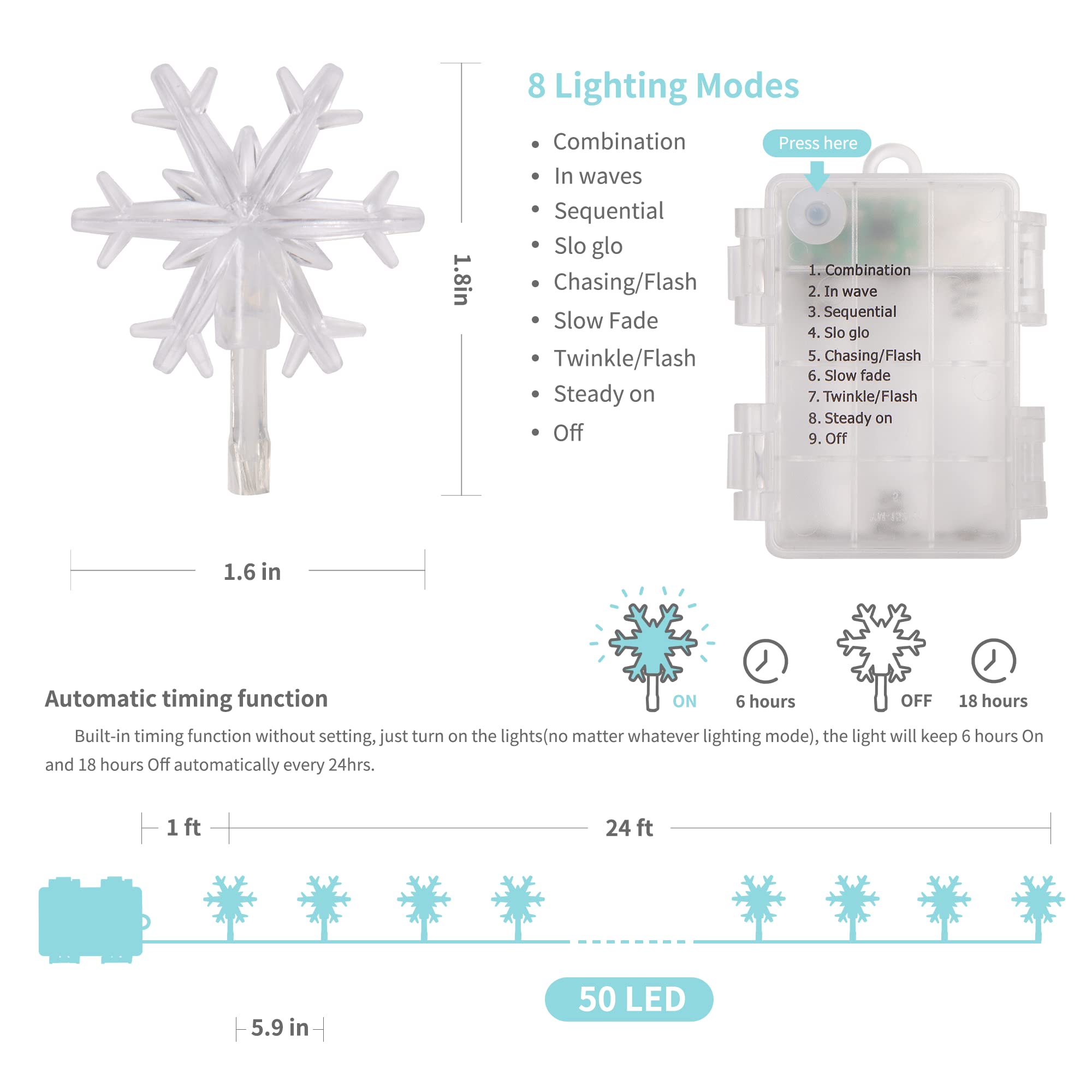 WATERGLIDE 2 Pack Christmas Snowflakes Lights, 50LED 24FT Outdoor Xmas Decorative String Lights, 8 Lighting Modes & Timer, Battery Operated Waterproof for Bedroom Party Garden Home Decor, Cool White