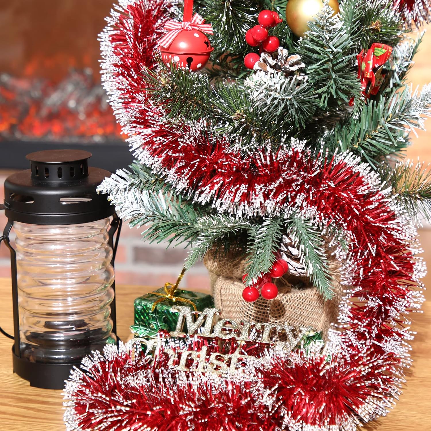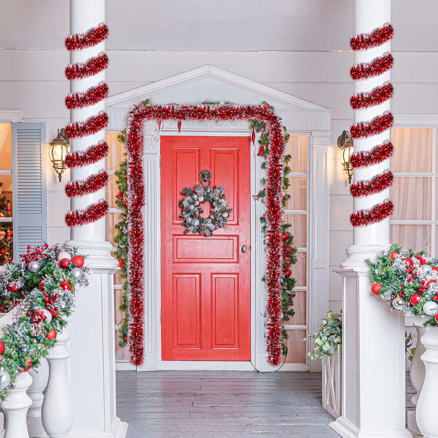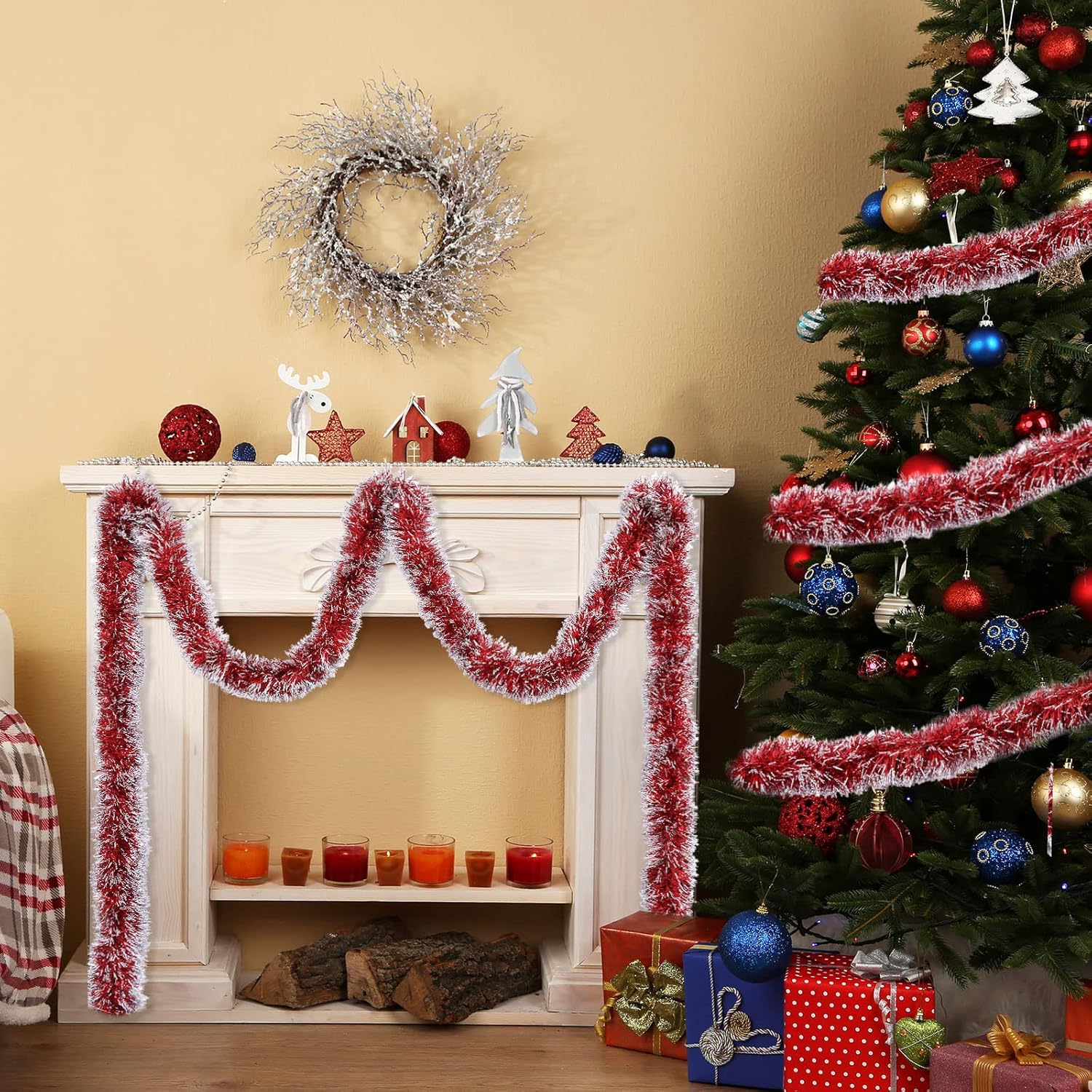 Waydress 4 Pcs Red Tinsel Garland Christmas Tree Decoration Streamer White Snow Metallic Garland Xmas Tree Hanging Streamers for Party Supplies Indoor Outdoor Decor, 3.5 Inch Wide