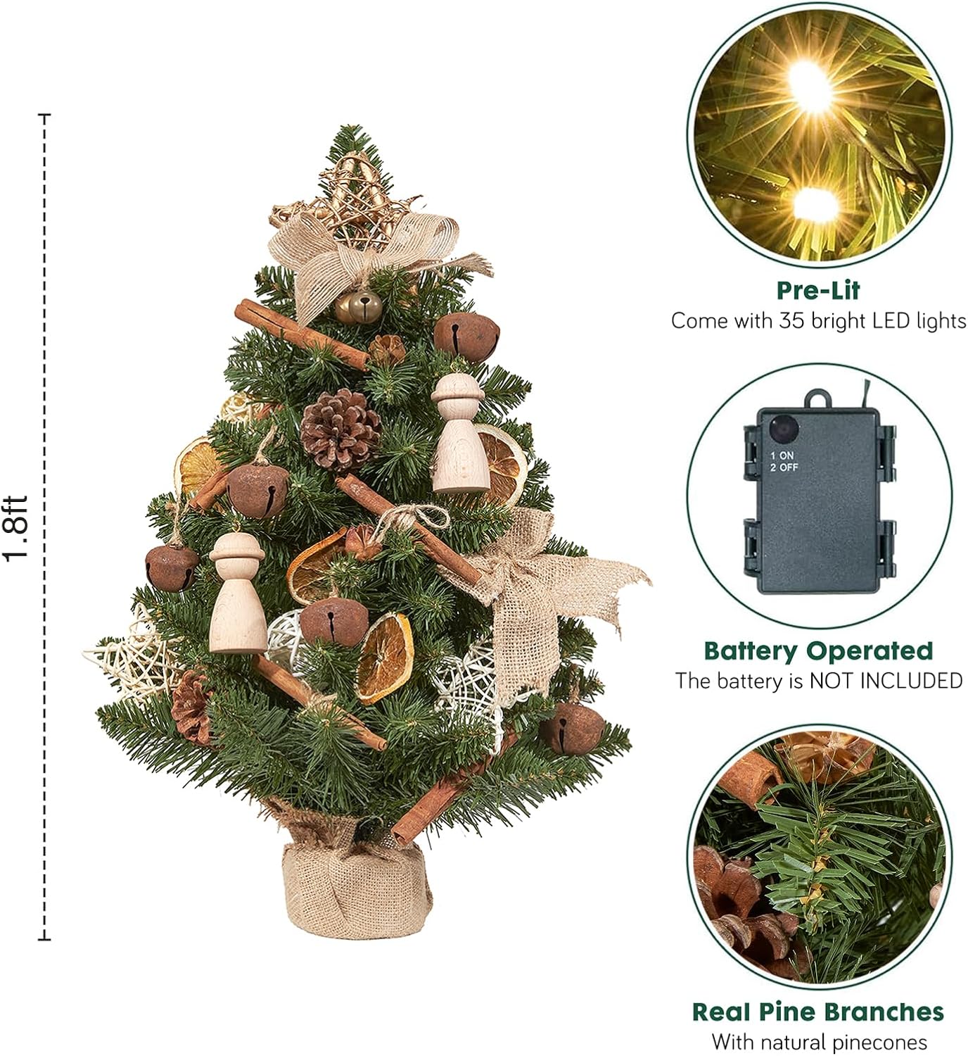 WBHome 1.8 Feet Pre-lit Decorated Tabletop Christmas Tree, Boho-Minimalist Christmas Themed Decorations with Pine Cones, Pre-Lit Mini Christmas Tree, 35 Bulbs