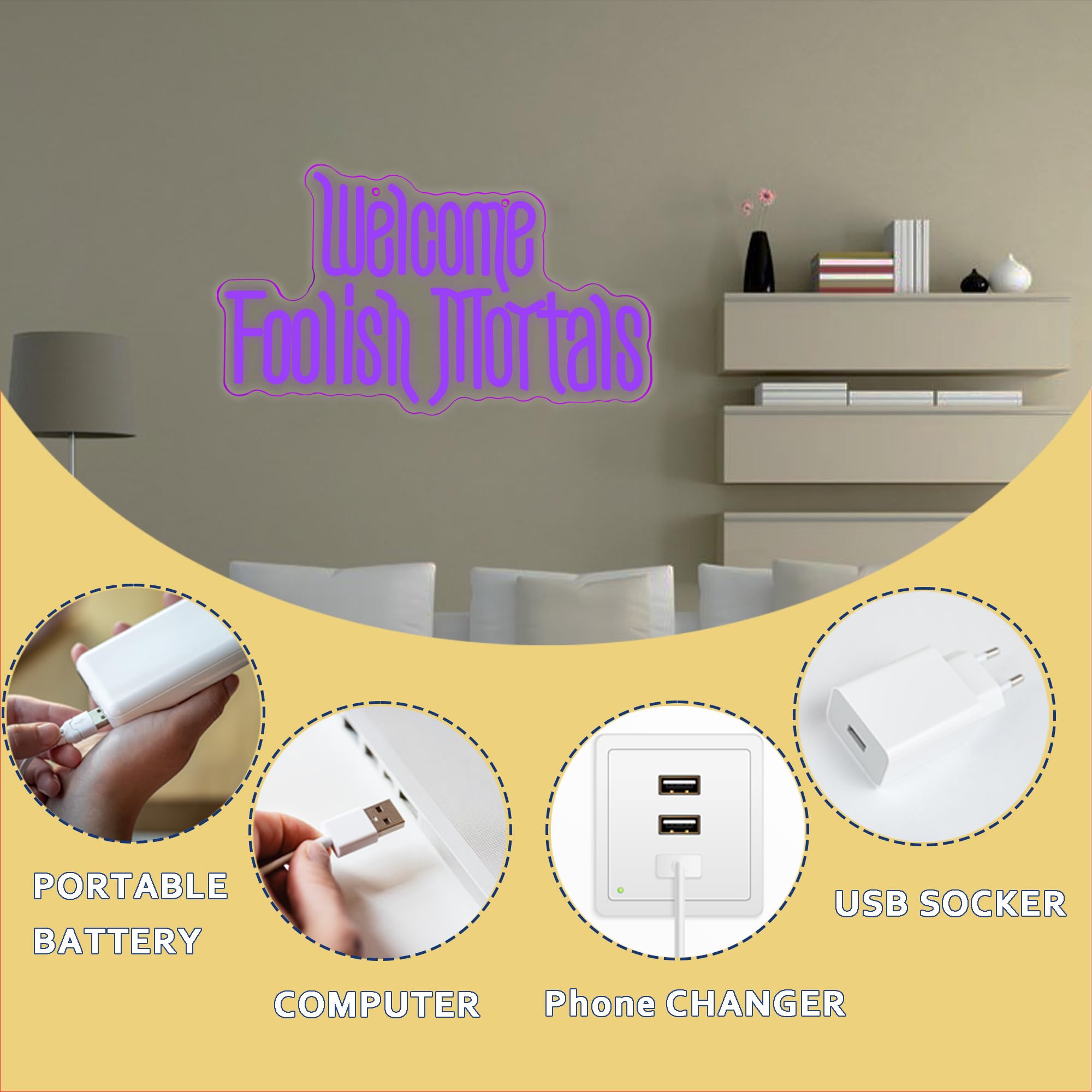 Welcome Foolish Mortals Neon Sign,Dimmable Spooky Gothic Haunted Mansion Decor Coffin LED Neon Signs for Wall Decor,USB Powered Led Neon Light for Party Haunted House Man Cave Birthday Christmas s(16.19.4in) (Purple)