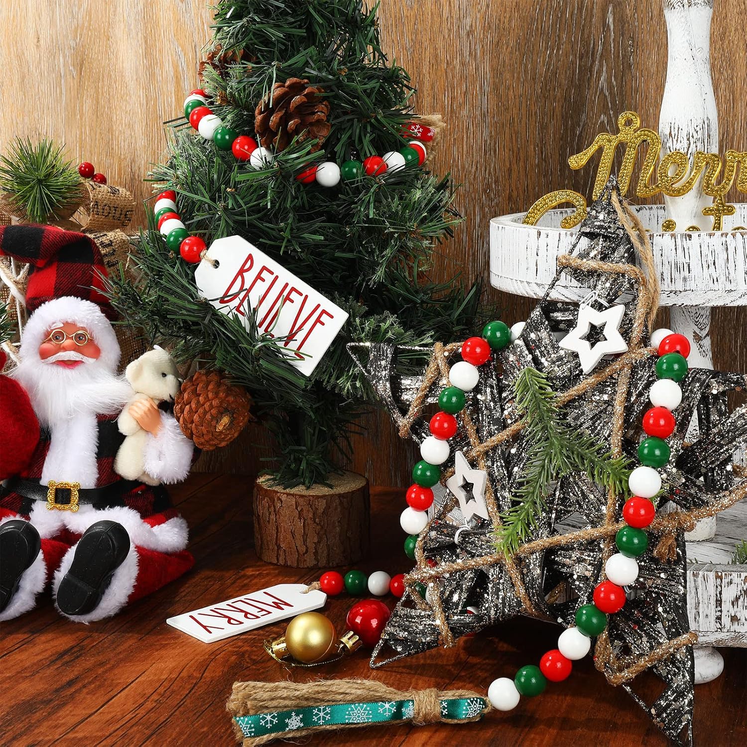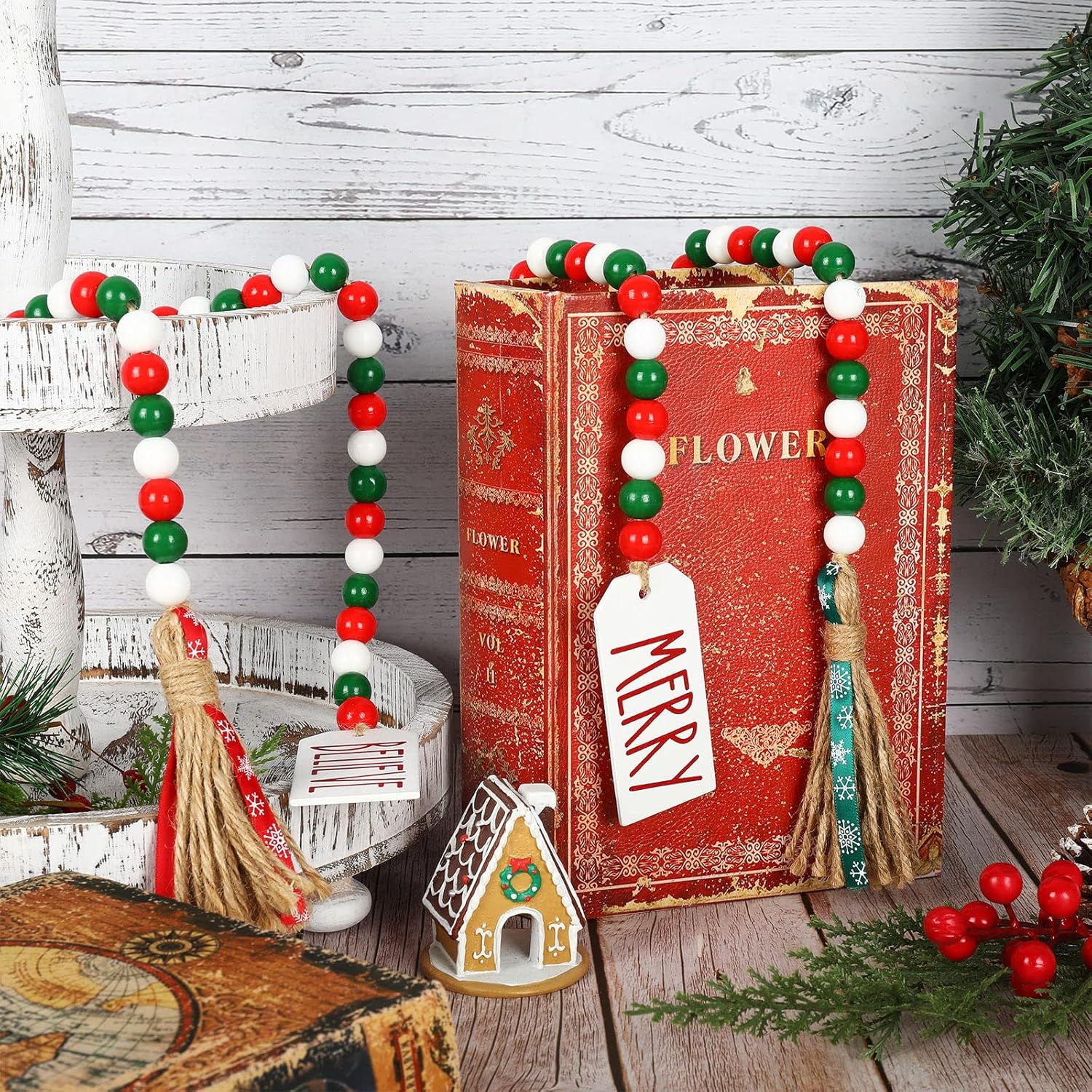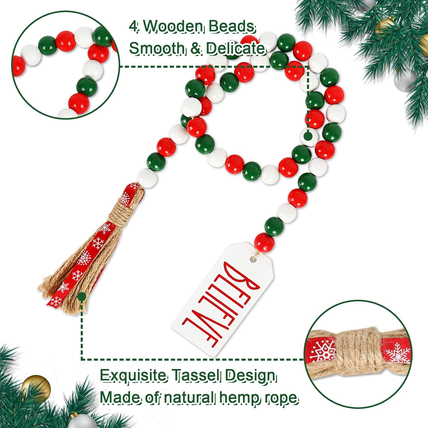 Package Included - You will get 2 strings of Christmas wooden beads with different styles of tassel decoration to make your Christmas holiday atmosphere more intense.Christmas Design - This Christmas wooden bead wreath is decorated with classic red, green and white color scheme, with red and green tassels and wooden tags with "BELIEVE" and "MERRY" respectively. Elegant and charming design makes your house more beautiful.