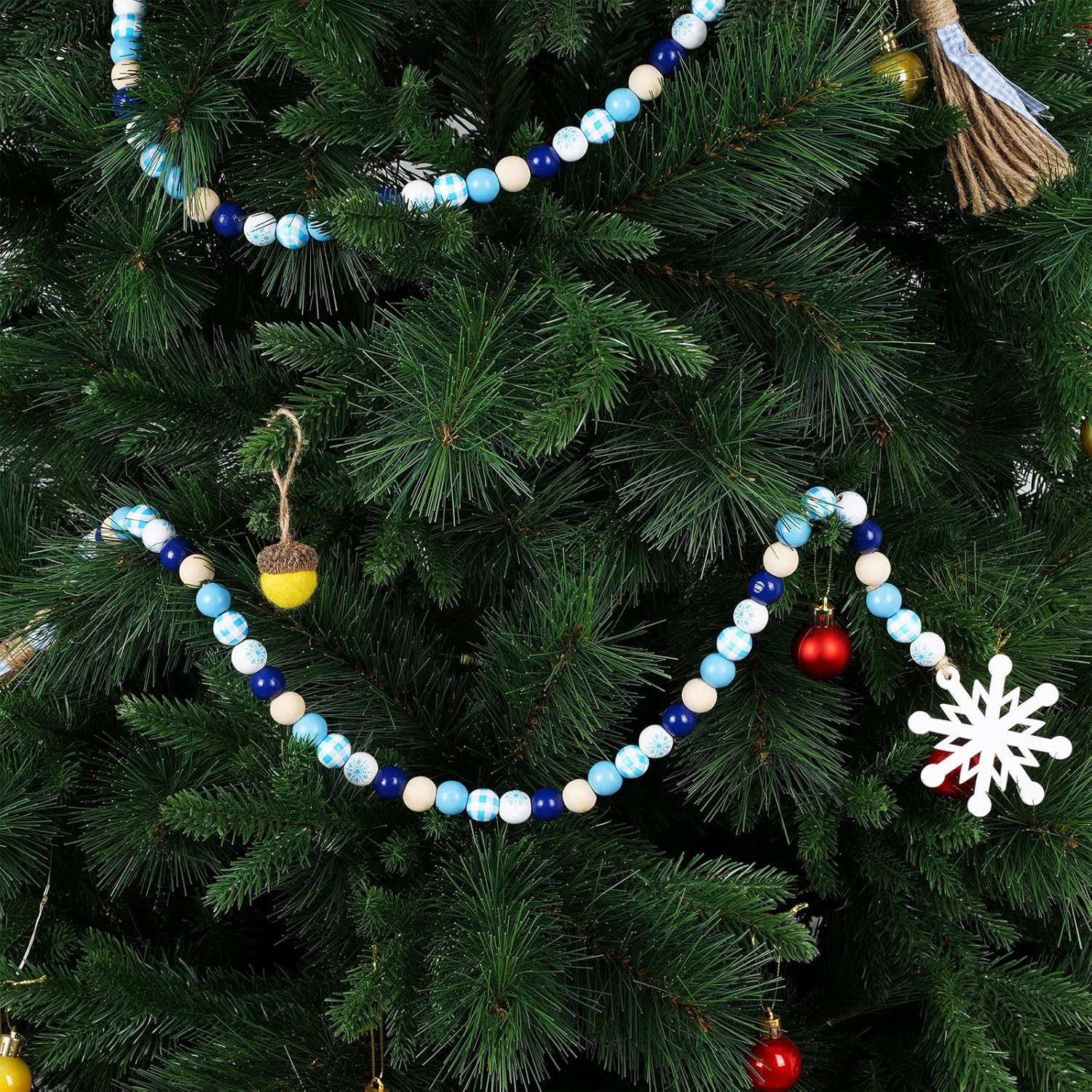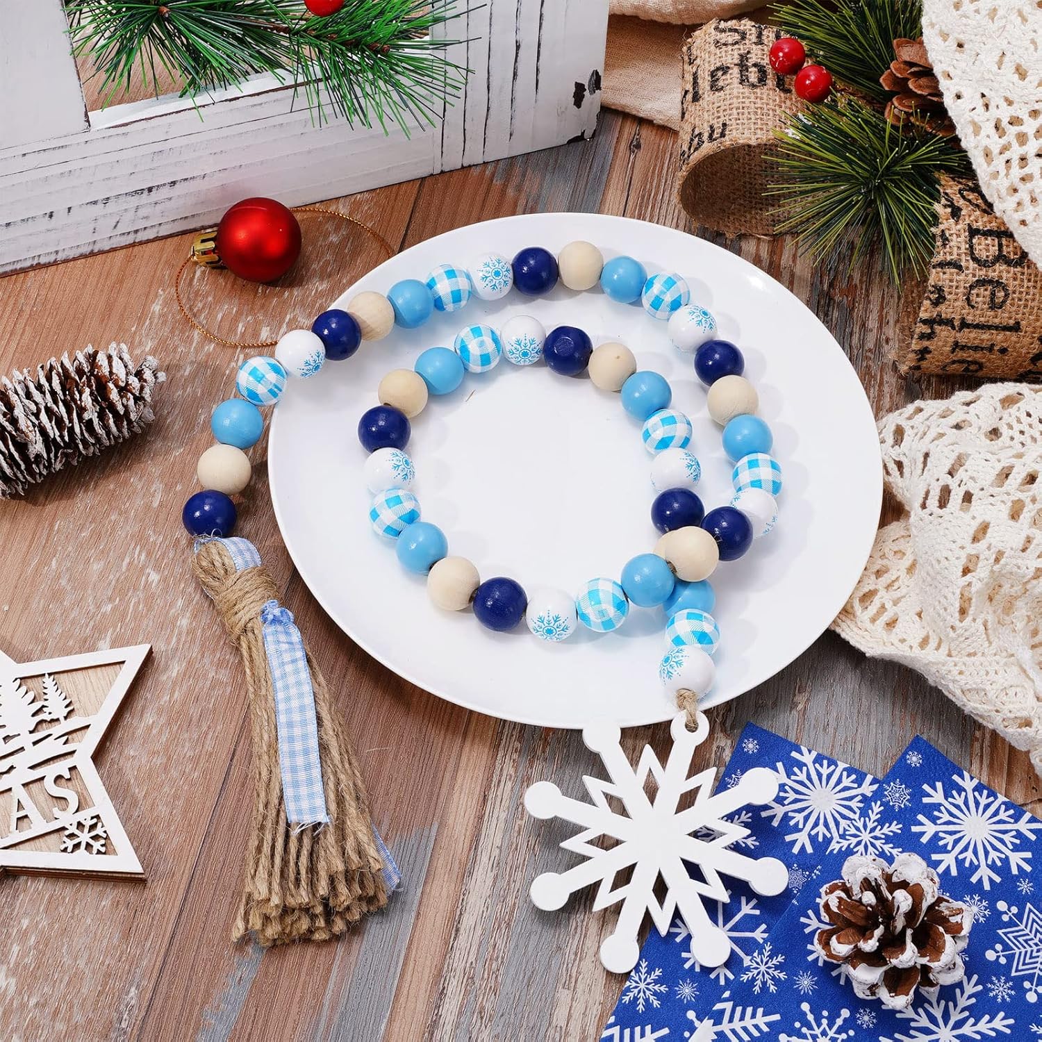 Whaline 2Pcs Winter Wood Beads Garland with Snowflake Pendants Blue White Buffalo Plaids Rustic Farmhouse Xmas Hanging Ornament Snow Flake Beads for Winter Tiered Tray Fireplace Home Decor