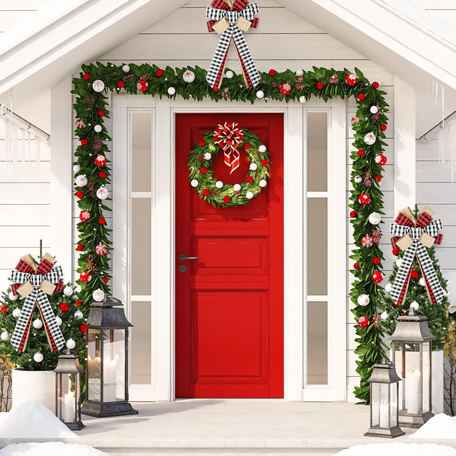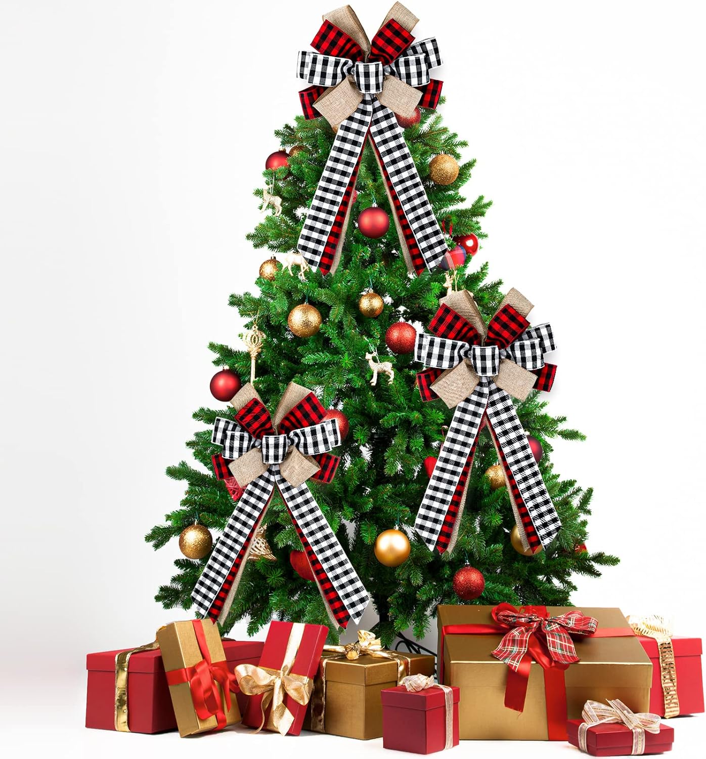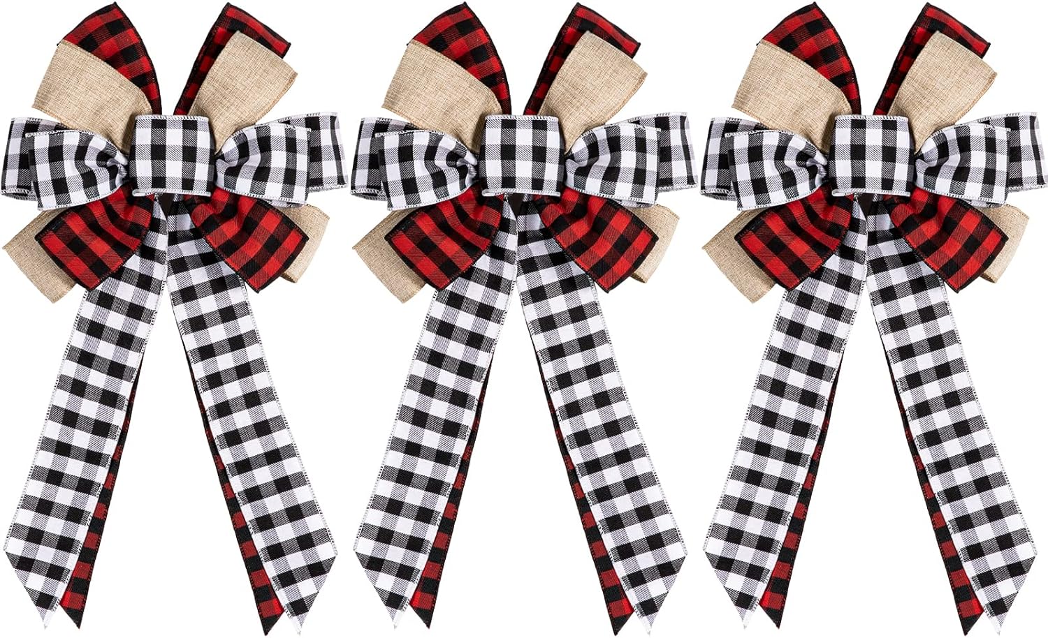 Whaline 3Pcs Christmas Bow Tree Topper Buffalo Plaid Xmas Large Bow Red Black White Handmade Decorative Bow for Christmas Tree Wreath Crafts DIY Bow Year Outdoor Decoration Festival Holiday Party