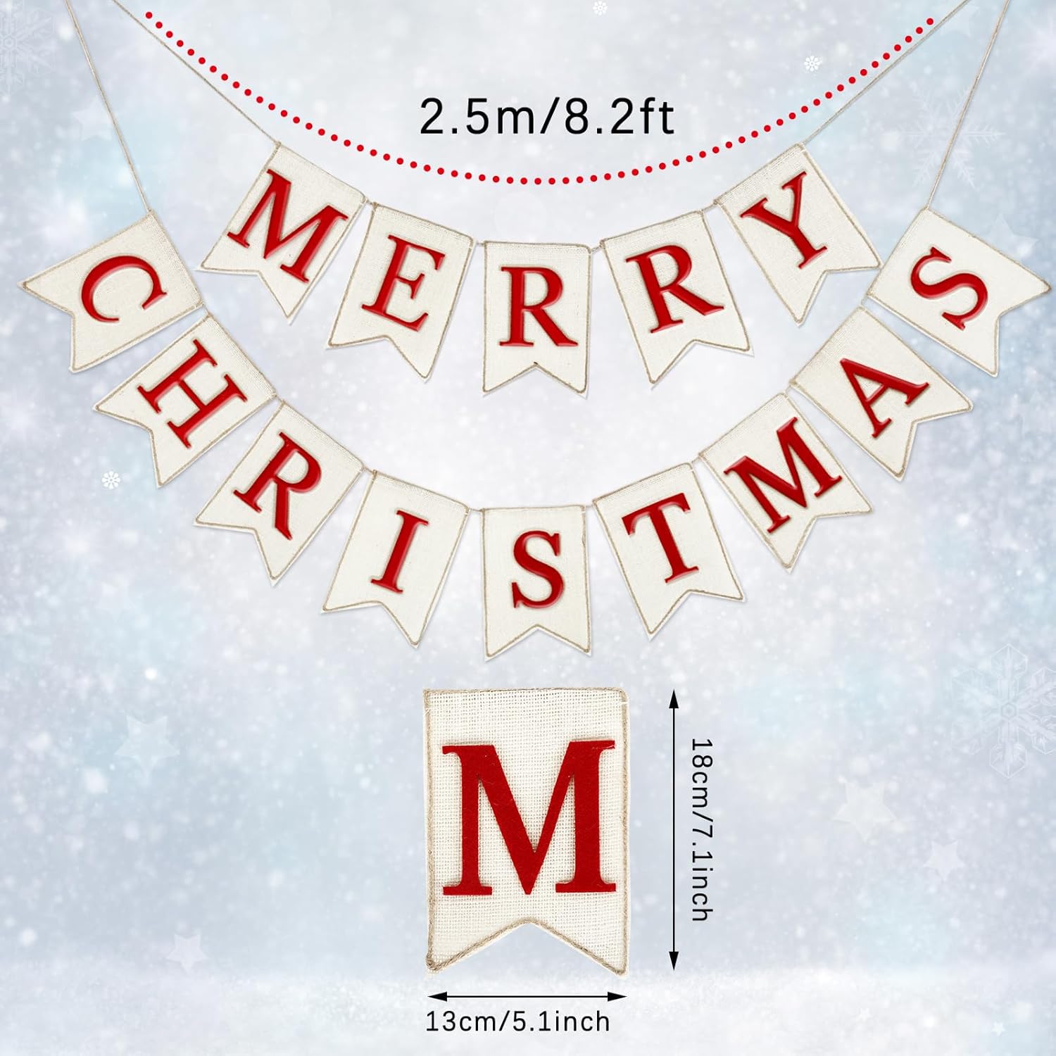 Whaline Christmas Burlap Banner Felt Merry Christmas Banner Pre-Assembled White Red Xmas Bunting Garland Celebration Hanging Decorations for Christmas Party Supplies Home Decoration