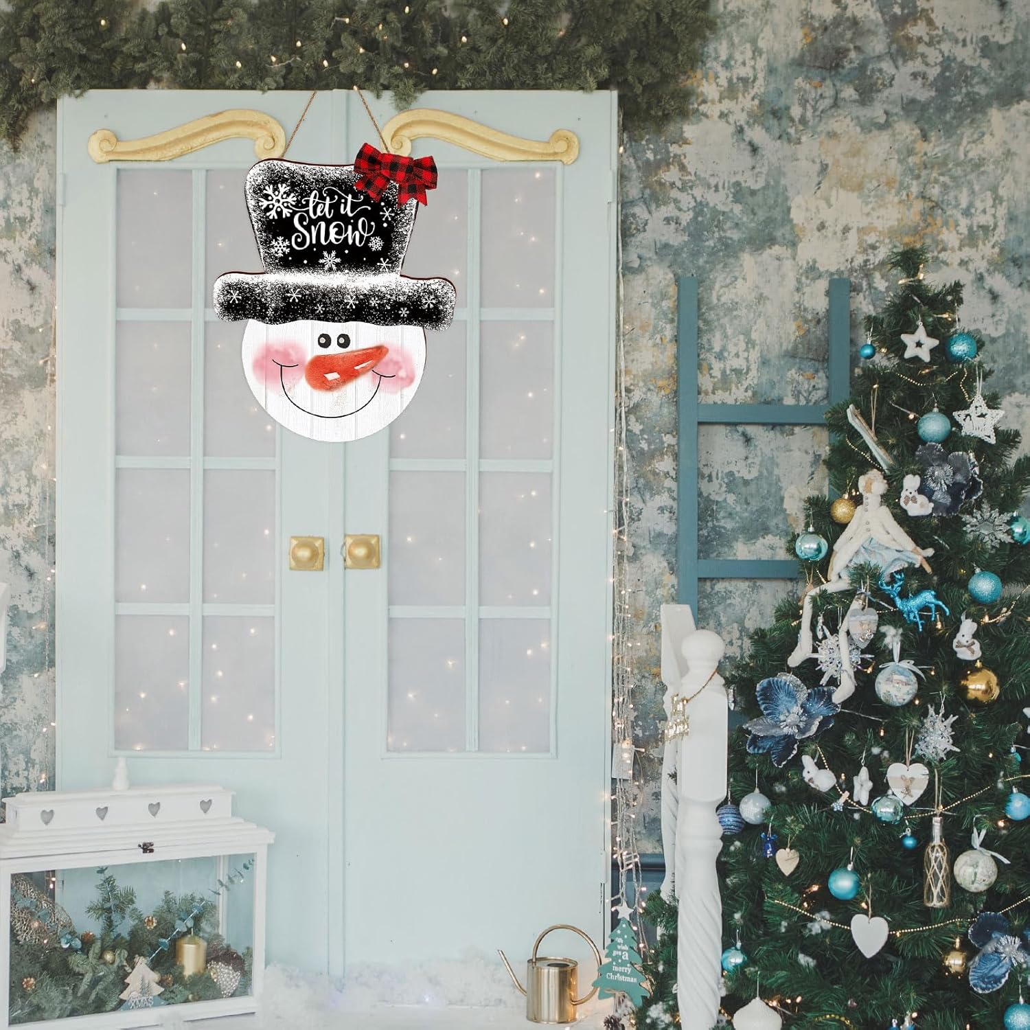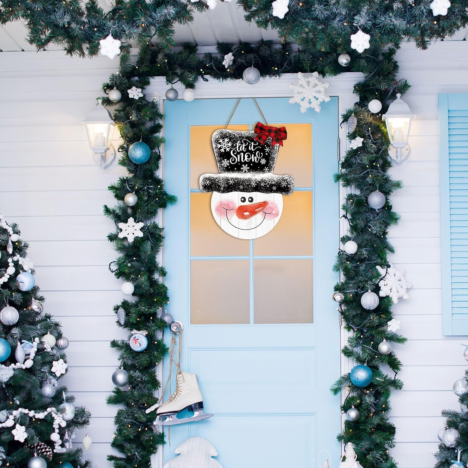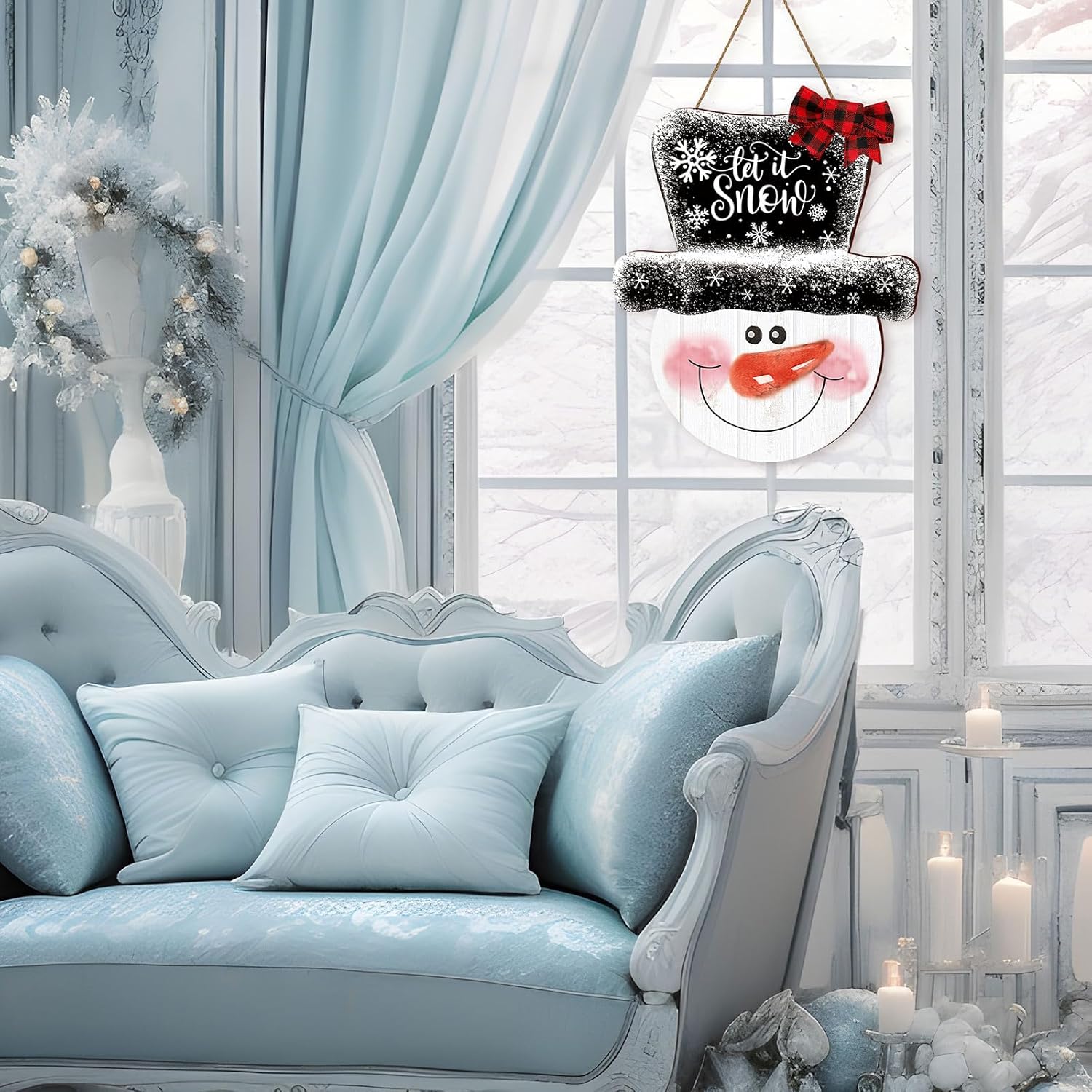 Snowman Wooden Hanging Sign - 1pcs Christmas themed wooden sign is in the package,in the shape of a snowman, printed with snowflakes and LET IT SNOW, decorated with a plaid bow, cute and pretty. With a hemp for hanging, very easy to use.Proper Size - The wooden sign is about 27.2 x 31.5cm/10.7 x 12.4 inch, proper size for your front door, window, wall, etc., bring vitality into your home and party.