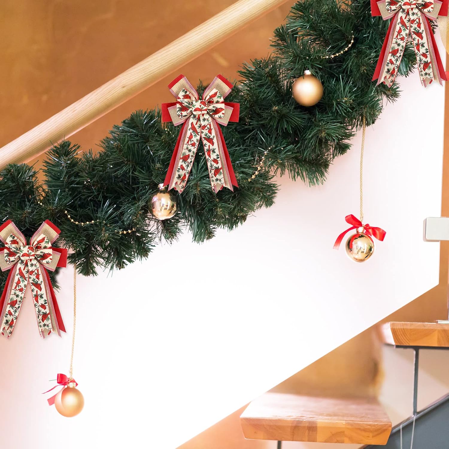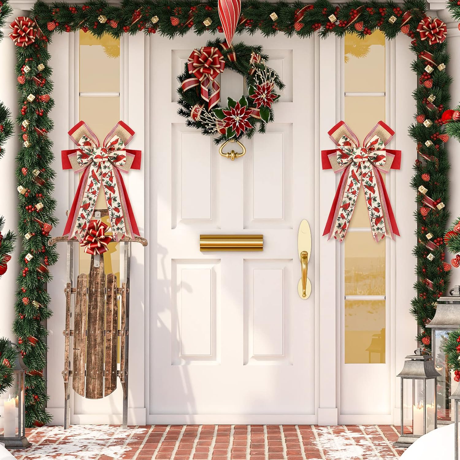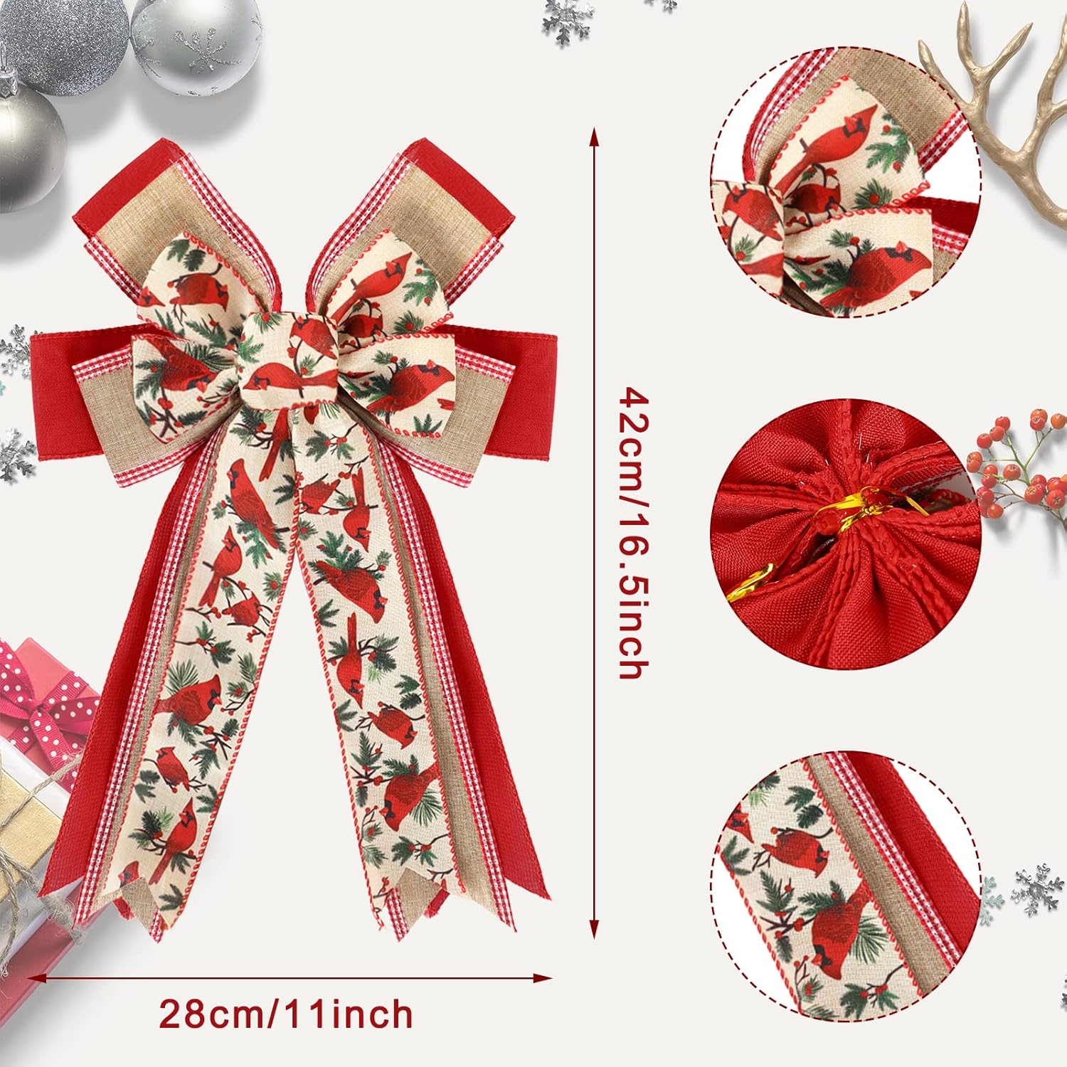 Whaline Christmas Wreath Bow Red Cardinal Birds Pattern Burlap Bow 16.5 x 11 Inch Xmas Special Design Tree Topper Ornament Bow for Christmas Party Indoor Outdoor Home Door Fireplace Decor