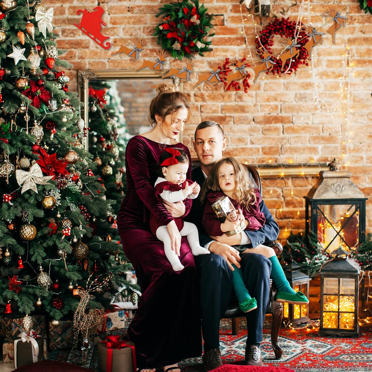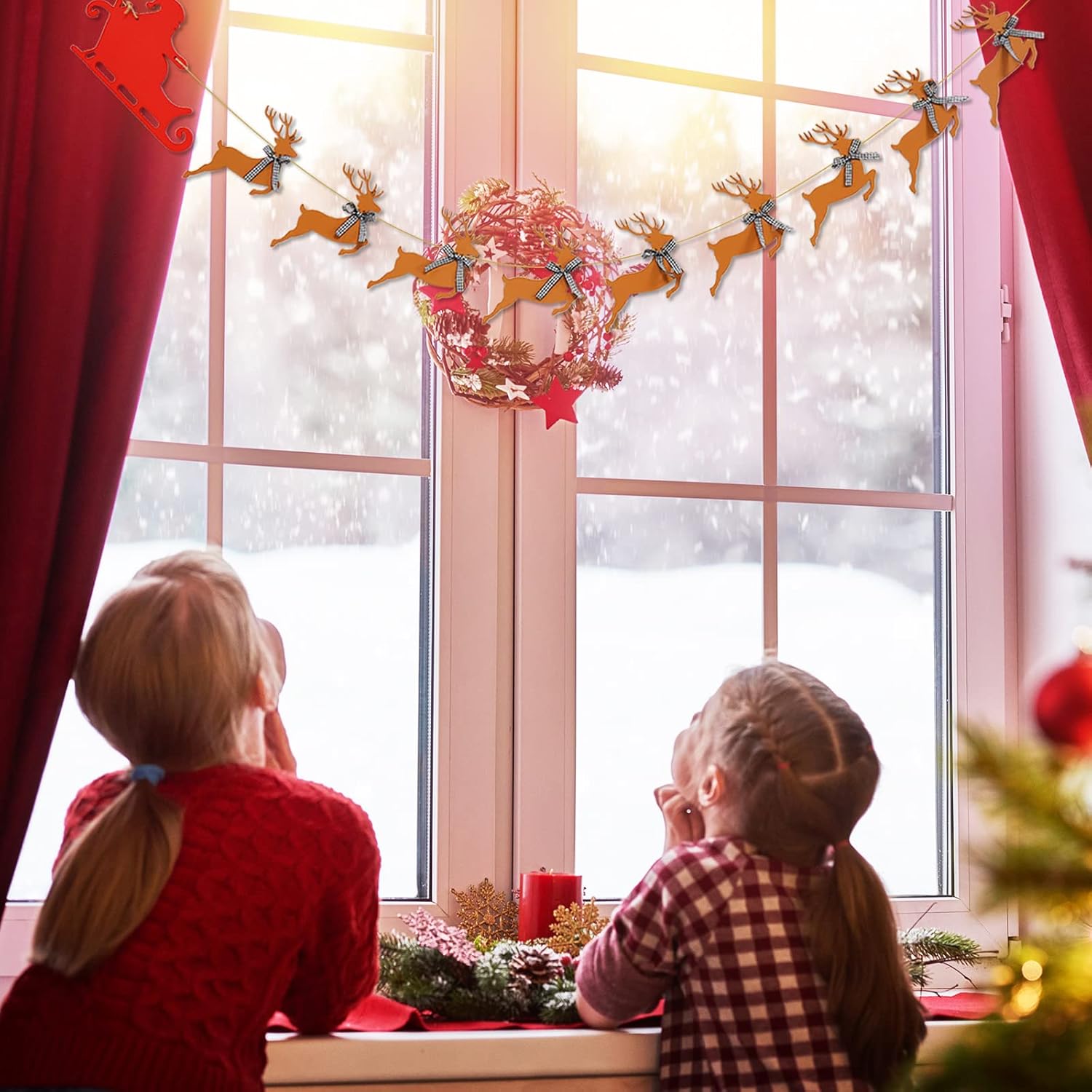 Whaline Wooden Christmas Banner Santa Sleigh and Reindeer Wood Banner Pre-Assembled Rustic Bunting Garland Sign Celebration Hanging Decorations for Xmas Party Supplies Home Decoration