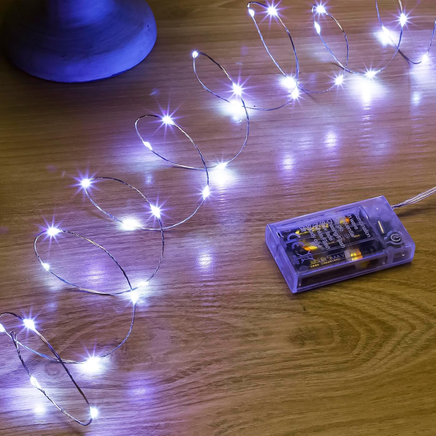• White Fairy Lights: Battery operated lights are made of 5m/16ft long flexible copper wire, 50 micro LED white lights,which are brilliant, pure, no heat (safe to touch) and long life, adding a charming ambiance to any space, making them ideal for use in bedrooms, living rooms, patios, stair railings, trees, railings, fences, tents and more.
