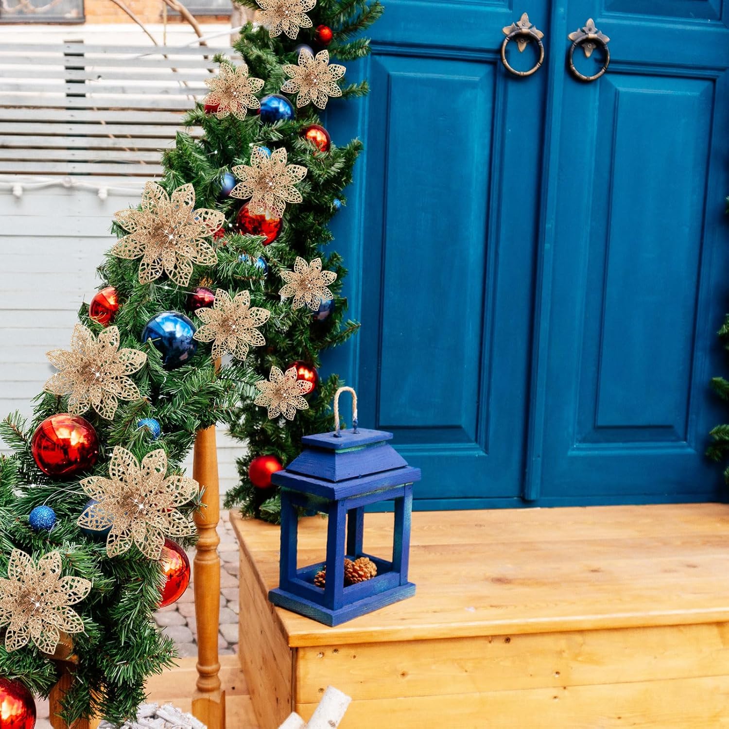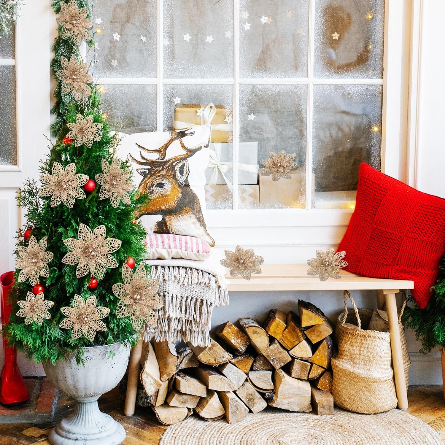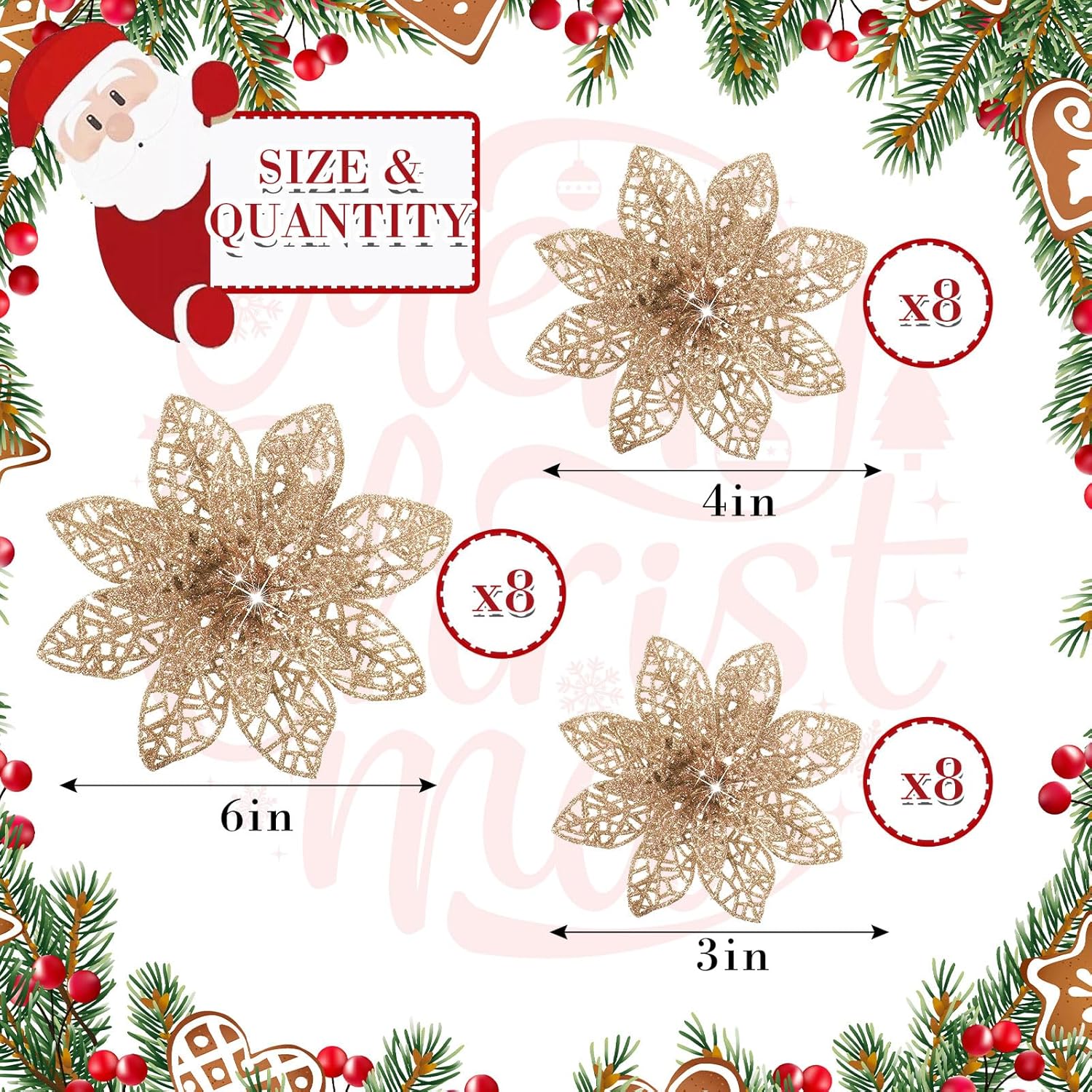 WILLBOND 36 Pieces Christmas Poinsettia Flowers Artificial Ornaments Glitter Christmas Decorations Tree Wedding Year(Champagne)