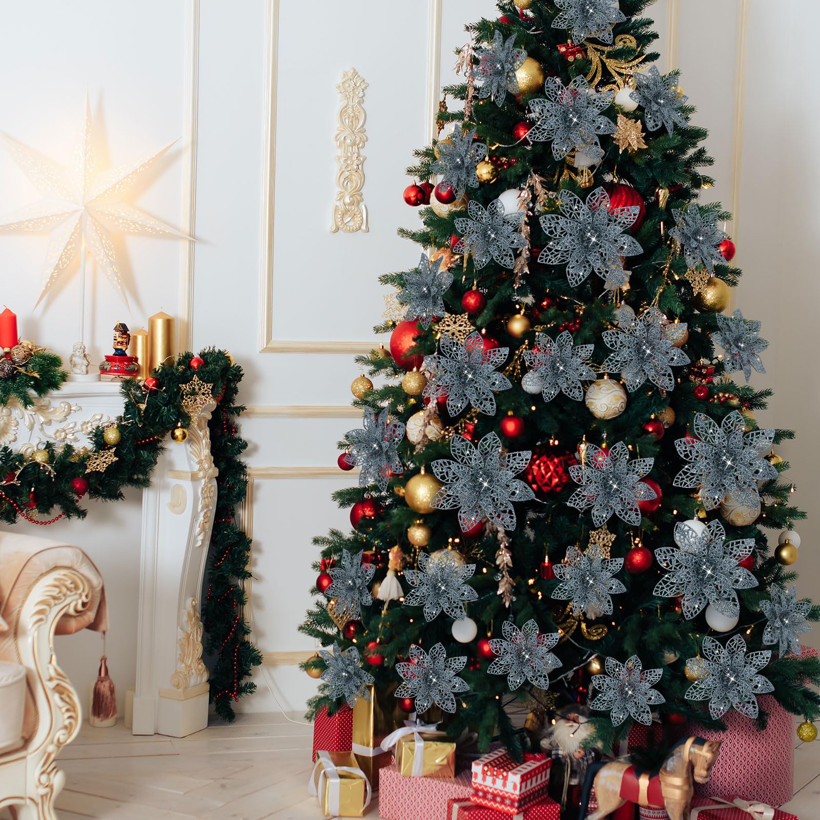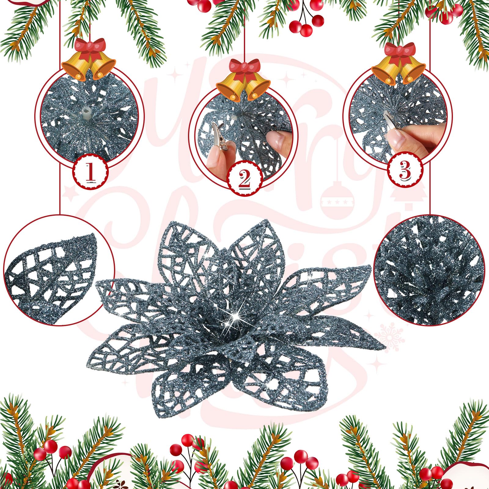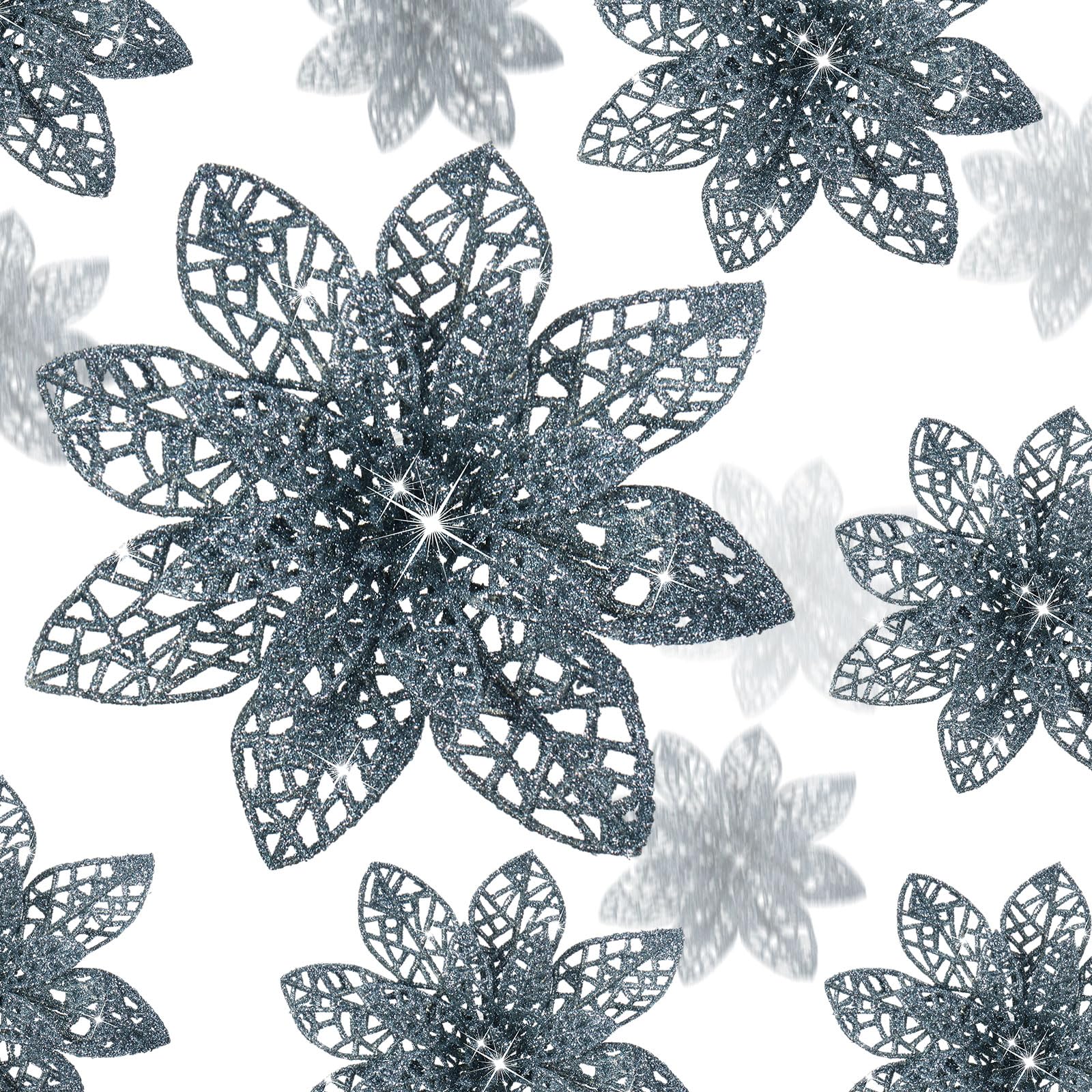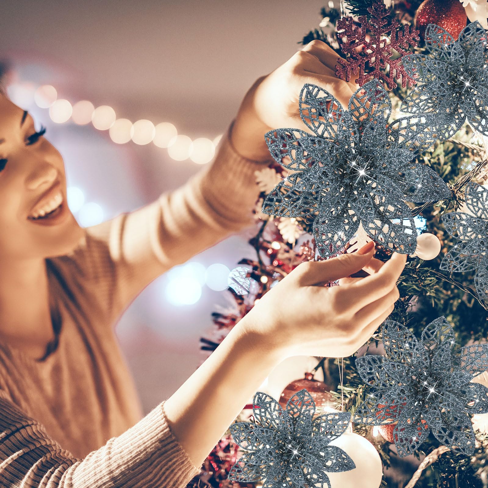 WILLBOND 36 Pieces Christmas Poinsettia Flowers Artificial Ornaments Glitter Christmas Decorations Tree Wedding Year(Dusty Blue)