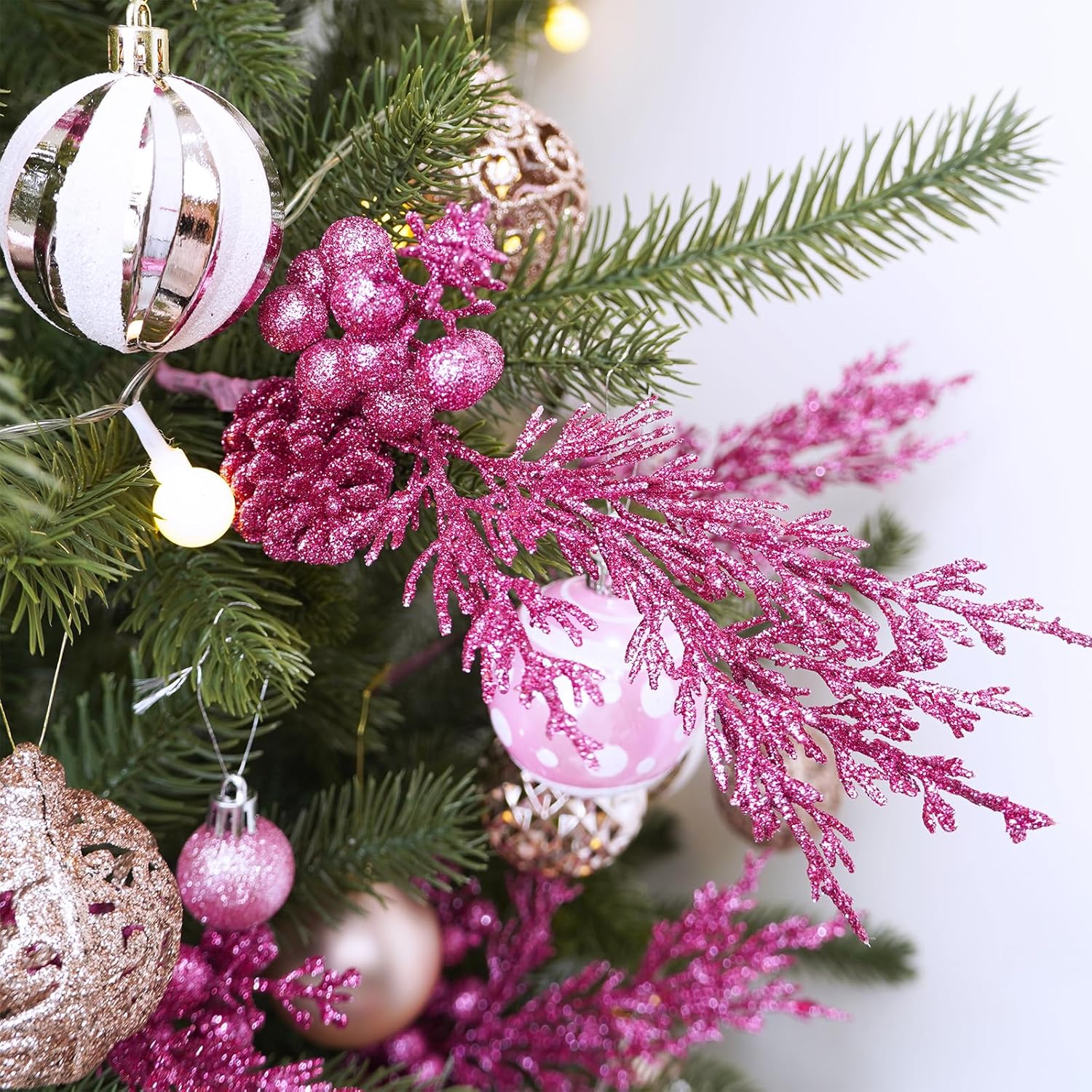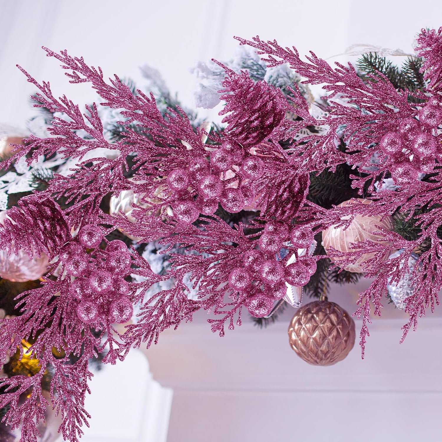 Quantity: Package includes 12 pink glitter artificial pine branches with pine cone and berries. These decorative picks are ideal for enhancing your current Christmas displays or can be used as a standalone decoration. They will add a touch of elegance and sparkle to your home during the holiday season.Design: This pink Christmas glitter pick features a beautiful pink color with pine sprigs, a pine cone, and a cluster of berries. The stems are wrapped in brown floral tape and are flexible for easy decorating. The shimmering design of this Christmas glitter berries stem adds a touch of elegance to your decor, making it a perfect focal point for your Christmas, birthday, wedding, Year, and family gatherings.