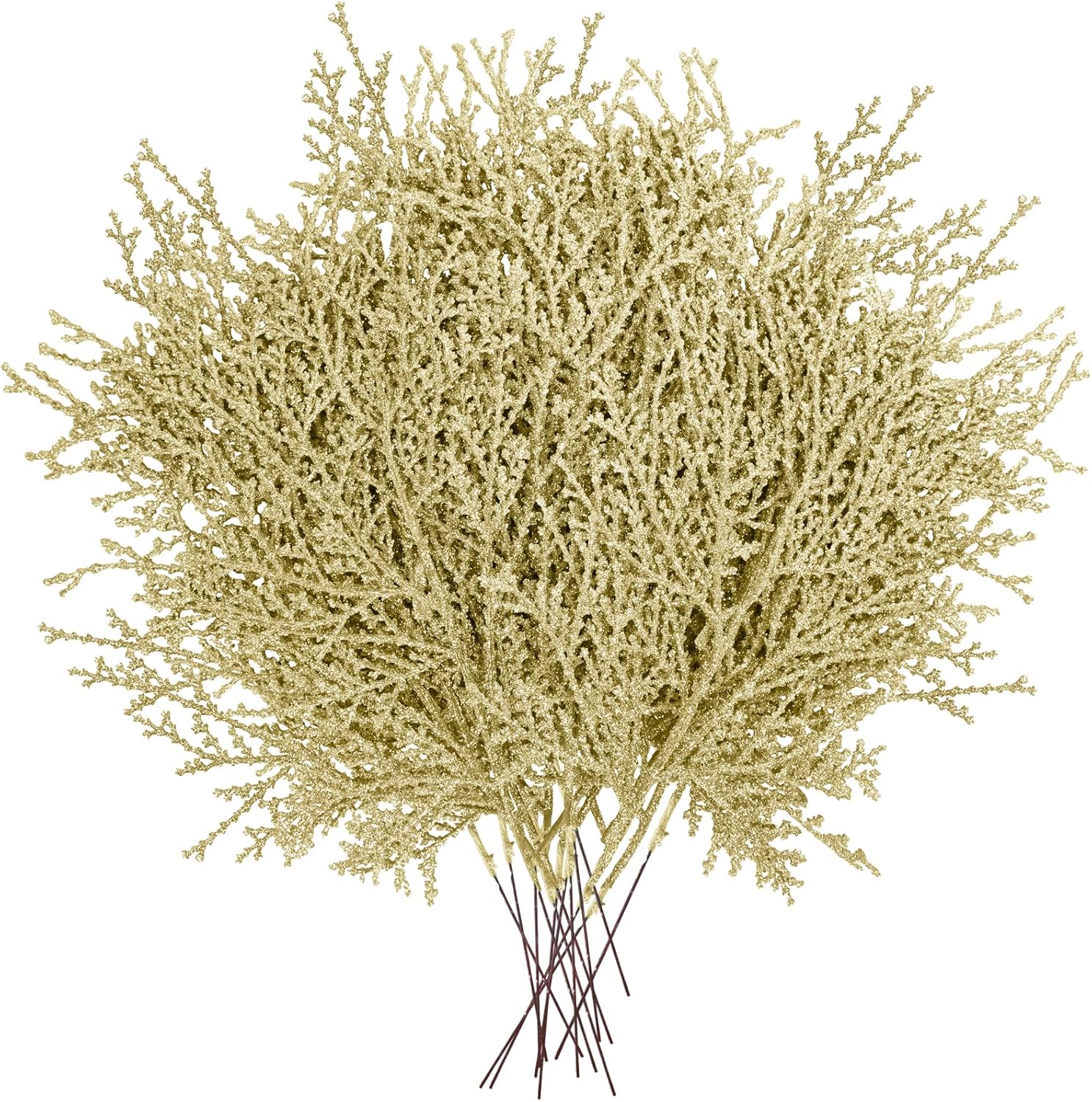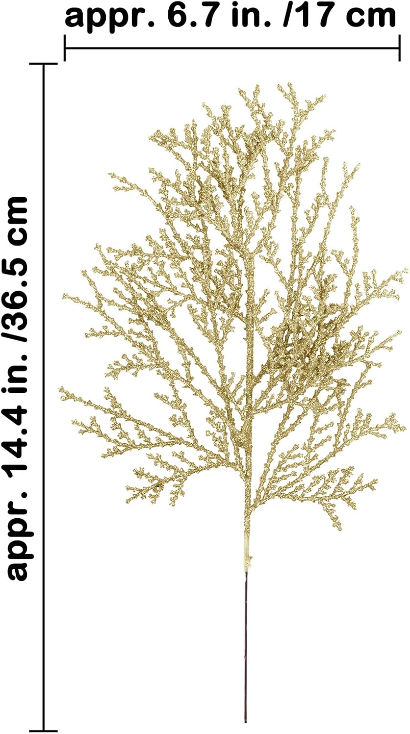 Winlyn 15 Pcs Christmas Artificial Cedar Sprays Champagne Glittered Faux Cedar Branches Stems Christmas Tree Ornament Picks 14.4" for Christmas Tree Wreath Wedding Bouquet Holiday Centerpiece