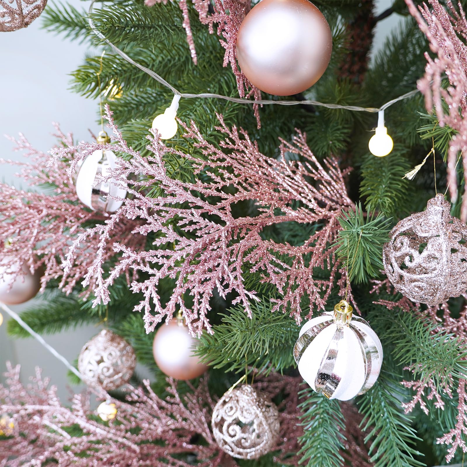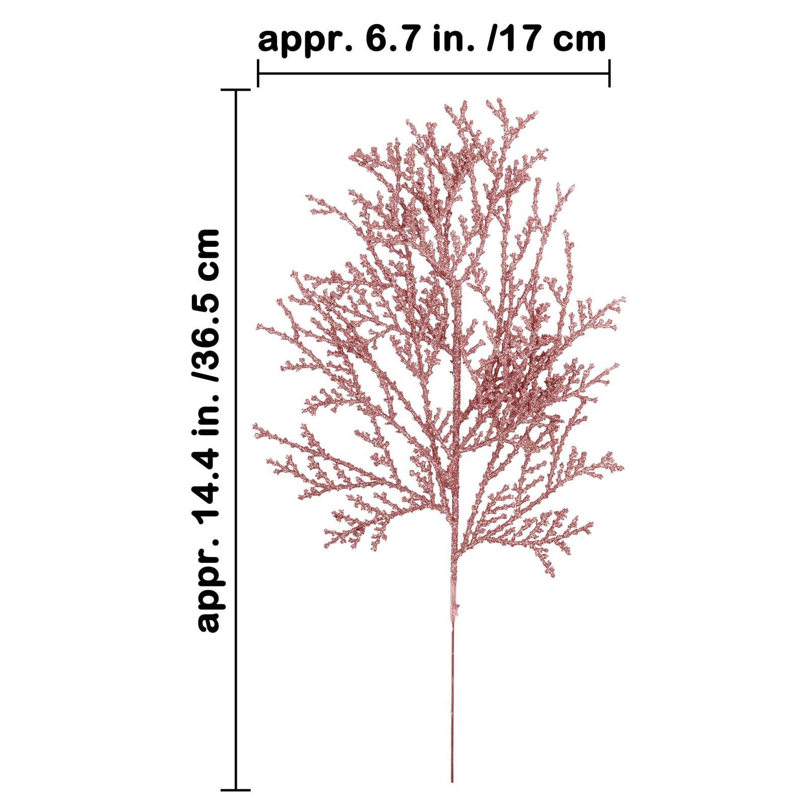Winlyn 15 Pcs Christmas Artificial Cedar Sprays Rose Gold Glittered Faux Cedar Stems Christmas Tree Ornament Picks 14.4" for Rose Gold Christmas Tree Wreath Wedding Holiday Centerpiece DIY Project
