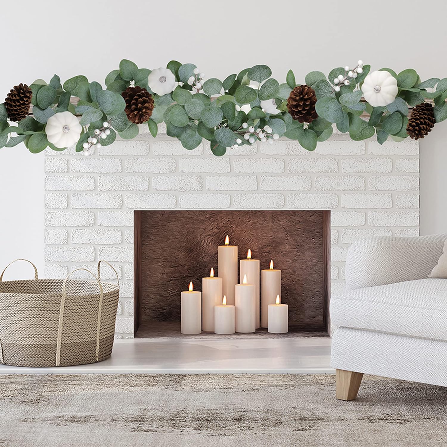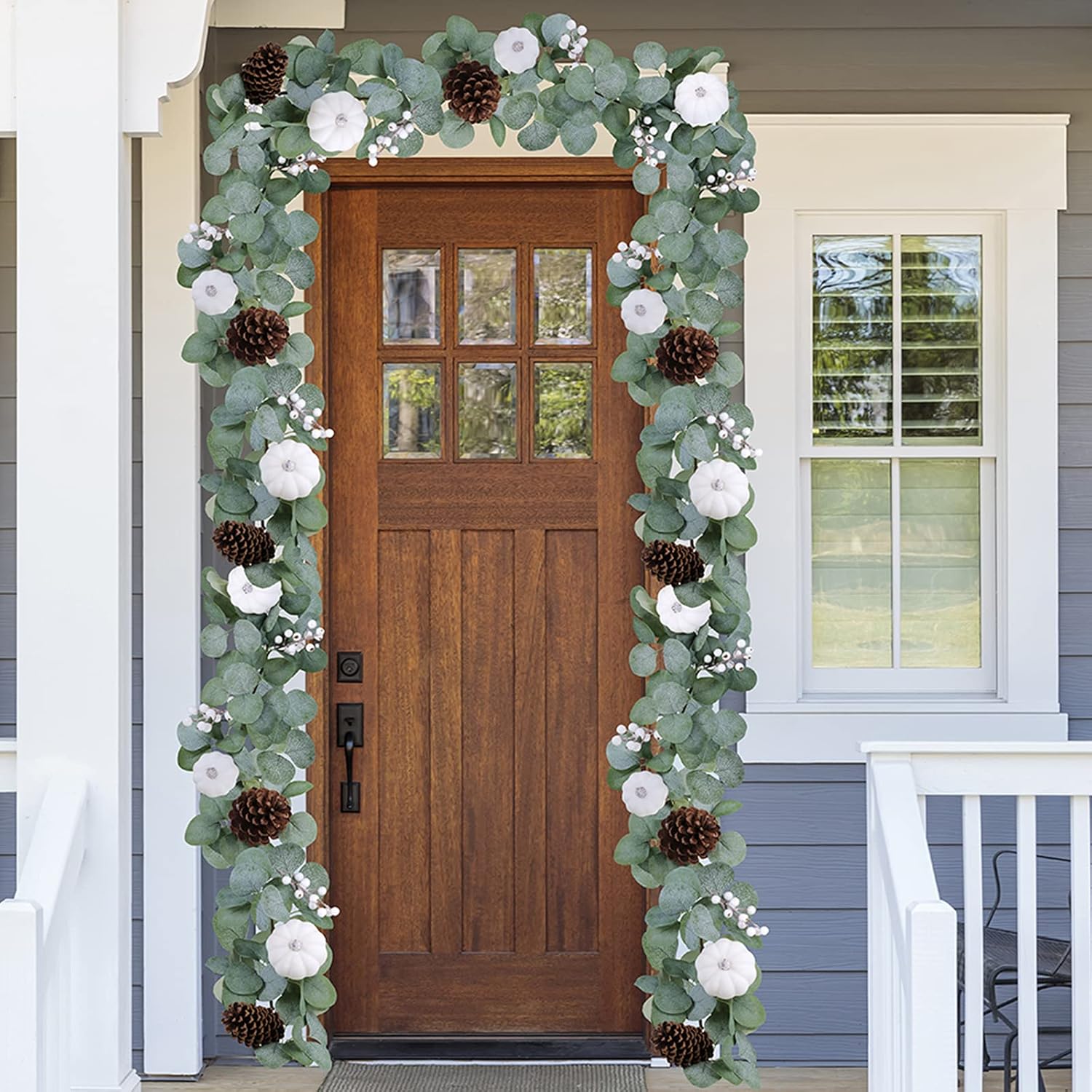 Winlyn 2 Pack White Pumpkin Garland Artificial Eucalyptus Garland with White Pumpkins Pinecones Berries Fall Foliage Garland for Wedding Arch Backdrop Thanksgiving Table Runner Farmhouse Décor