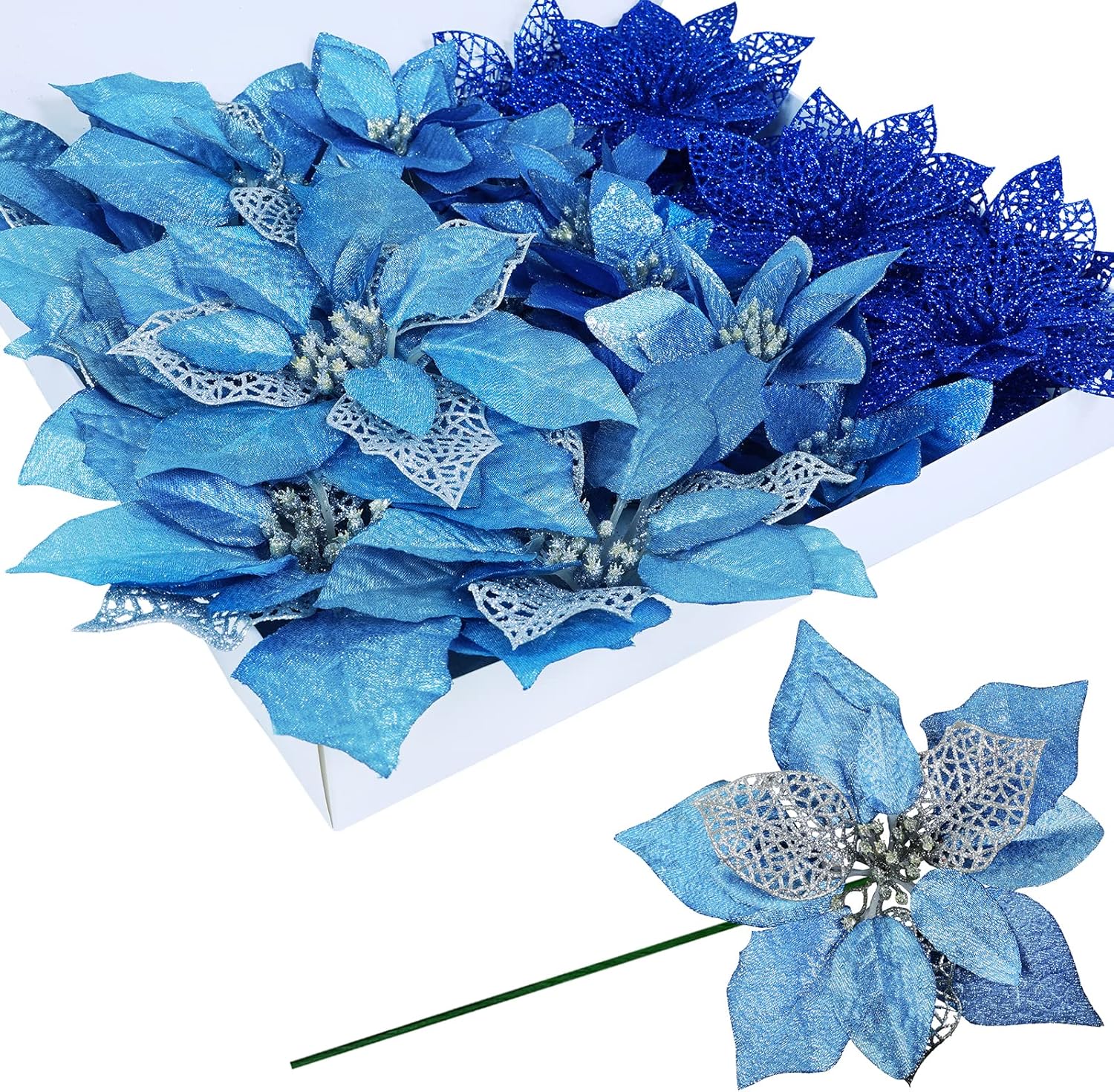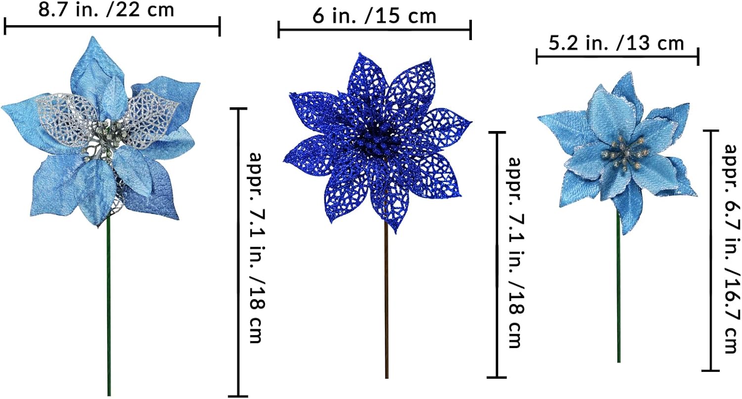 Winlyn 24 Set 3 Styles Christmas Blue Glitter Poinsettia Flowers Picks Christmas Tree Ornaments for Blue Christmas Tree Wreaths Garland Holiday Seasonal Wedding Decorations White Box Included