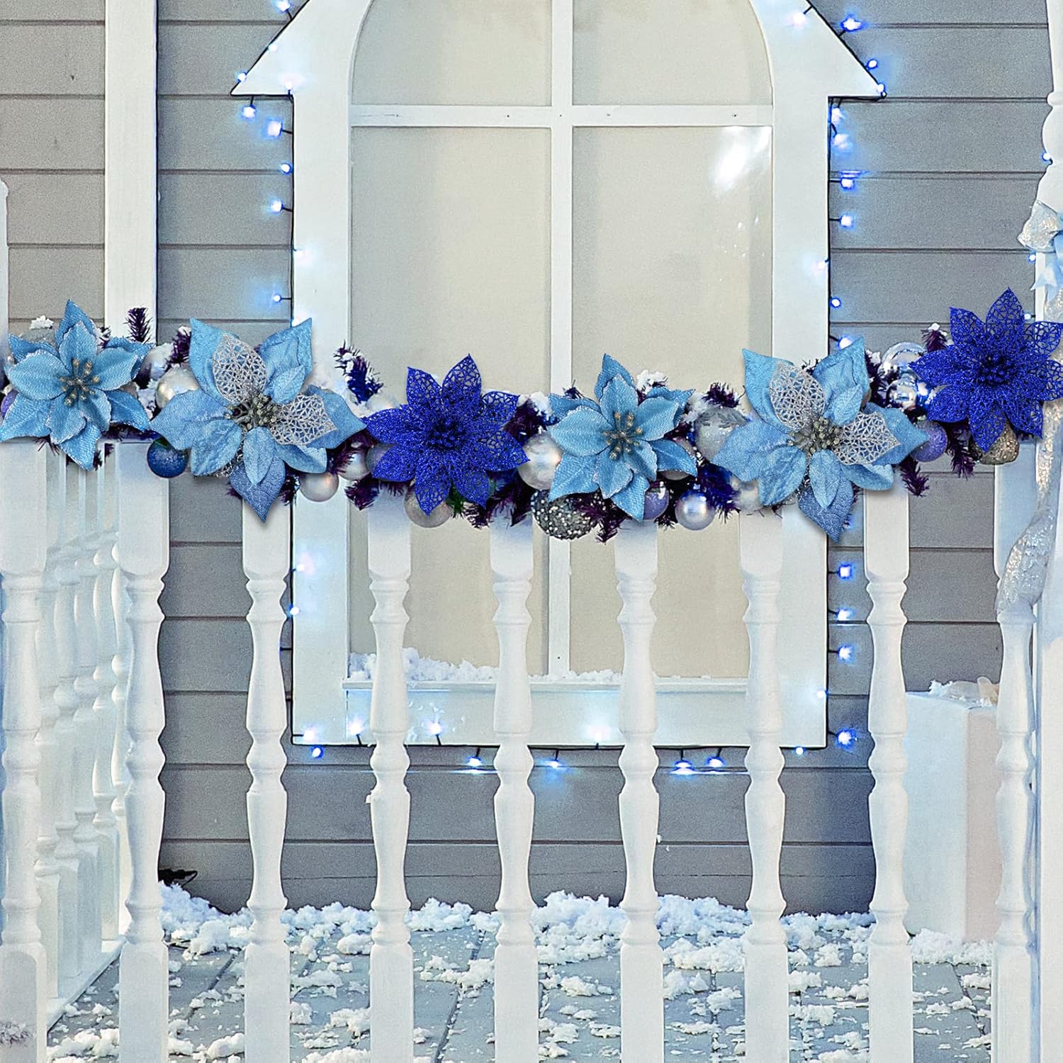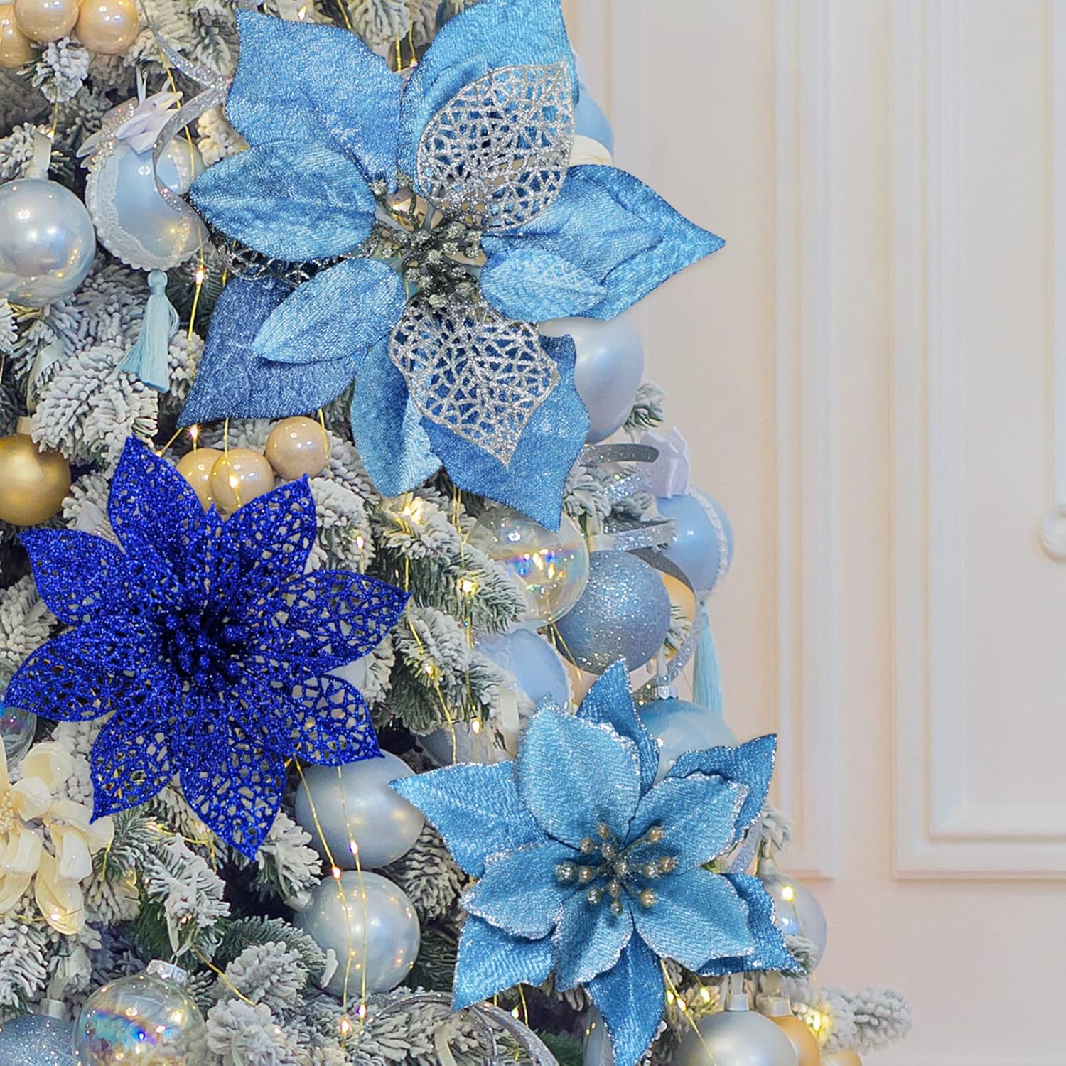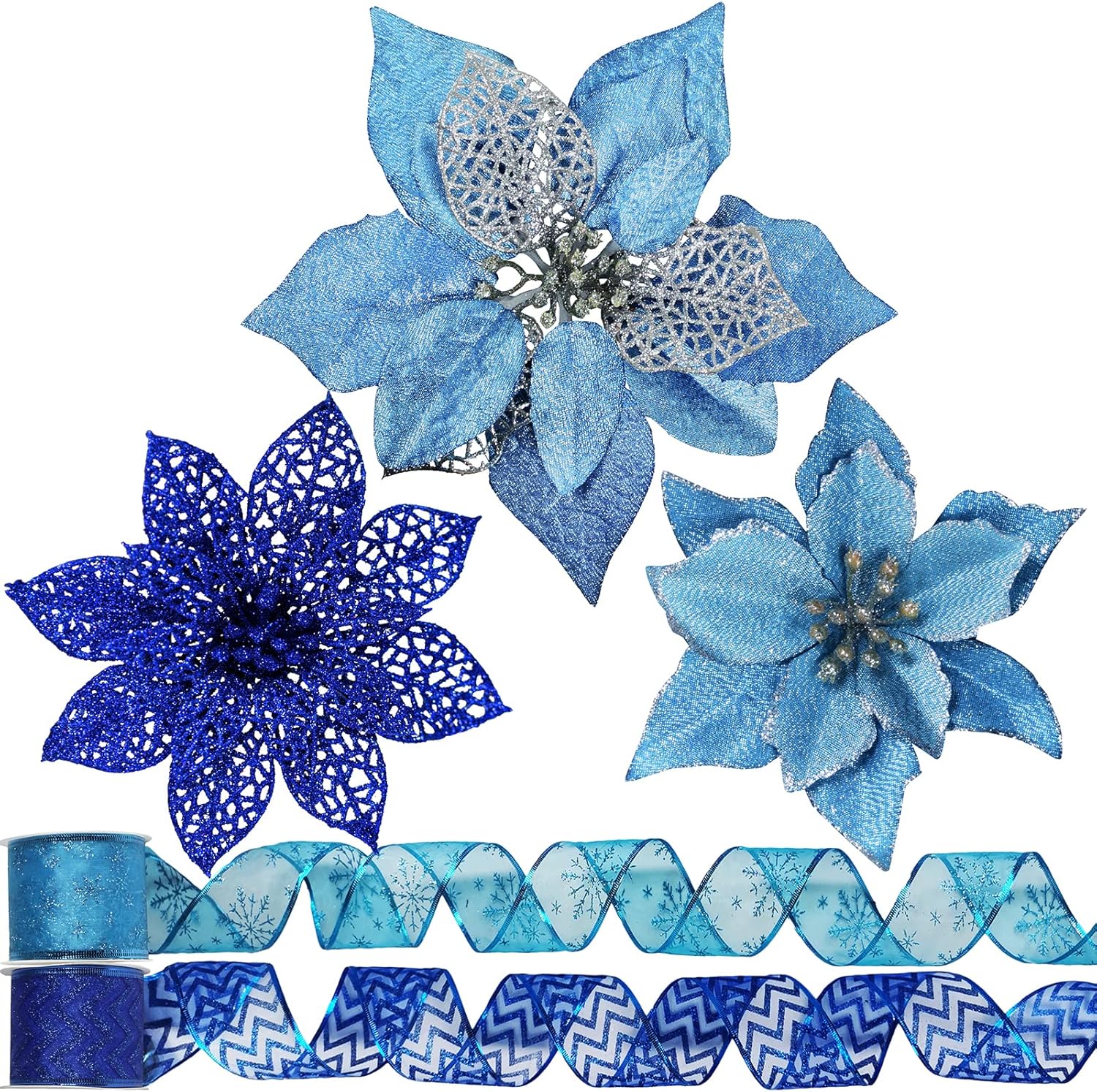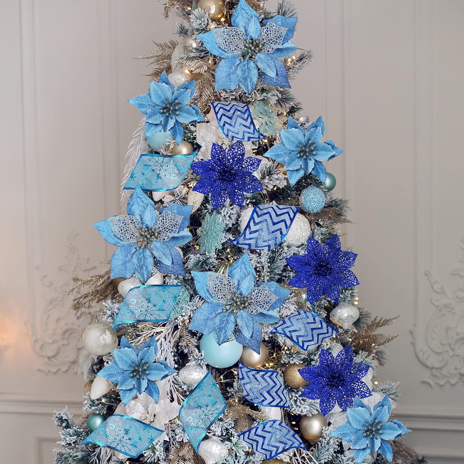 Winlyn 26 Set 3 Style Christmas Blue Glitter Poinsettia Flowers Picks Xmas Tree Ornaments and 12 Yards Decorative Blue Glittered Wired Ribbon for Blue Christmas Tree Wreath Garland Holiday Décor