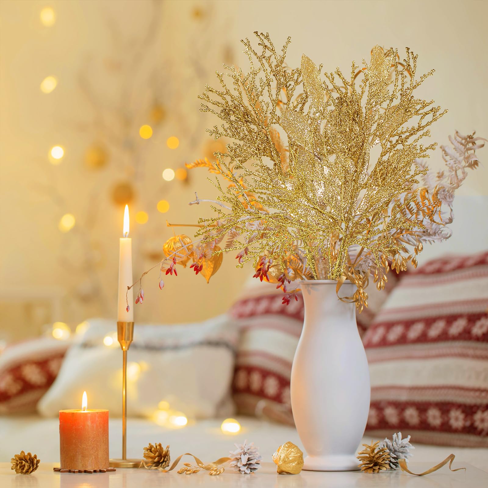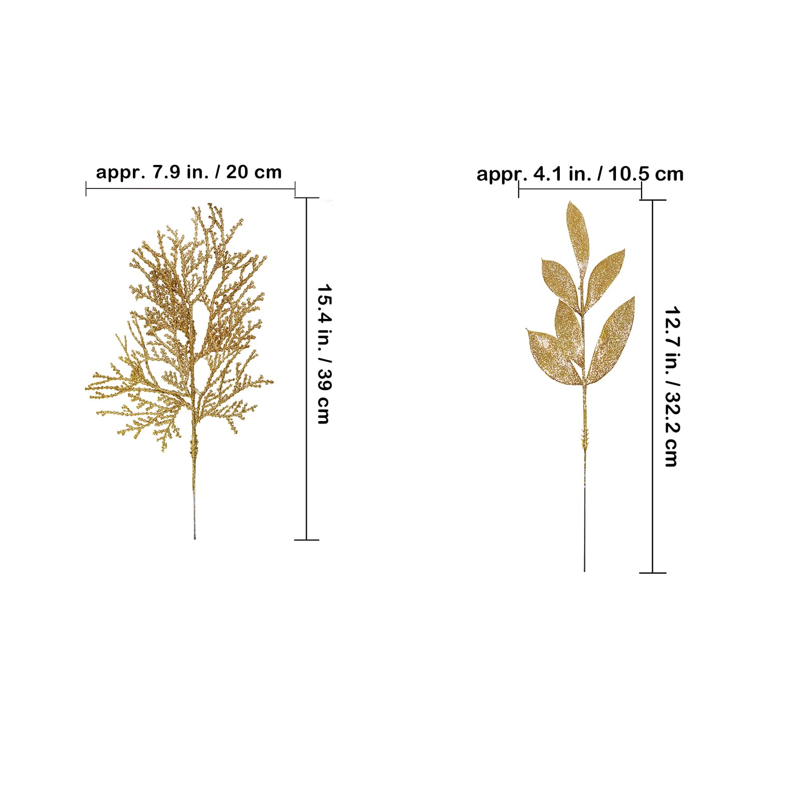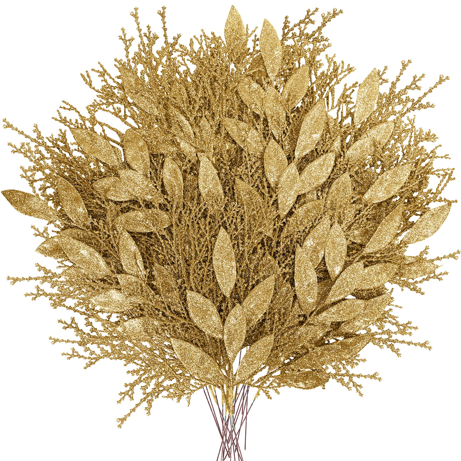 Winlyn 30 Pcs Christmas Artificial Leaf Sprays Cedar Picks Gold Glittered Christmas Tree Ornaments Floral Stems for Gold Christmas Tree Wreaths Swag Centerpieces Holiday Seasonal Wedding Decorations
