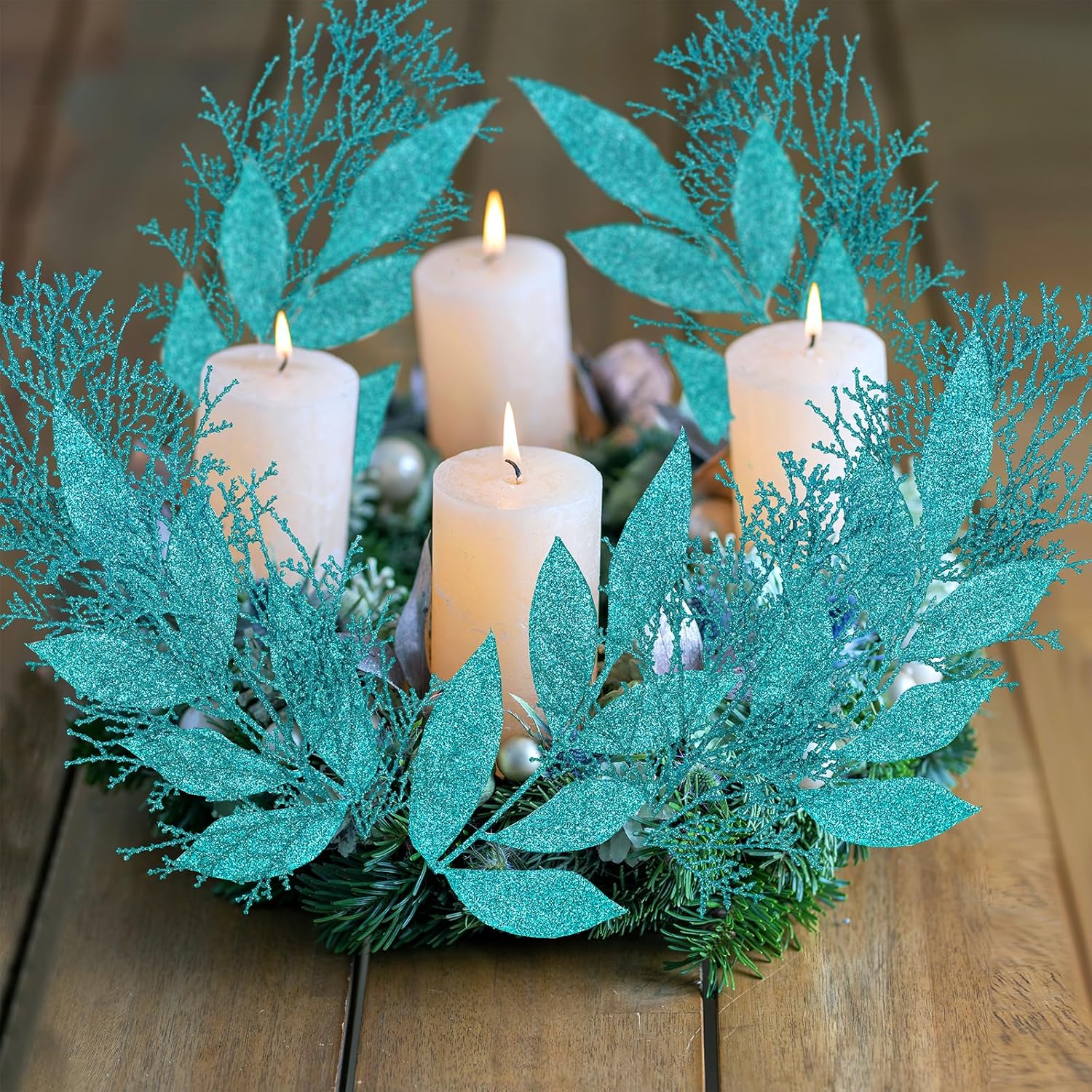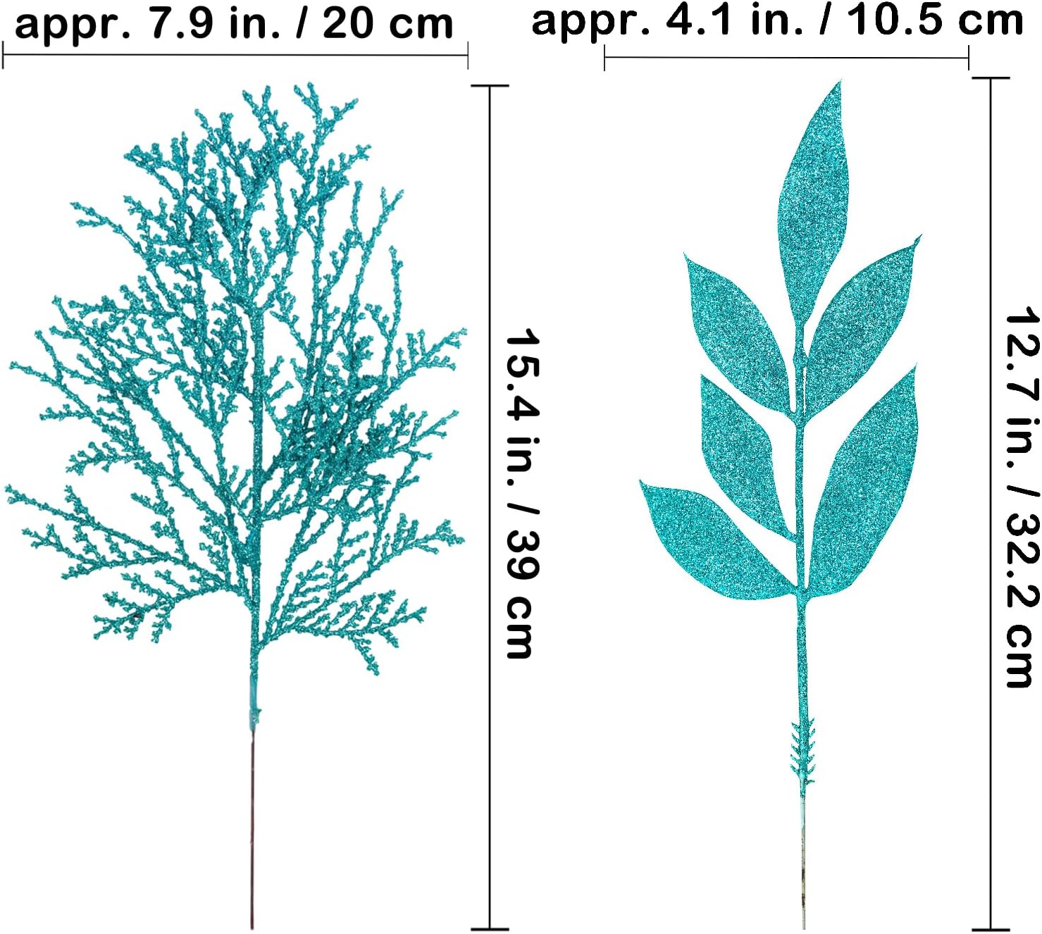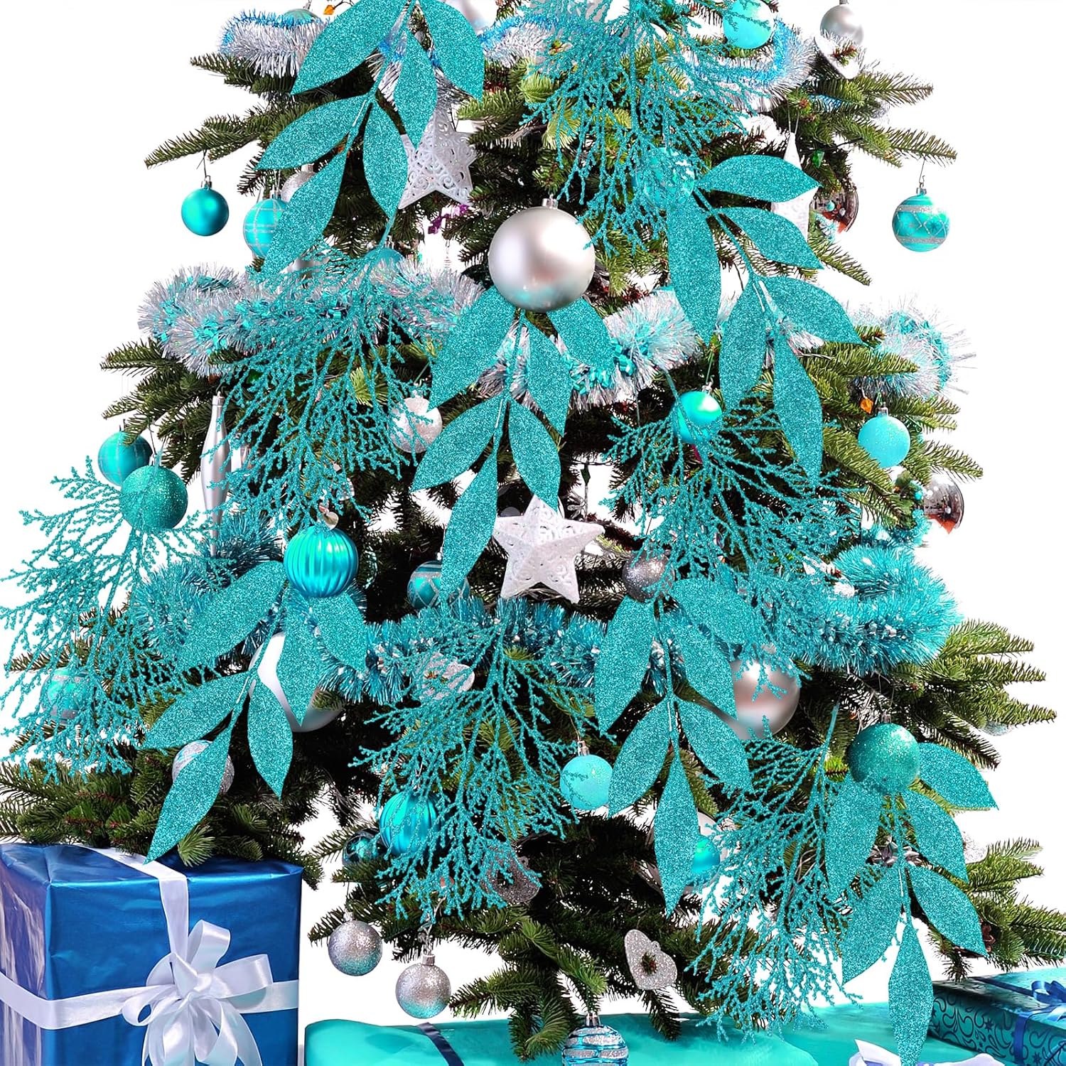 Winlyn 30 Pcs Christmas Teal Blue Glittered Artificial Leaf Sprays Cedar Picks Christmas Tree Ornaments Winter Floral Stems for Teal Blue Christmas Tree Wreath Centerpiece Holiday Wedding Decorations