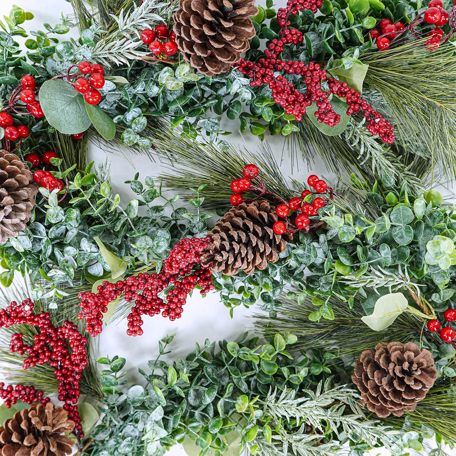 Winlyn 6' Long Artificial Eucalyptus and Pine Christmas Garland with Pine Cones Red Berries Pine Needles Winter Greenery Garland Christmas Season Holiday Wedding Table Runner Centerpiece Mantel Decor
