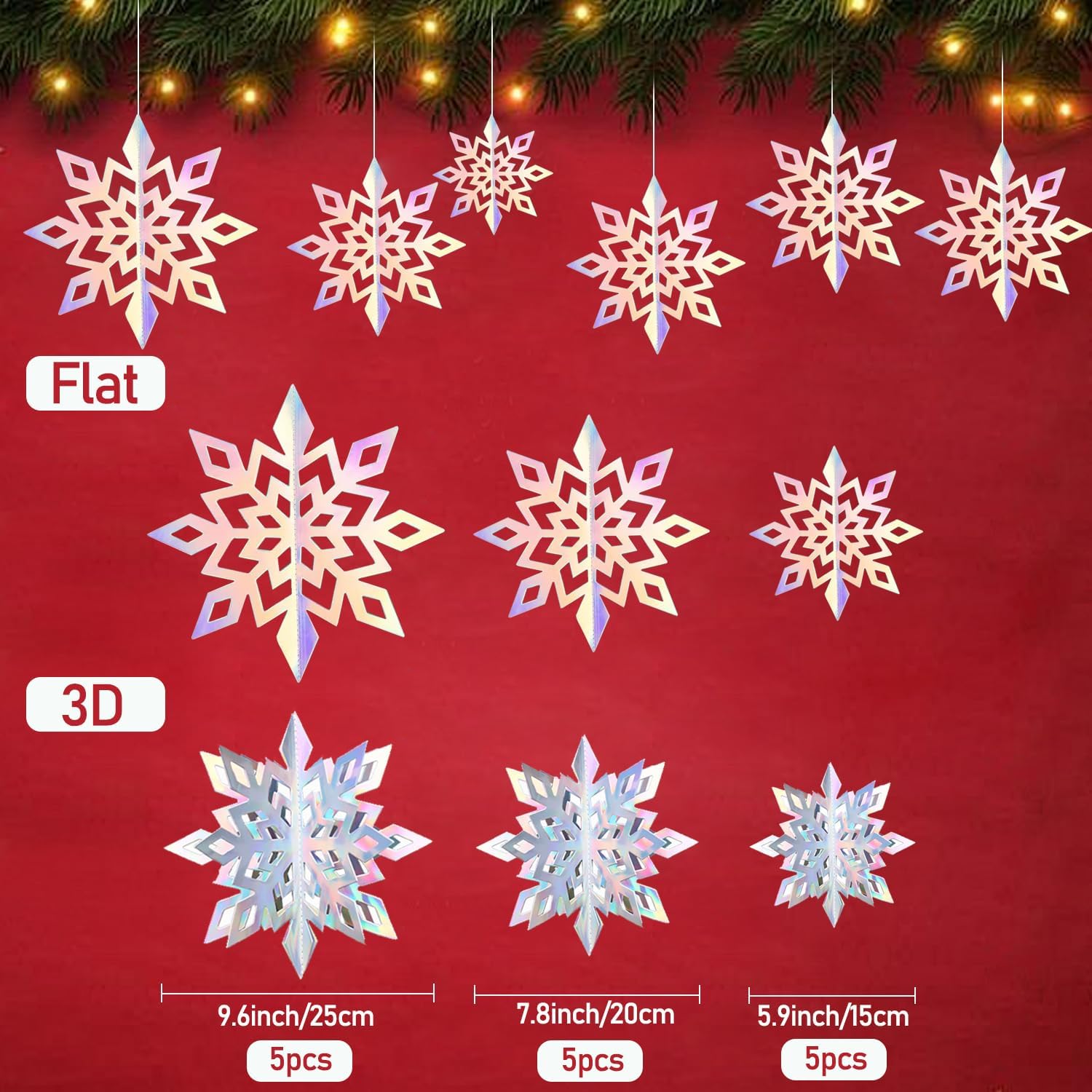 Winter Christmas Hanging Snowflake Decorations 15Pcs, 3D Iridescent Paper Snowflakes Rainbow Snow Flakes Garland for Winter Wonderland Holiday Frozen Christmas Birthday Party Home Decorations