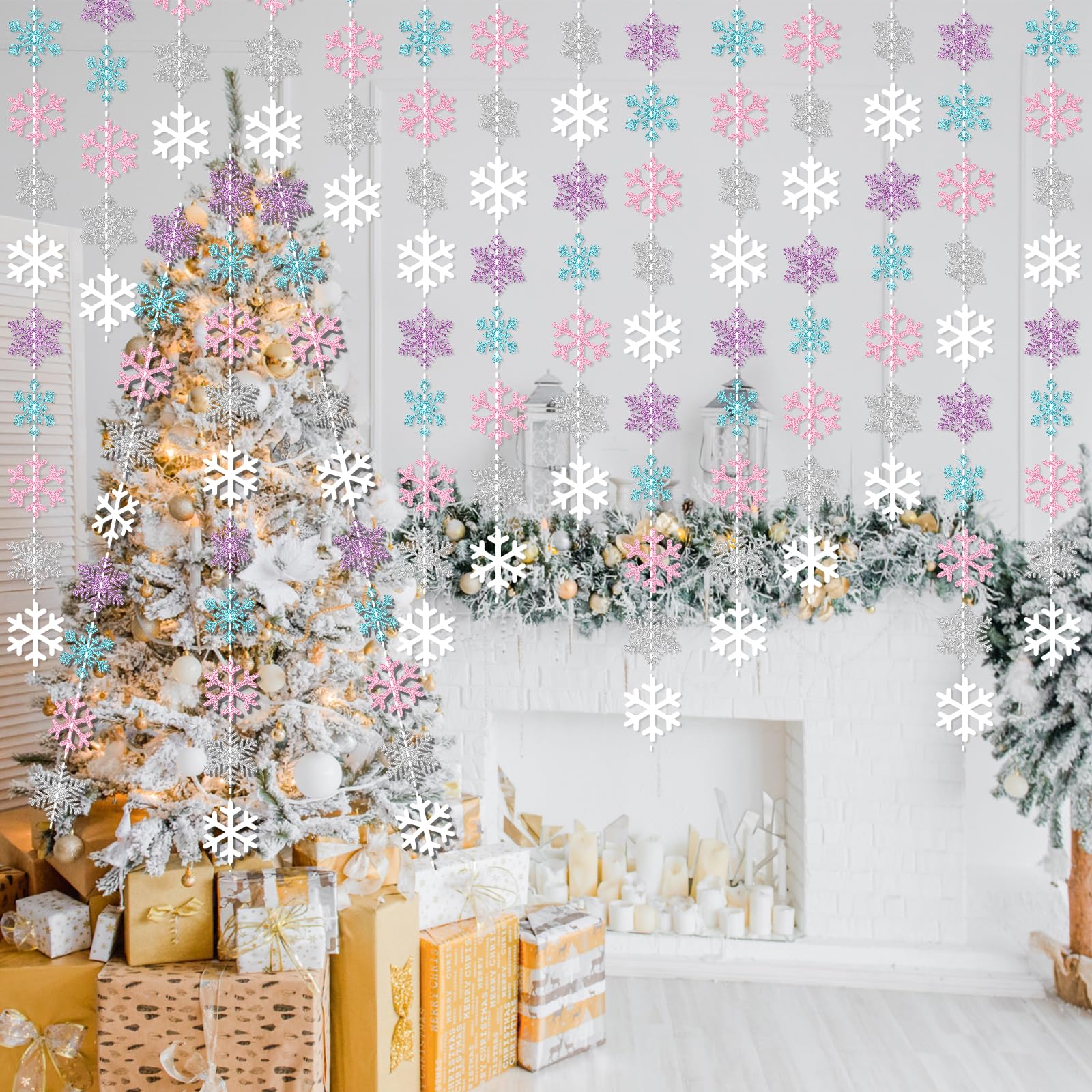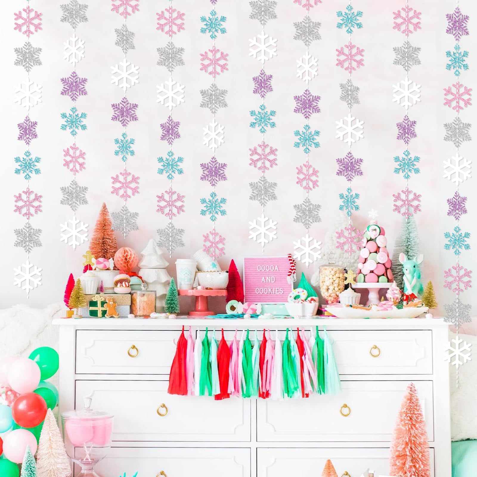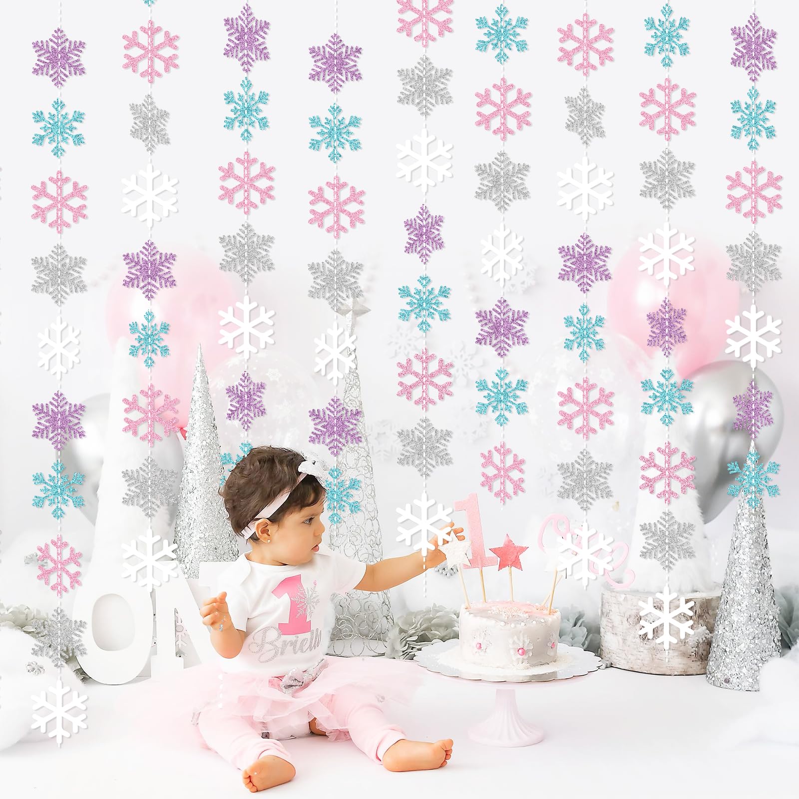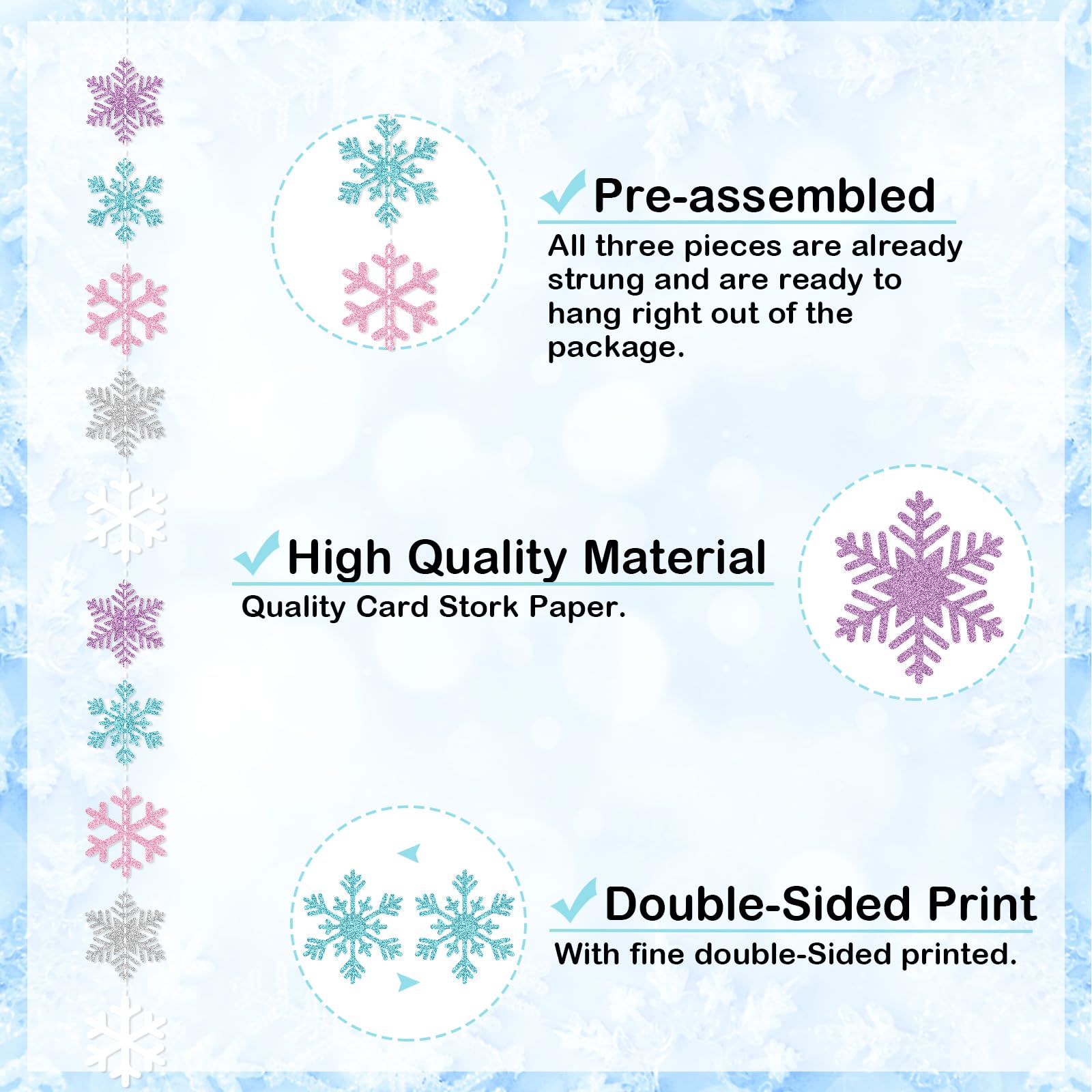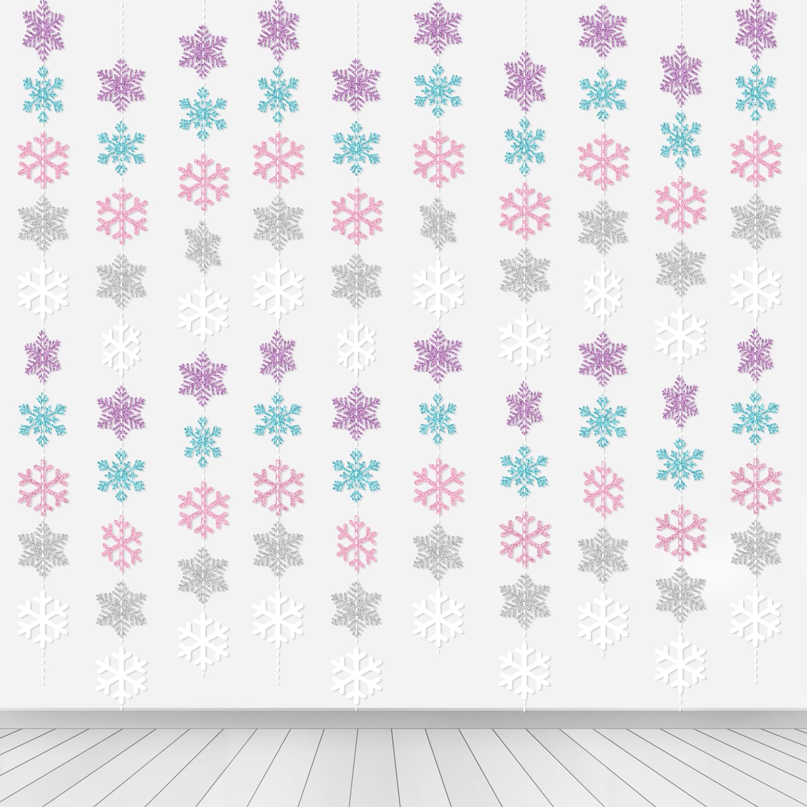 Winter Snowflake Hanging Decorations, Glitter Purple Pink Silver Christmas Snowflakes Hanging Garland Frozen Party Decorations for Winter Wonderland Baby Shower Frozen Birthday Party Decorations