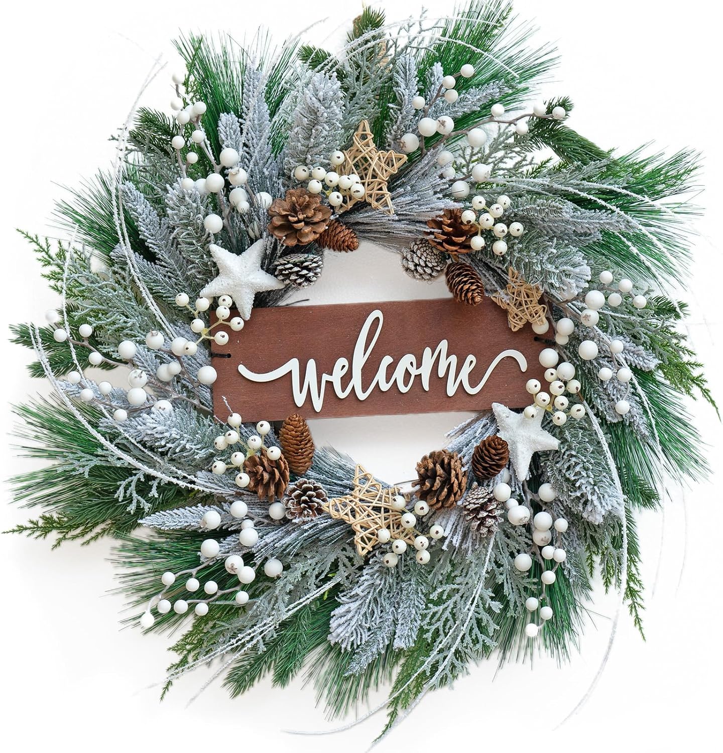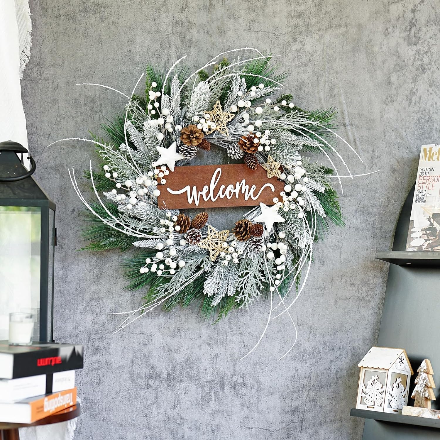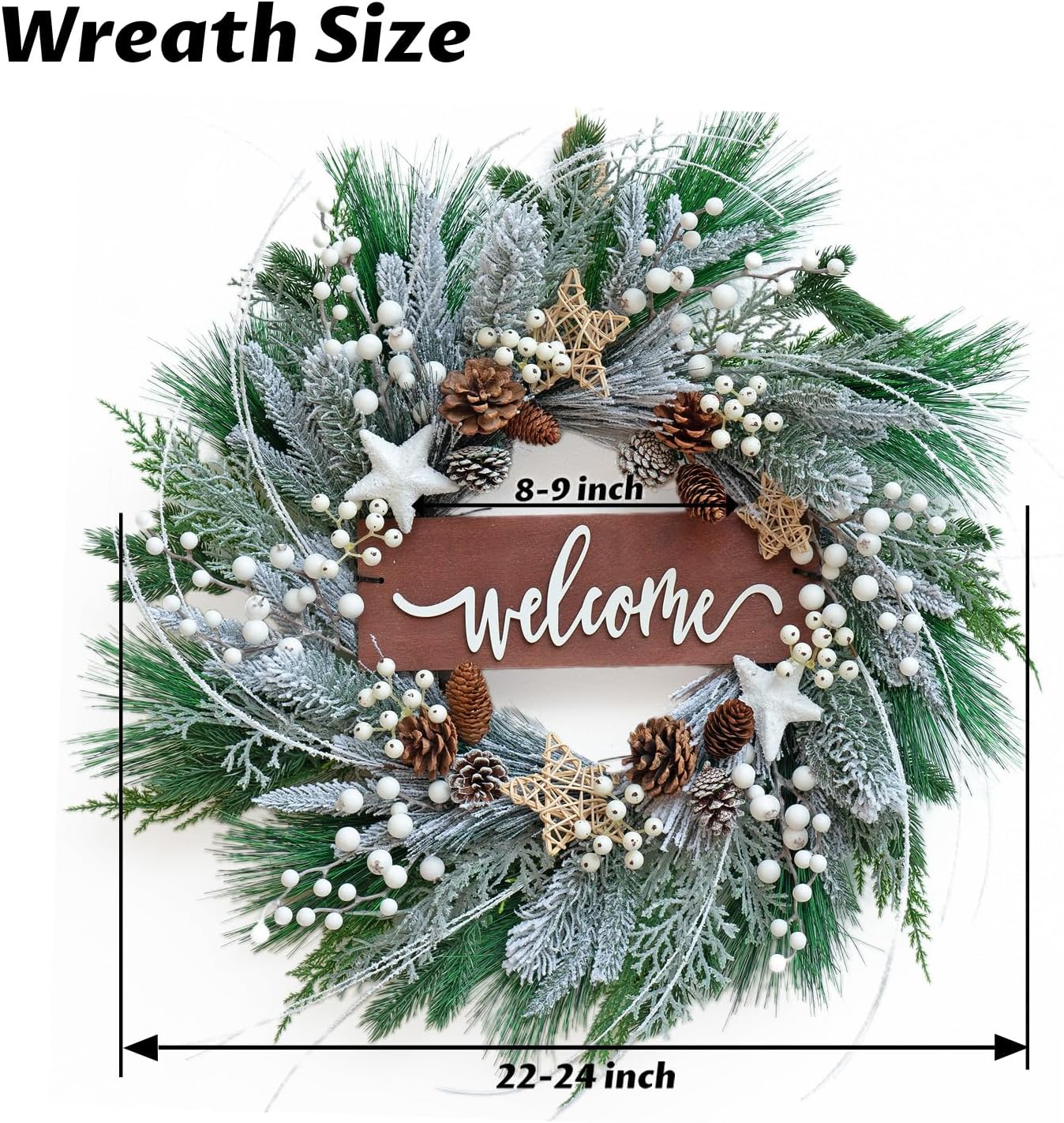 Winter Wreaths for Front Door 24 Inch Outdoor Christmas Snow Covered Wreath Artificial Flocked Spruce Wreath with Pinecones,White Berries,Green Evergreen Xmas Holiday Welcome Wreath Decor
