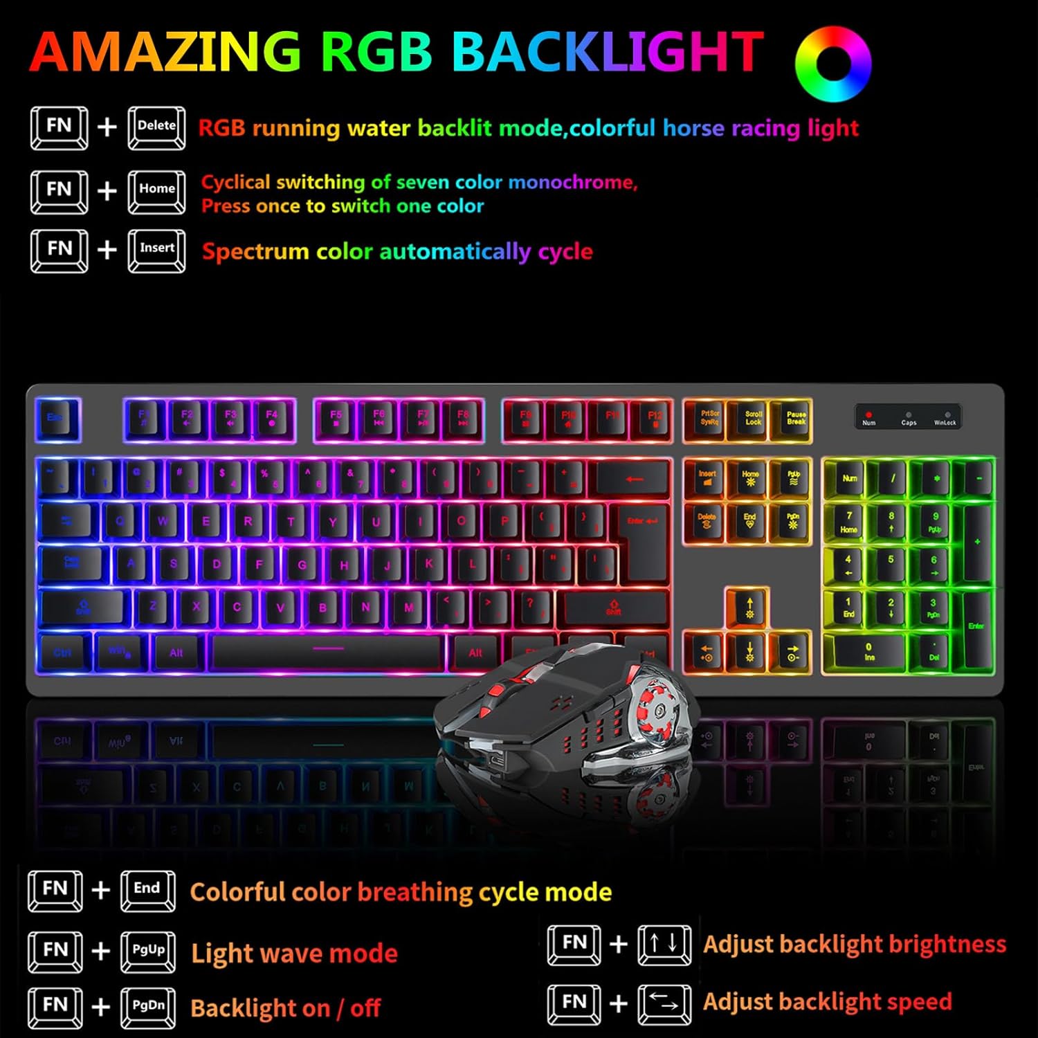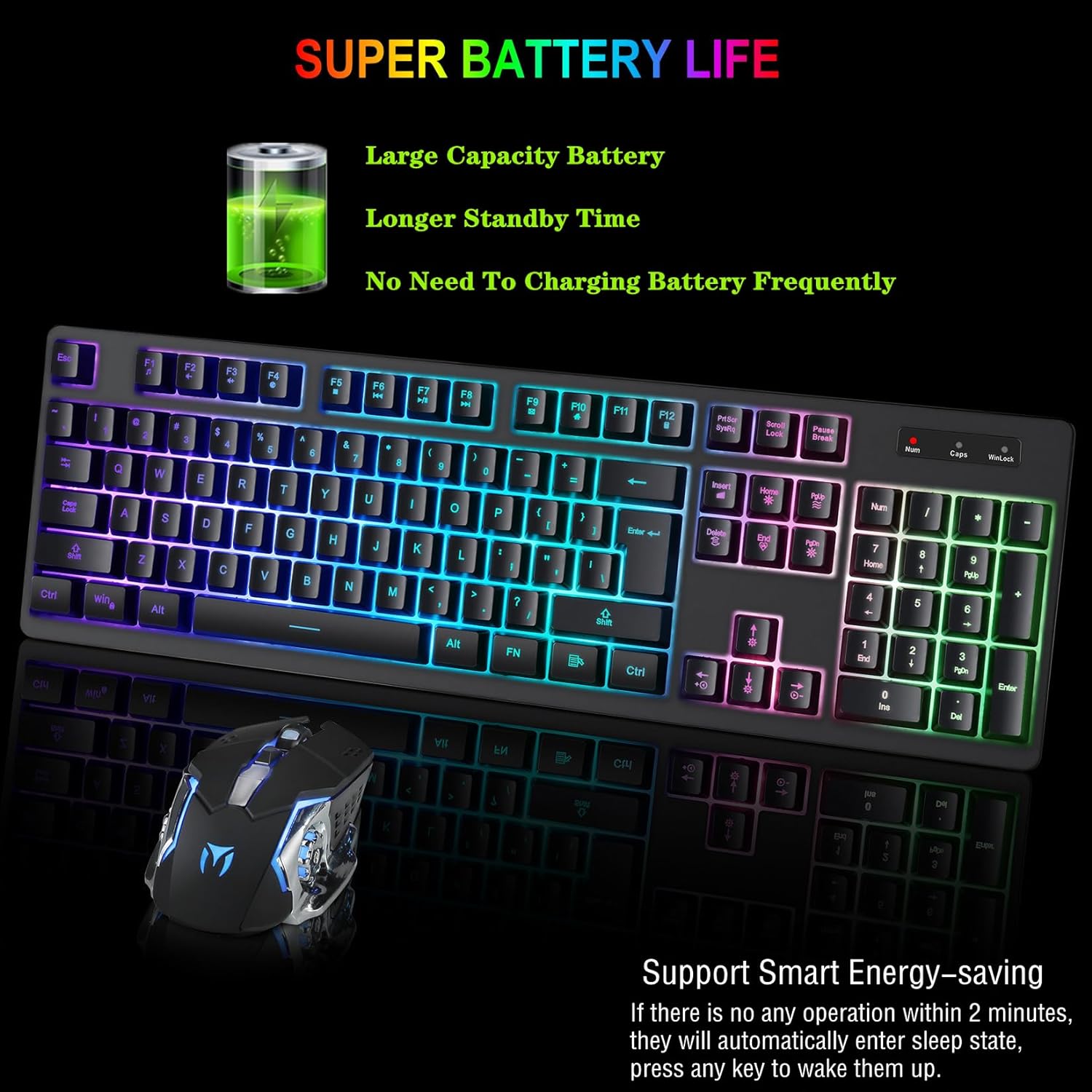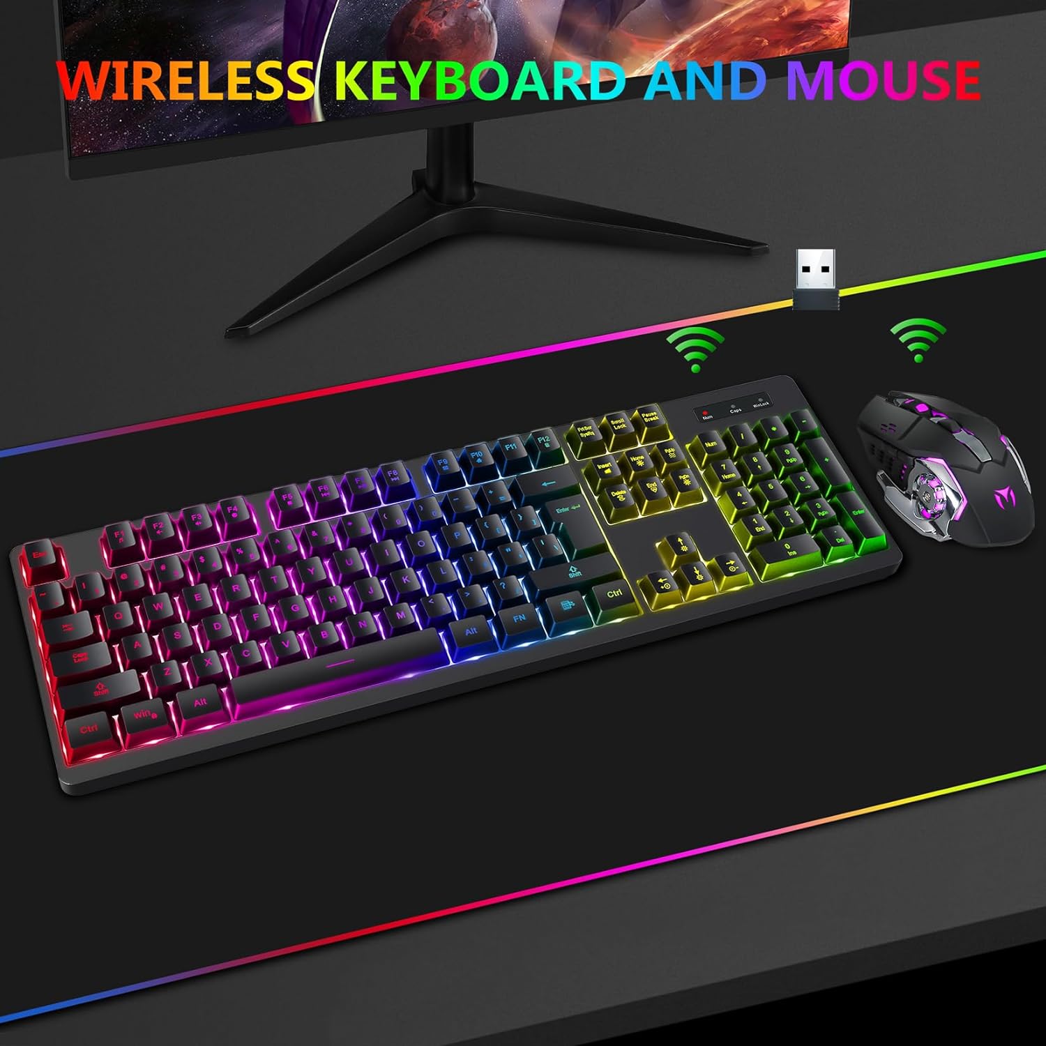 Wireless RGB Gaming Keyboard and Mouse - Rechargeable RGB Backlit Keyboard Mouse Long Battery Life,Mechanical Feel Gaming Keyboard with 7 Color Wireless Gaming Mouse for PC Game and Work
