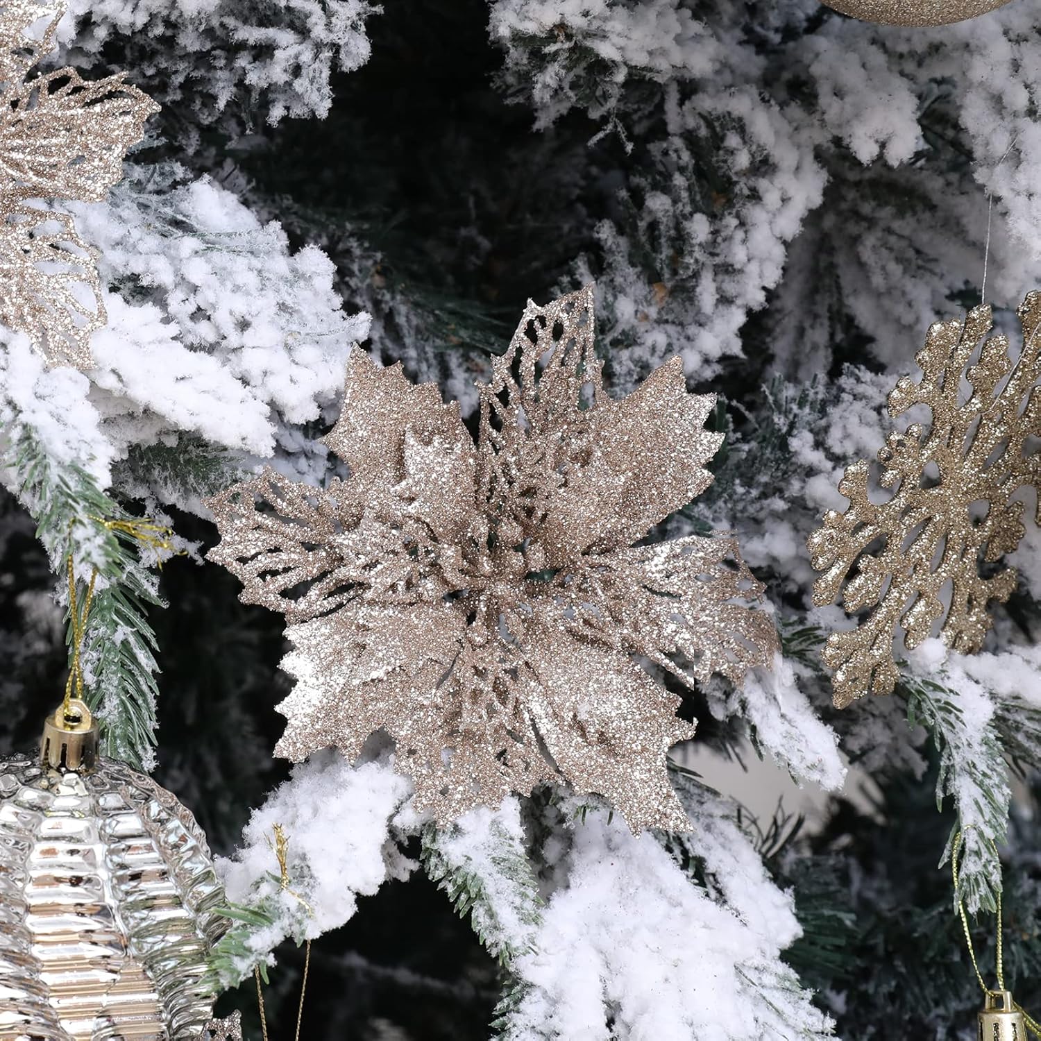 Wironlst 16 Pcs Glitter Poinsettia Flowers Artificial - Christmas Champagne Poinsettia Decorations Tree Flowers Ornaments for Xmas/Holiday/Seasonal/Wedding Decor
