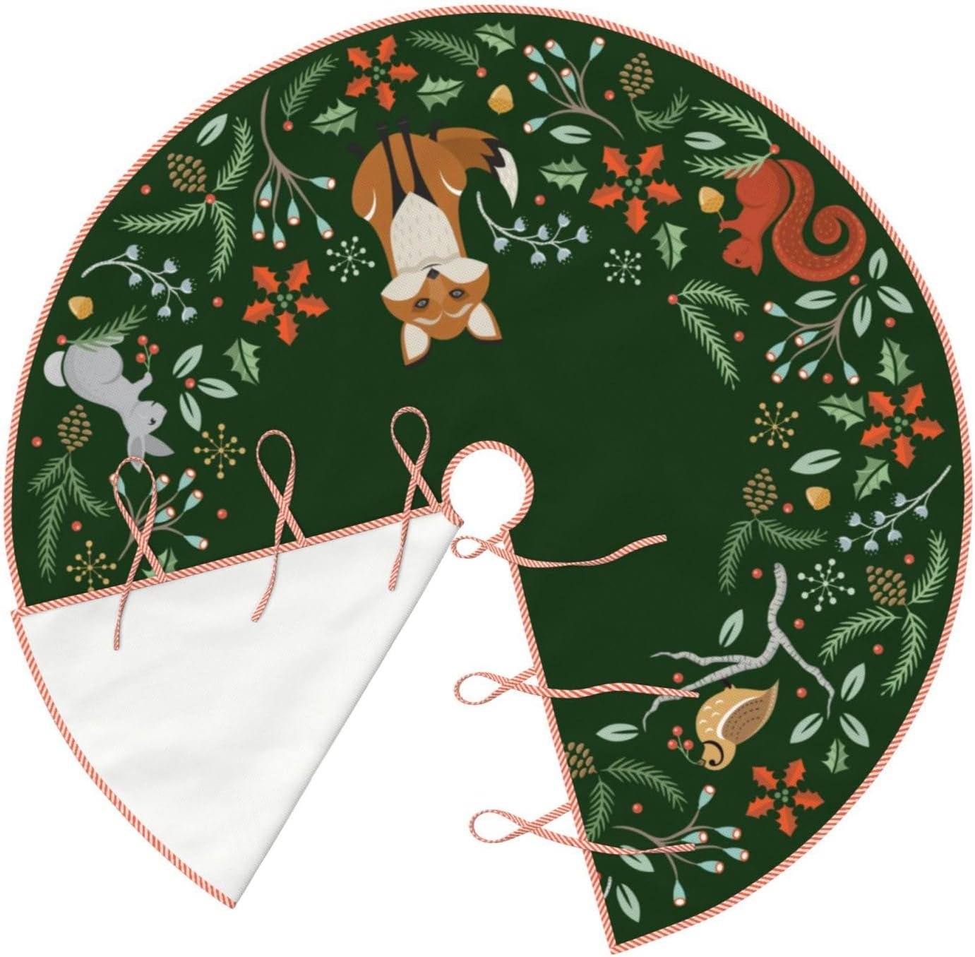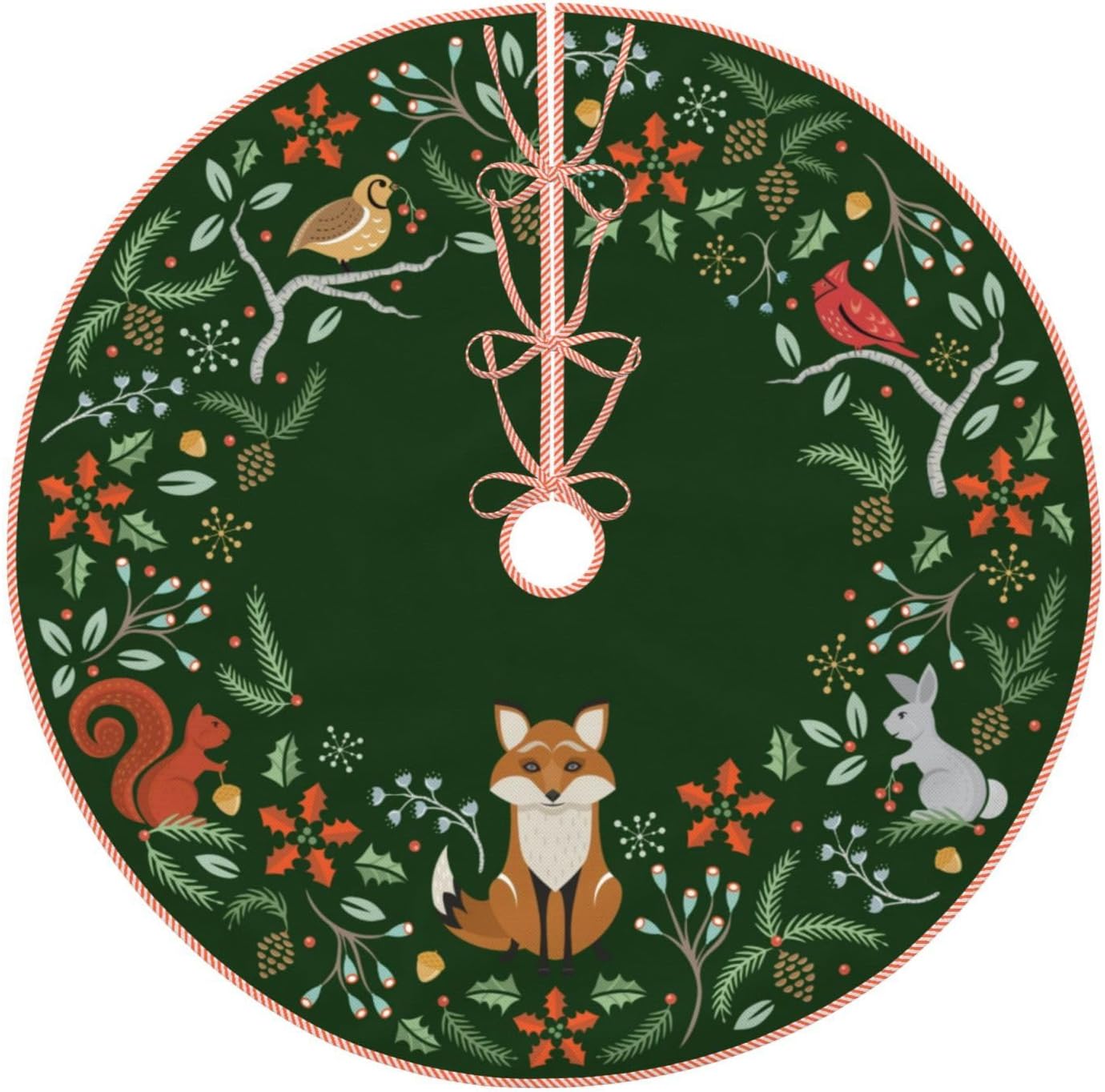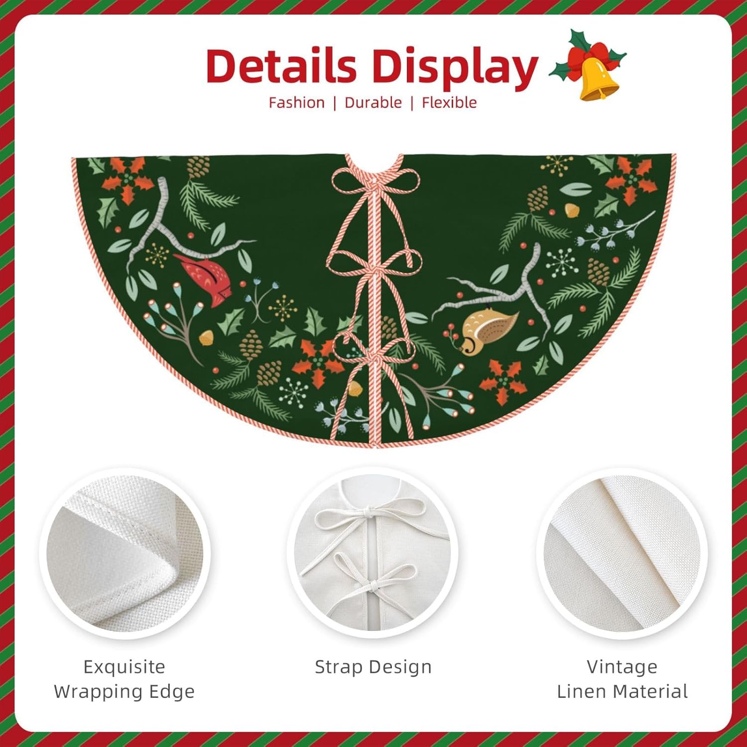 Woodland Wreath Holly Green Christmas Tree Skirt, Linen Xmas Tree Skirts Mat for Holiday Party Decorations Supplies Rustic Mini Tree Skirt - 36 Inches