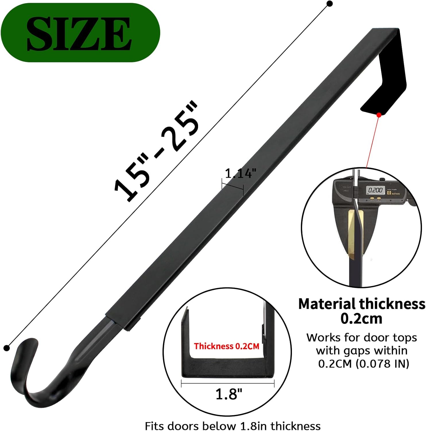 【Wreath Hanger】Adjustable wreath hanger for front door from 15-25 inches, hanger width 1.14 inch, Over the door width 1.8inch, fits the doors below 1.8inch thick, sleek metal, heavy duty design can hold 20lb. Best Christmas for family and friends.【Considerate Design】Christmas wreath hanger, no issues with opening or closing the door, just hang over your front or back door, no screwing, the metal hook thickness over the door is only 0.078 inch, ultra thin to shut the door easily.