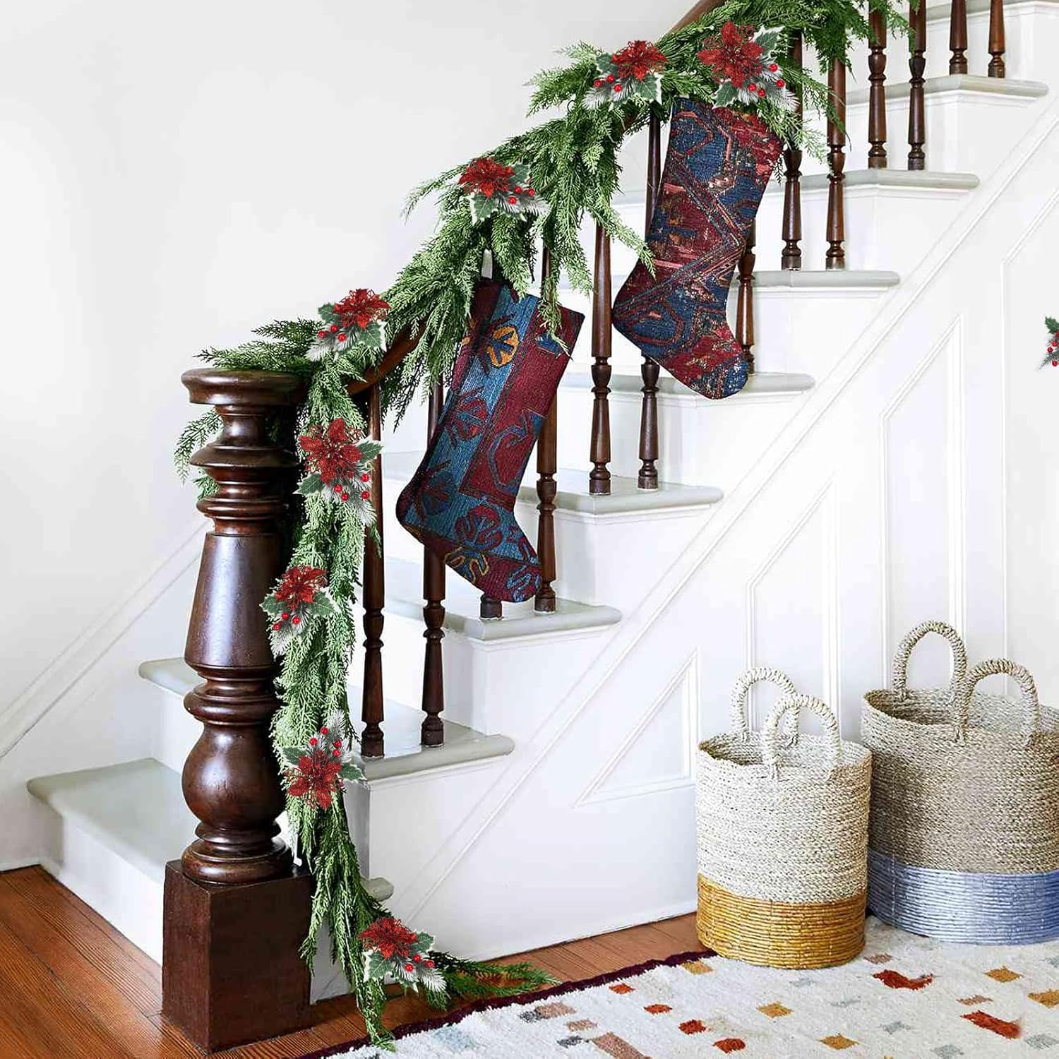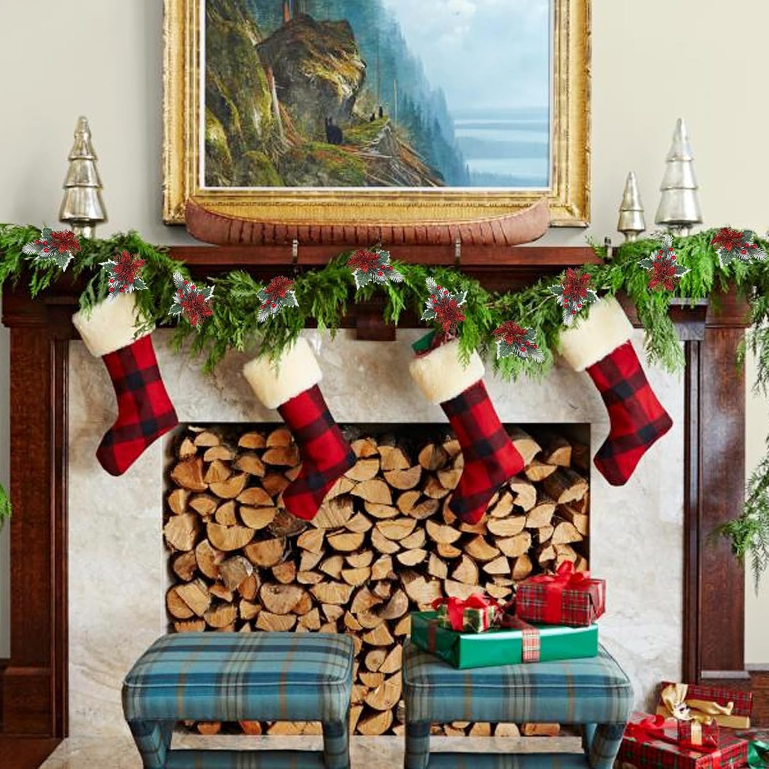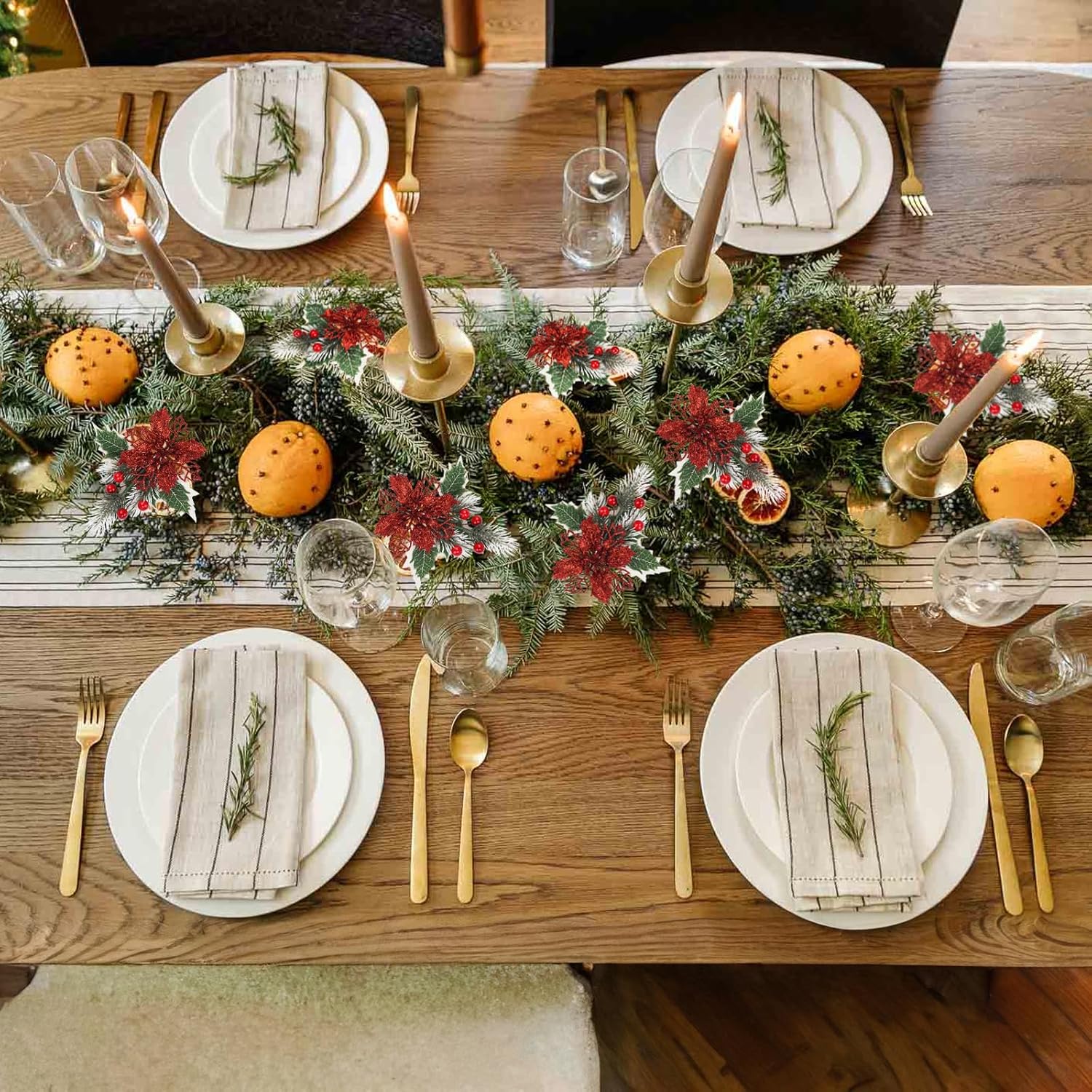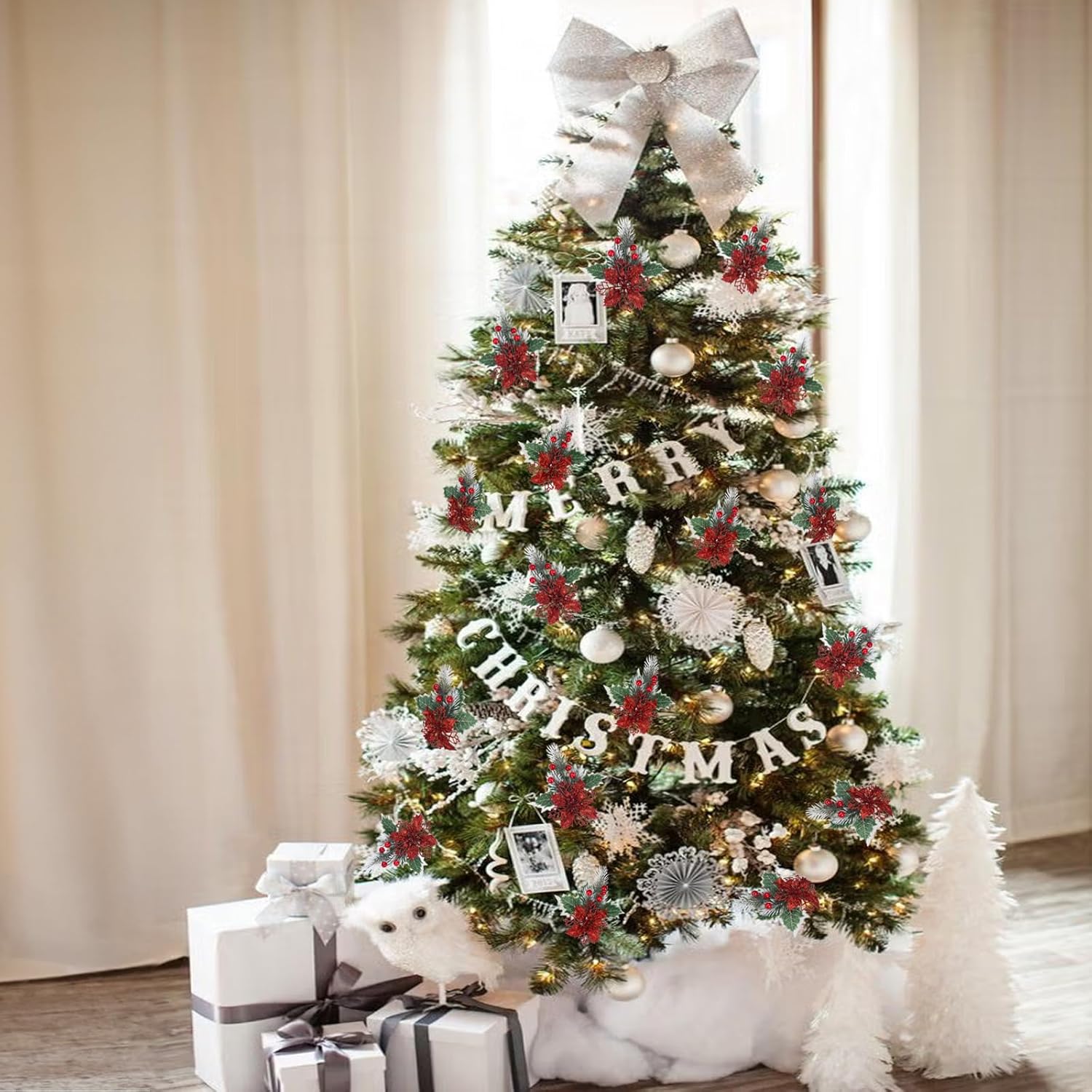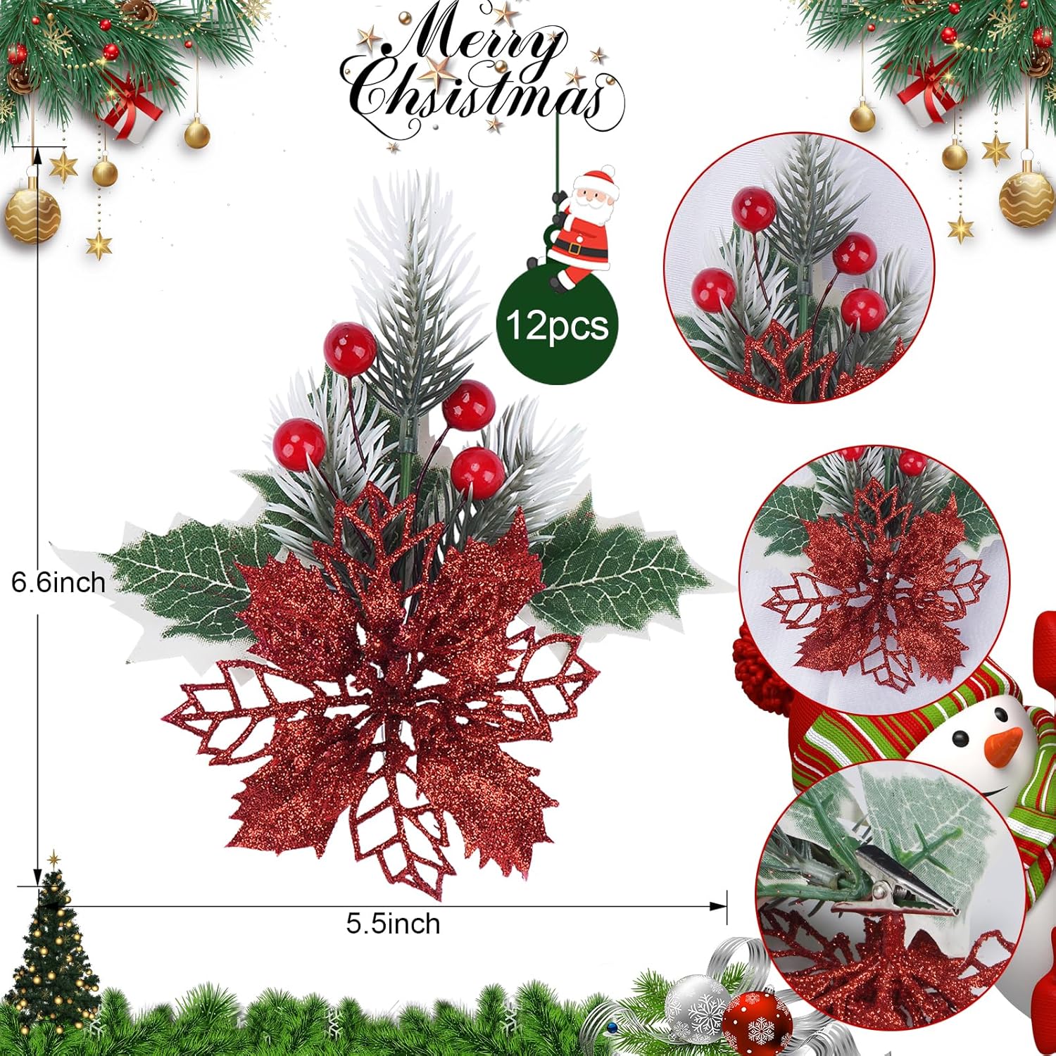 XHXSTORE 12PCS Christmas Artificial Flowers Glitter Red Berries Artificial Flowers Poinsettia Flowers with Clips for Xmax Christmas Wreath Wedding Home Party Garlands DIY Decor(6.6inch)