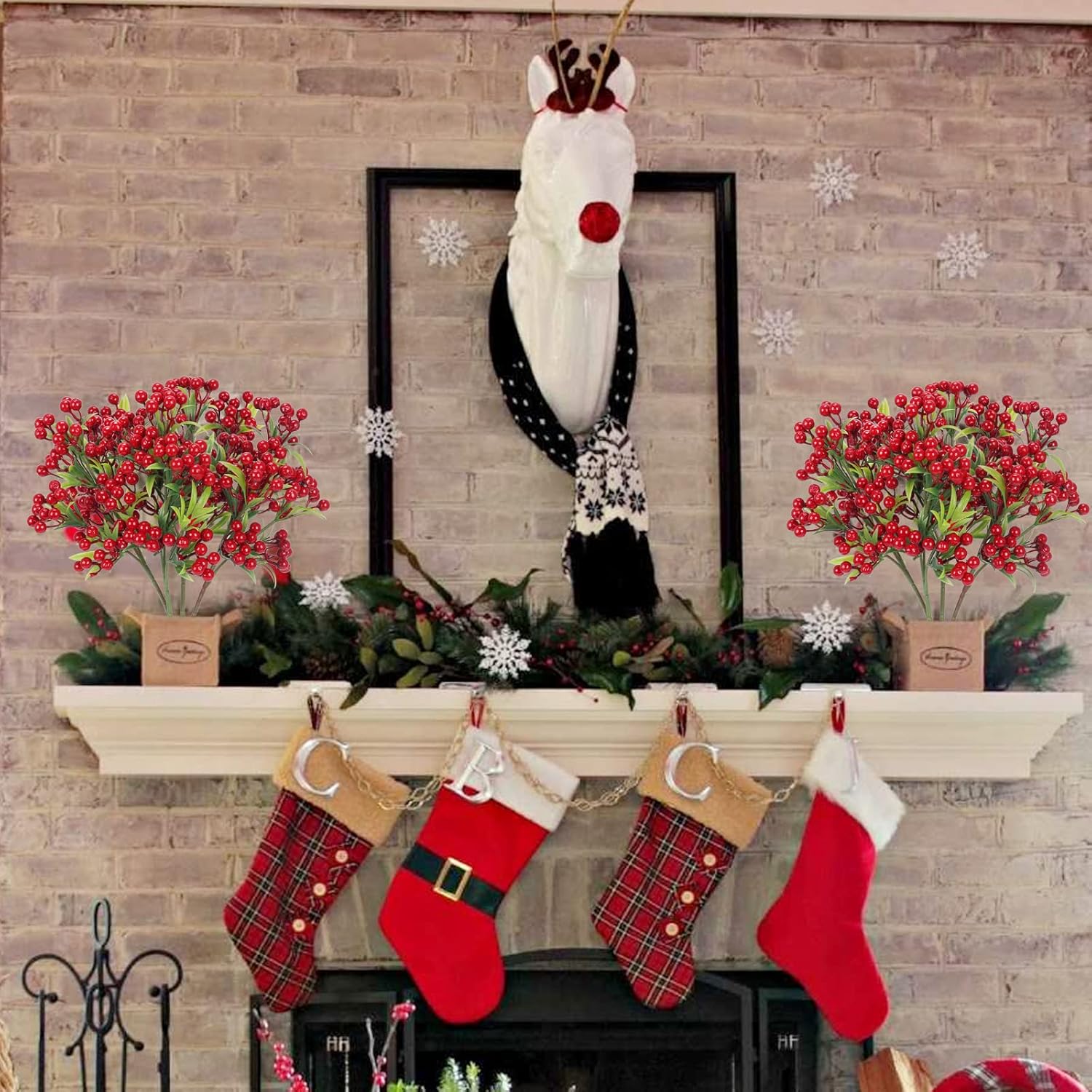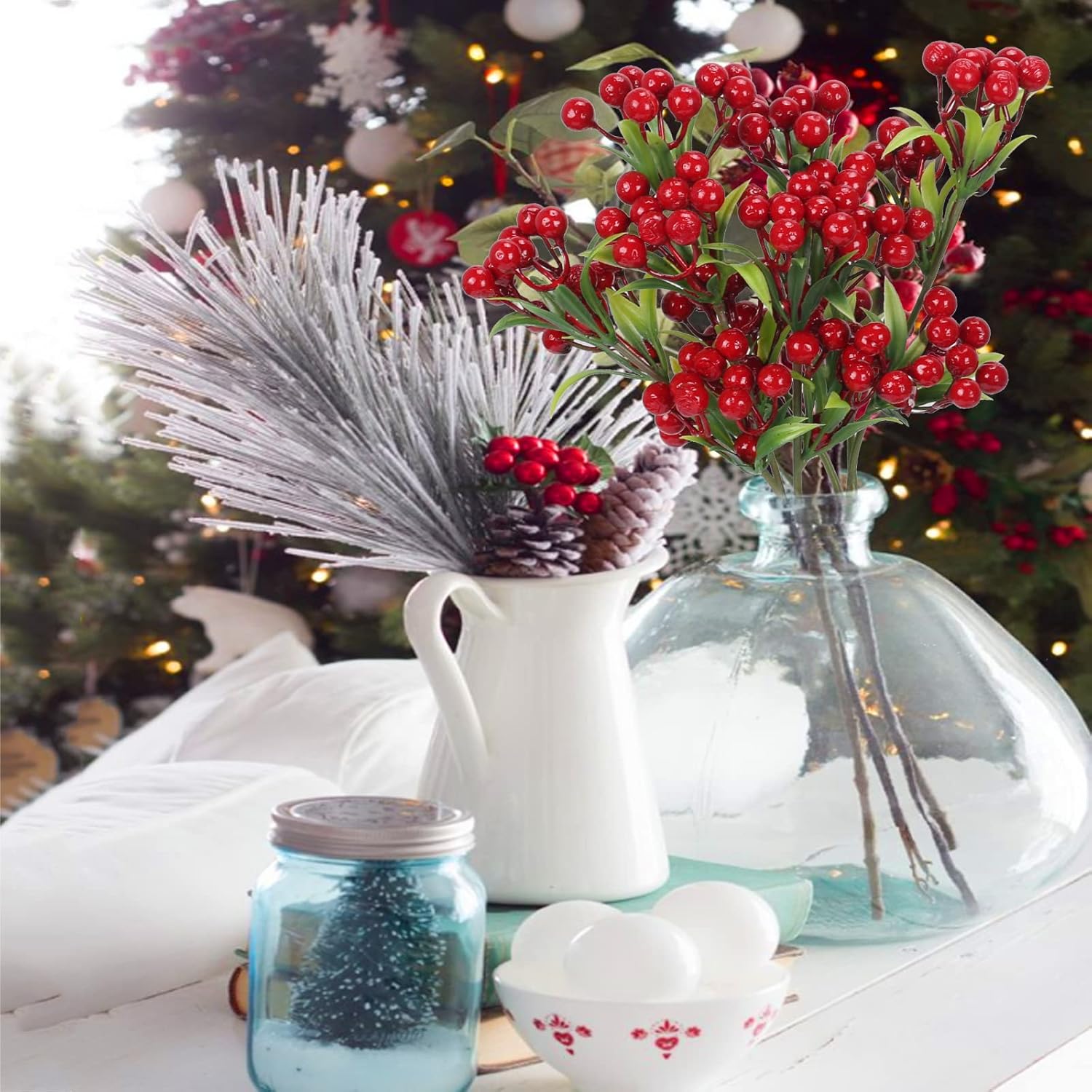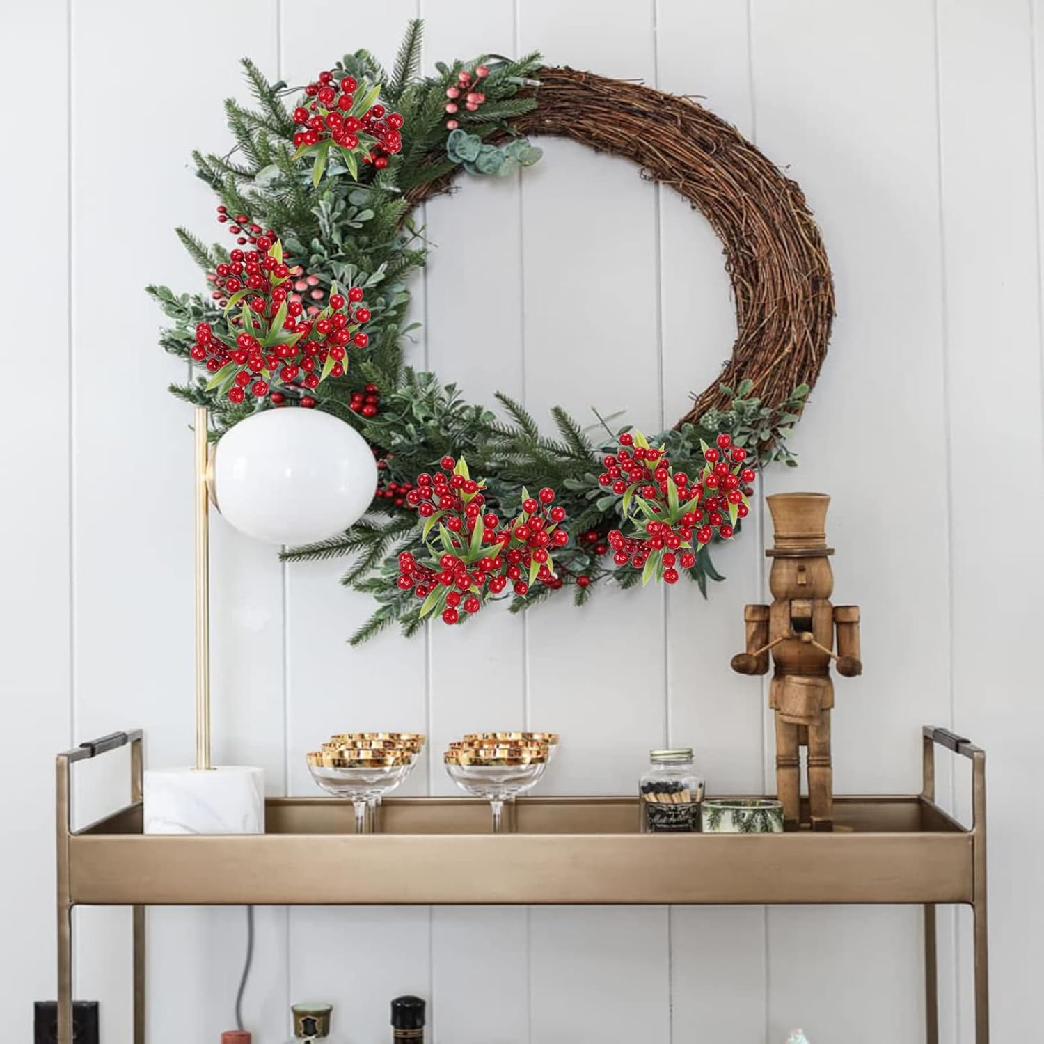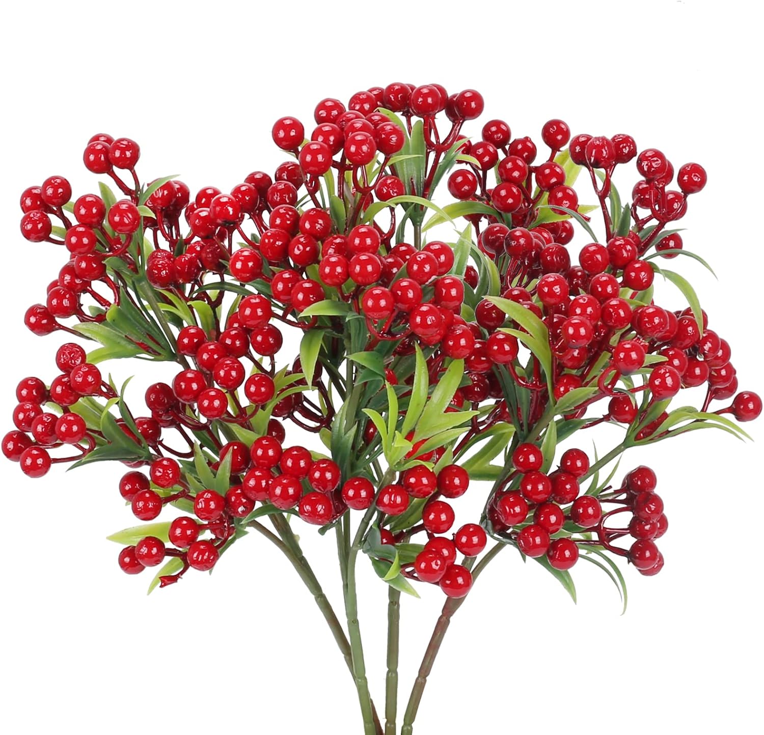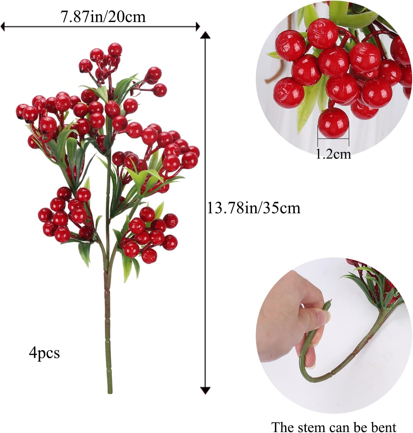 XHXSTORE 4Bundles Artificial Red Berries Christmas Greenery Stems Faux Burgundy Red Holly Berry with Green Leaves for Xmas Tree Home Wedding Flower Arrangement DIY Wreath Holiday Decor