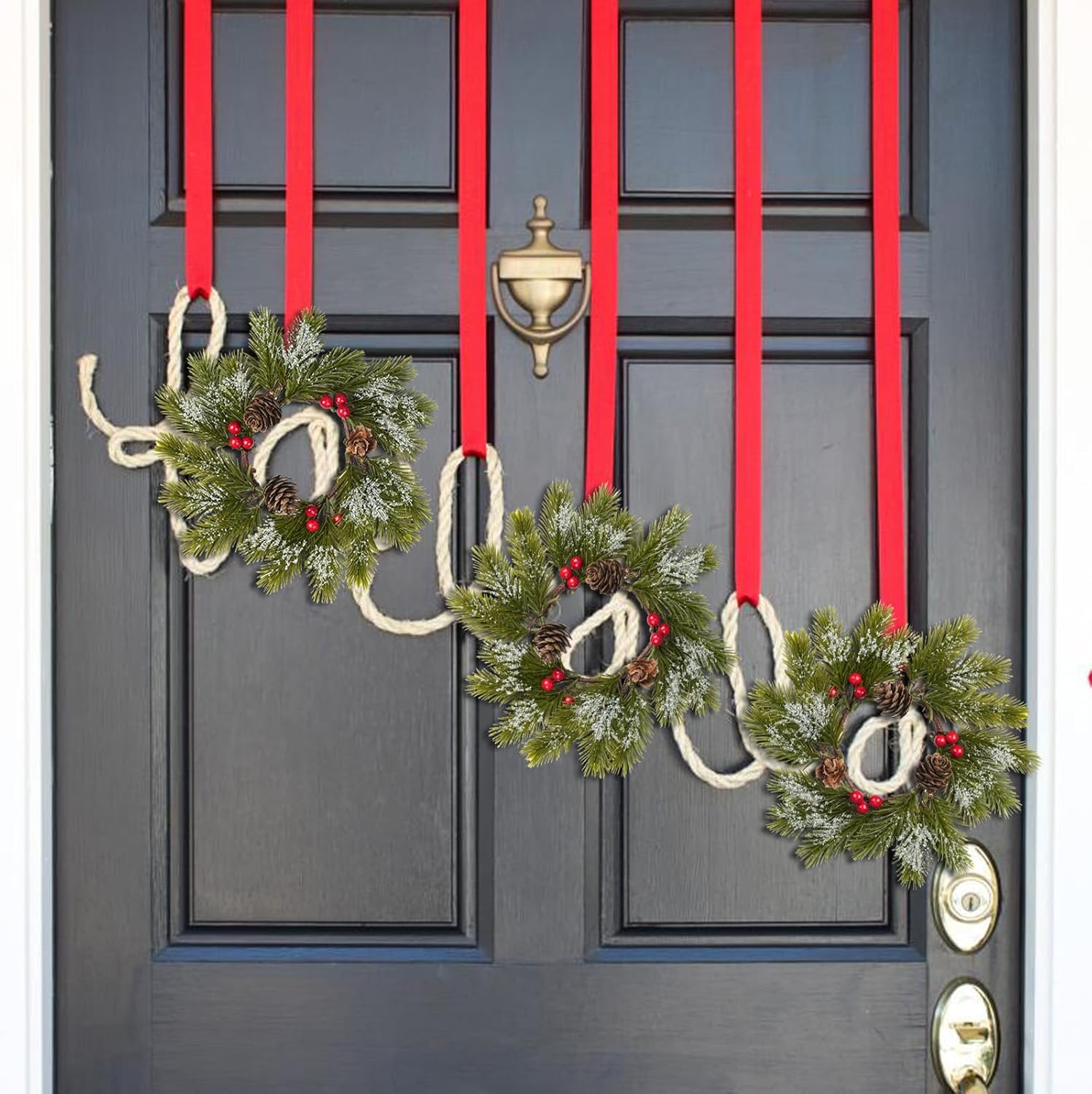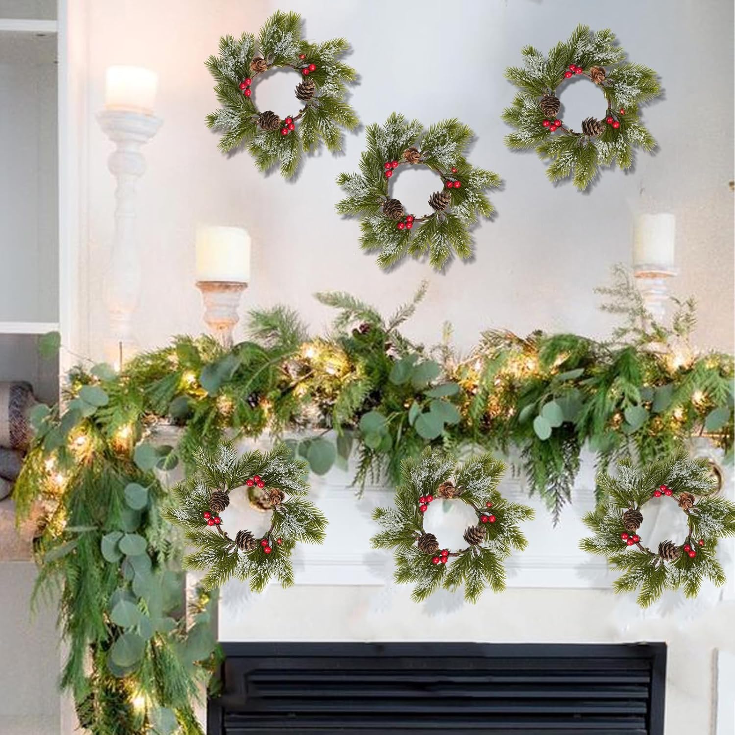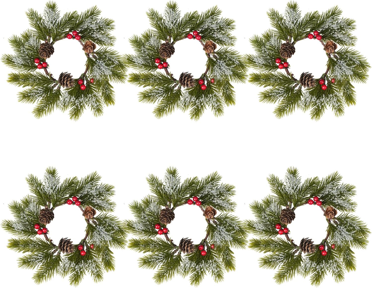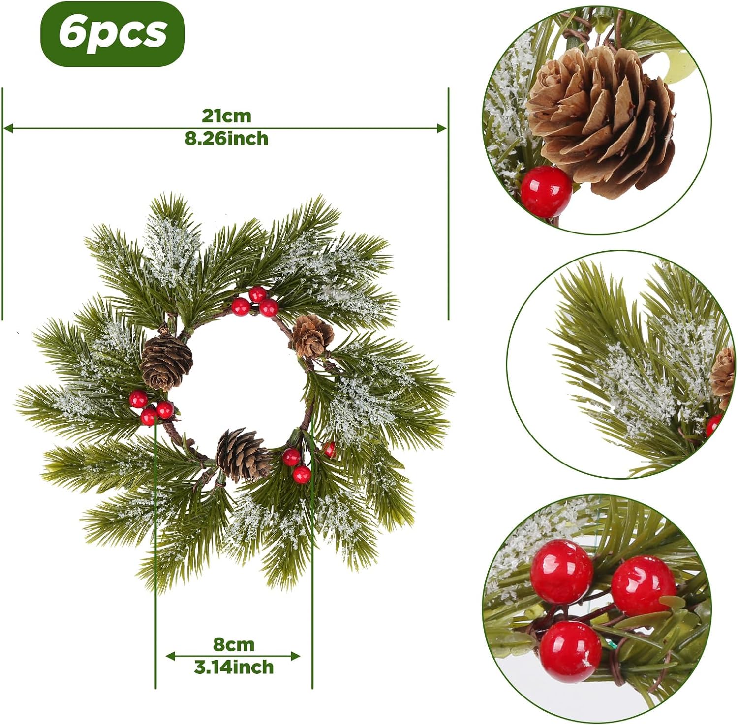 XHXSTORE 6PCS Christmas Candle Rings Christmas Small Wreath 8.26" Artificial Cedar with Pine Cones Farmhouse Wreath Artificial Snowflakes for Front Door Windows Centerpieces Tree Decorations
