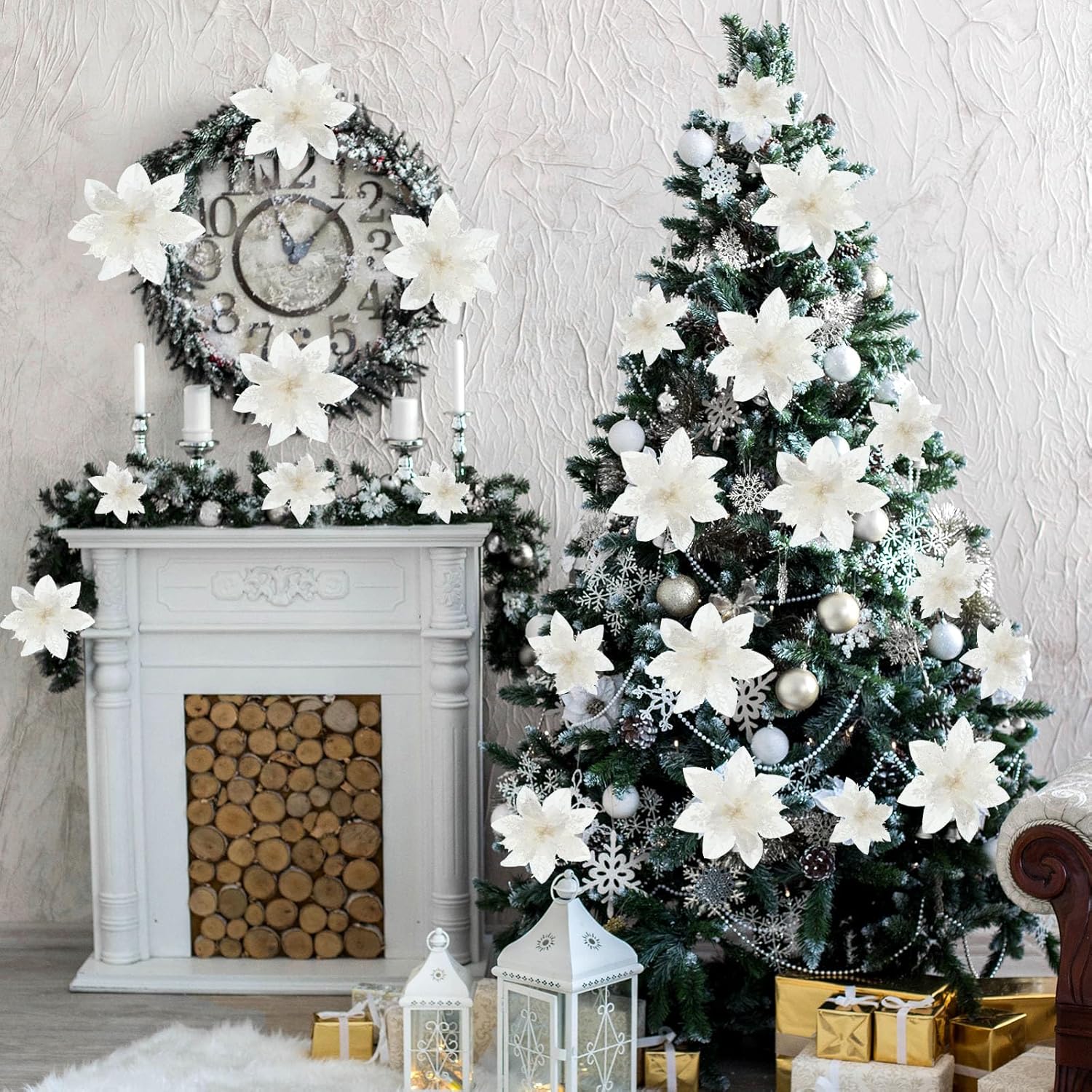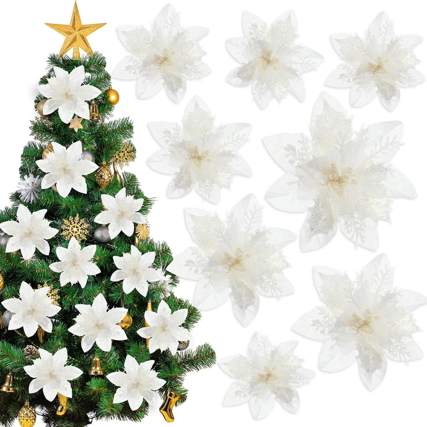 Xinnun 40 Pcs Christmas Tree Decorations 5.5 Inch Poinsettias Artificial Flowers Ornaments Xmas Flowers with Stems for Wedding Party Wreath Decoration Wedding Home(White)
