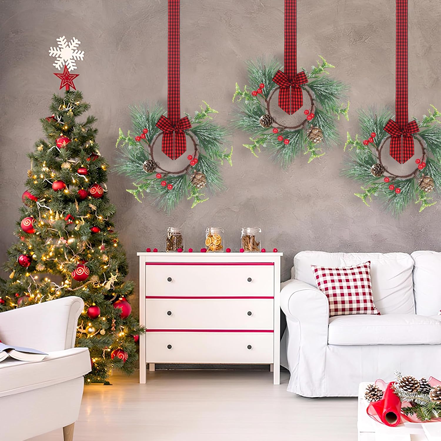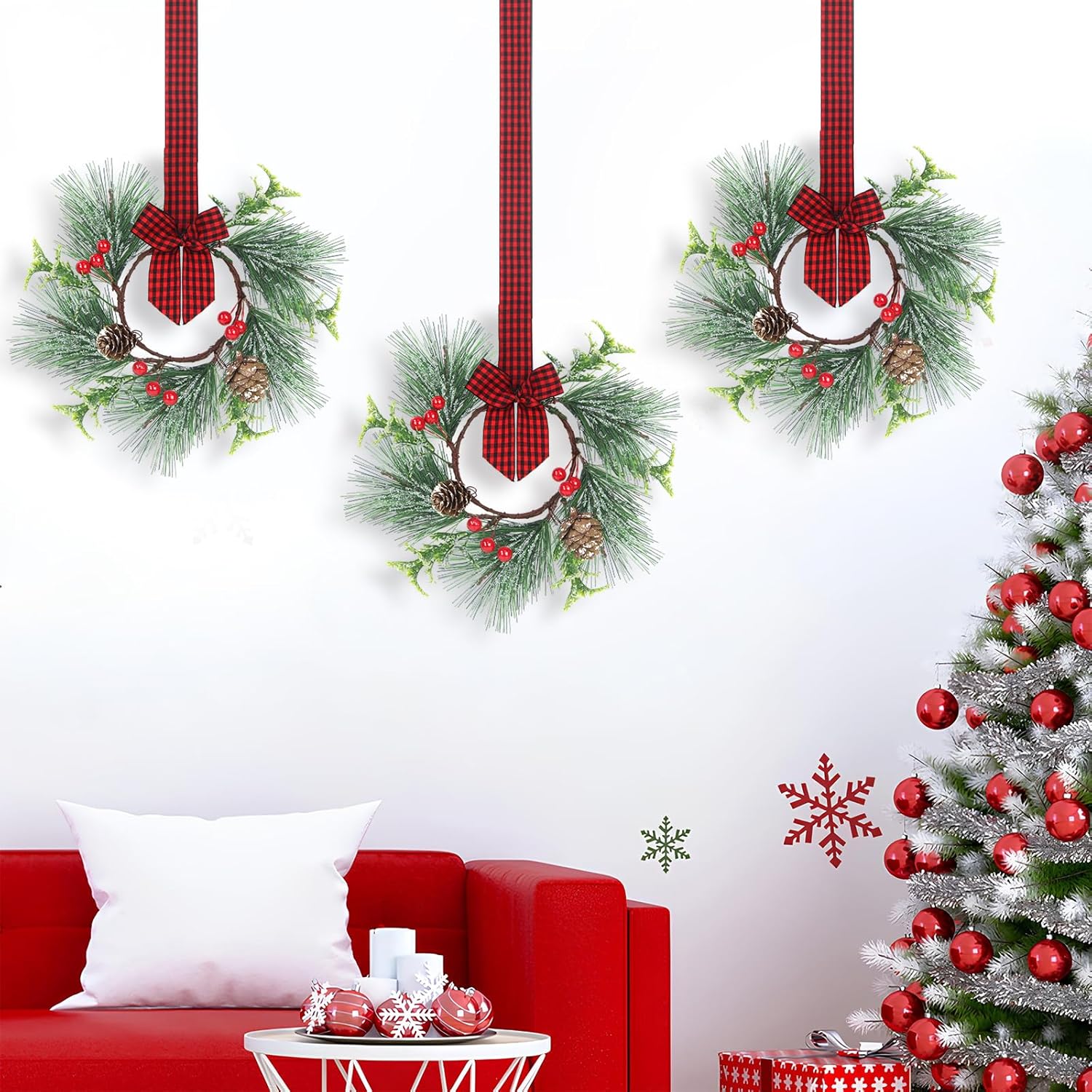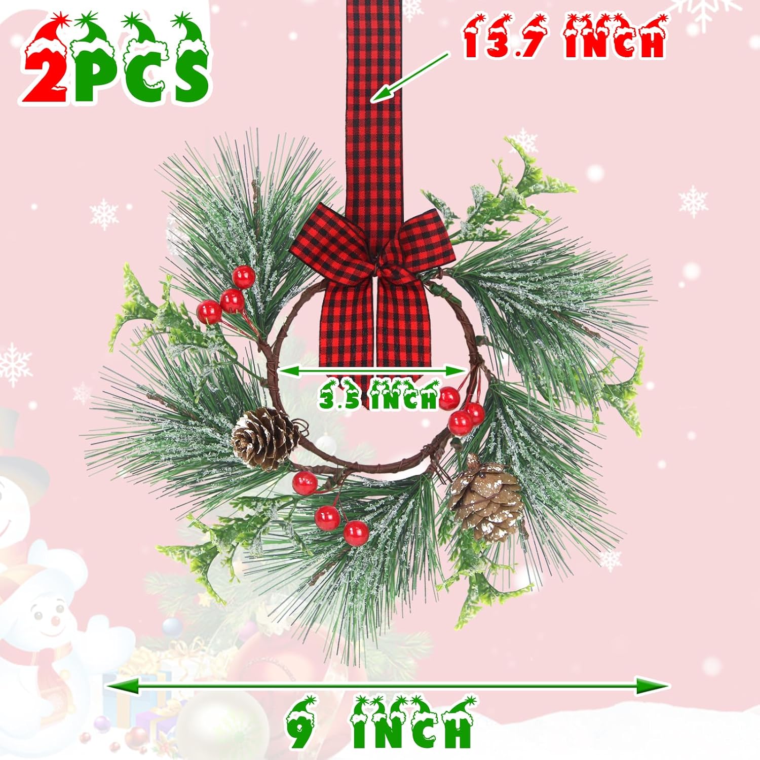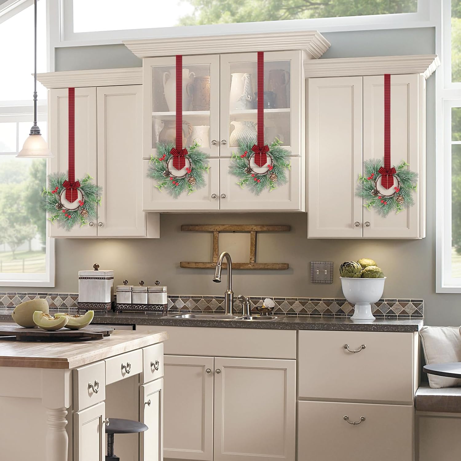Ideal Package: 6 Christmas wreaths, each wreath has an inner diameter of 3.5 inches and an outer diameter of 9 inches with a 13.7-inch long band. Our set of 6 Christmas Kitchen Wreaths are decorated with cedar needles, pine cones, berries and bows to add a touch of cheer to your kitchen cabinets.Durable Design: Our wreaths are carefully crafted with high quality materials, which can keep the bright colors, not easy to fade, sturdy and reliable, no maintenance, and sturdy coils ensure that the decoration won't fall off, and can be used for a long time.