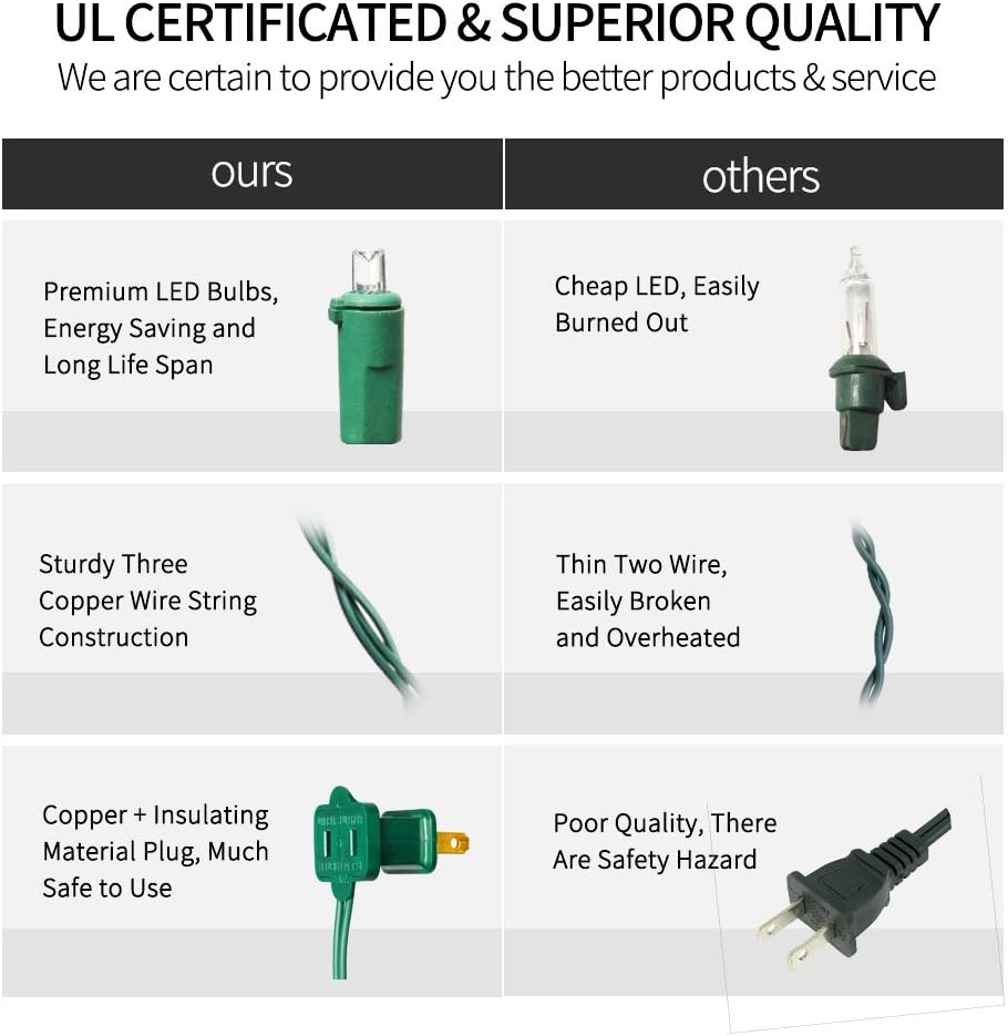 Safe And Reliable: SAFE AND RELIABLE: Our led string lights including string wire, LED bulbs and plug have been by UL to ensure & maximize the safety. Differ from other cheap string lights in the market that without UL certification or only plug with UL certification. Meets UL588 standard for safety of Holiday/seasonal decorative light, much safe to use. Version: Made up of 200 individual LED bulbs, If one bulb goes out the rest will stay light well(This item comes with 4 spare extra bulbs and 1 spare fuse to replace). But the most of old version string light in the market if one bulb goes out the one section of the string was not lit. Say goodbye to those lights that have poor quality and short life, don’t waste your time and money anymore.