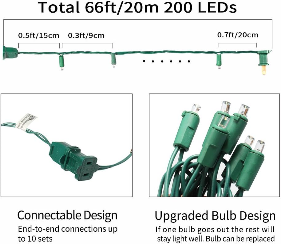 • End To End Expandable: One set total length in 20M/66FT 0.3FT Space between 2 LEDS Each Christmas string light has end-to-end connection that allows up to 10 strands connected together to illuminate a wider range. Perfect decorative lights for your patio, garden, deck, pergola, backyard, fence,bedroom, curtain etc.