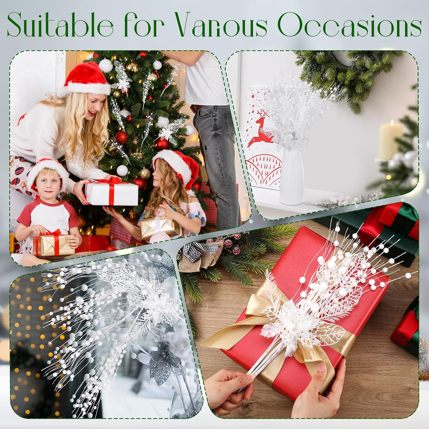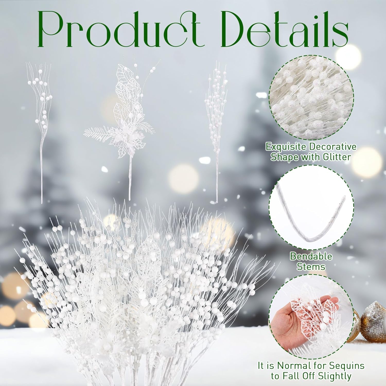 XunYee 60 Pcs Christmas Picks and Sprays for Tree,3 Styles Glitter Artificial Christmas Berry Stem Xmas Tree Filler Branch Ornaments Bead Stick for Christmas Tree Wreath Garland Decor(White)