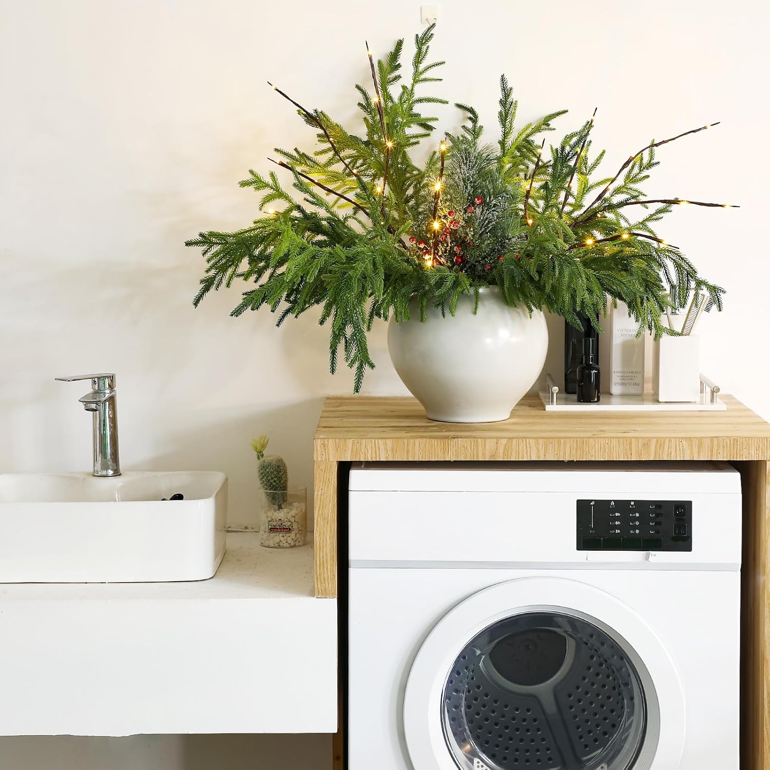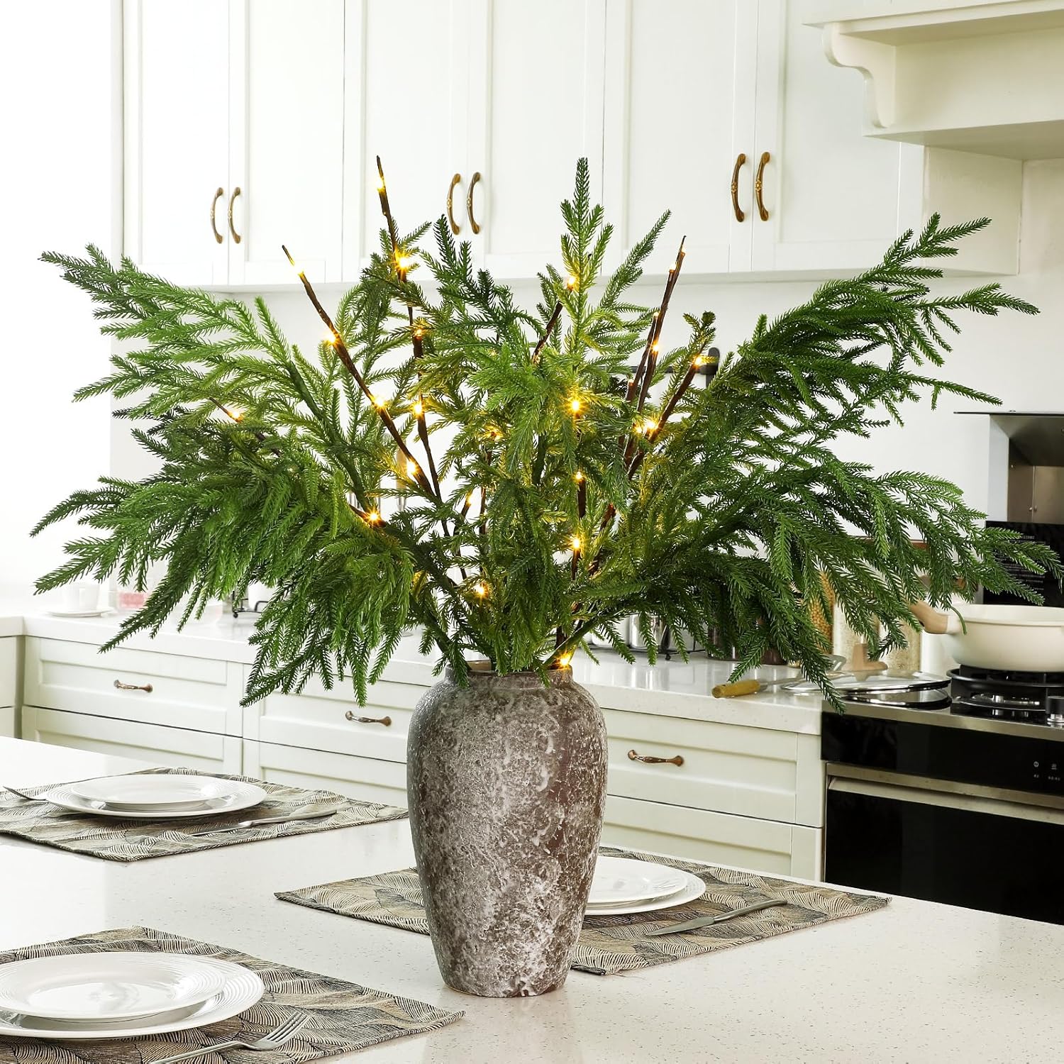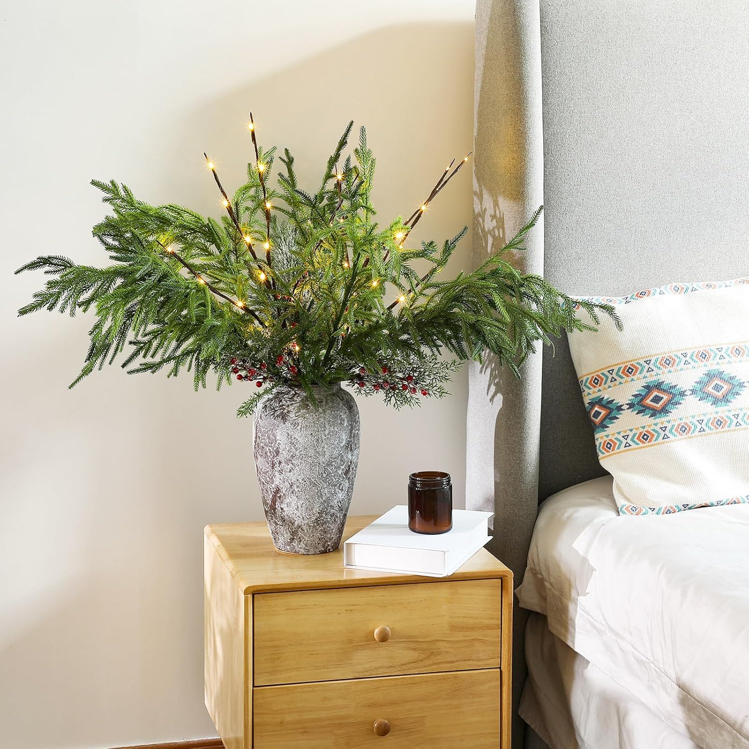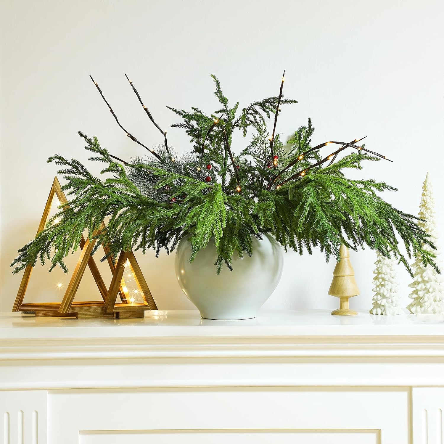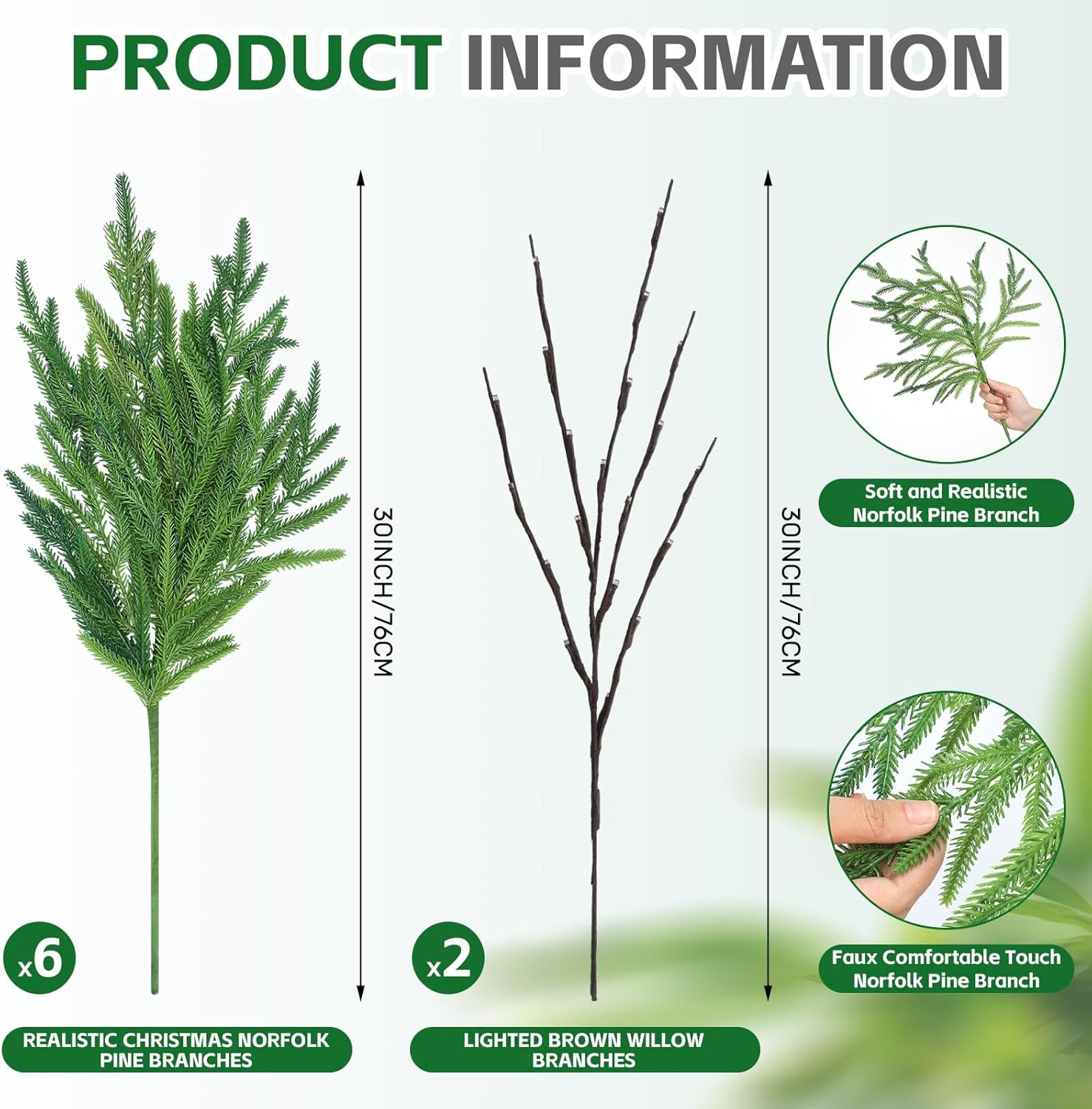 XunYee 8 Pcs 30" Christmas Pine Branches, 6 Pcs Christmas Norfolk Pine Branches Artificial Pine Stem 2 Pcs Lighted Brown Willow Picks DIY Craft Garland for Xmas Holiday Party Home Indoor Outdoor Decor